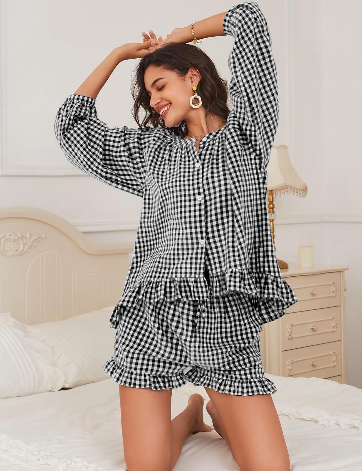 Get the Flygo Women Gingham 2 Piece Pajama Sets Y2K Plaid Ruffle Short Sets Raglan Sleeve Shirt Lounge Shorts Sleepwear with Pockets(Black) you want at a discounted price during our markdown sale event.