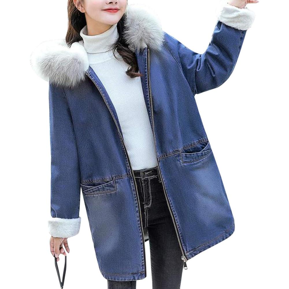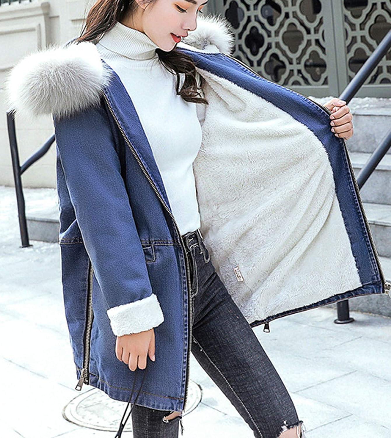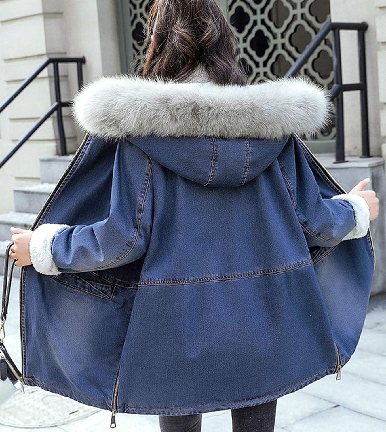 Flygo Women Thick Sherpa Fleece Lined Denim Trucker Jacket Hooded Jean Coat(Blue)