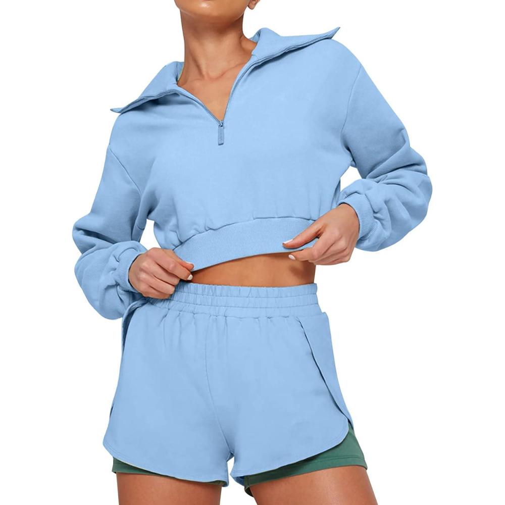 Flygo Women Two Piece Tracksuit Long Sleeves Sweatsuit Half Zip Crop Top Sexy Biker Shorts Jogging Outfit(Blue-XS)