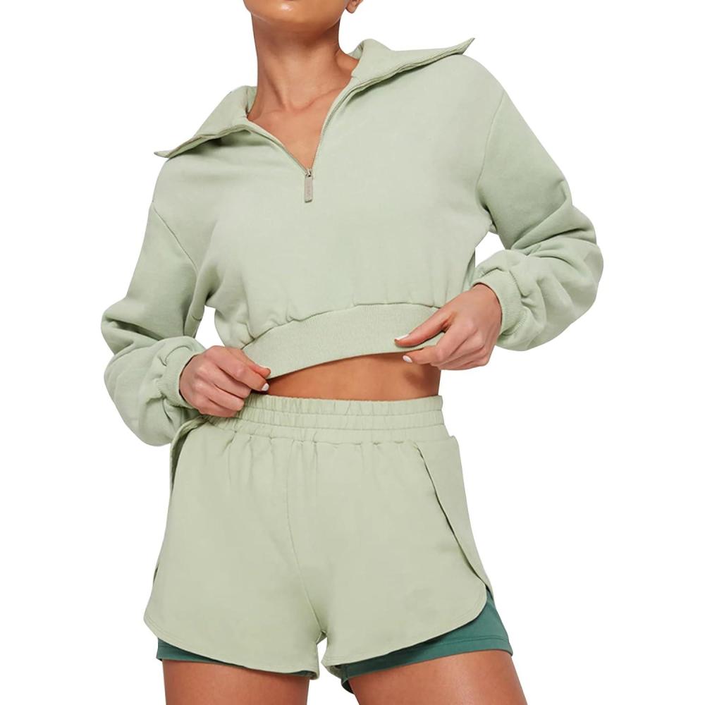 Flygo Women Two Piece Tracksuit Long Sleeves Sweatsuit Half Zip Crop Top Sexy Biker Shorts Jogging Outfit(Green-XS)