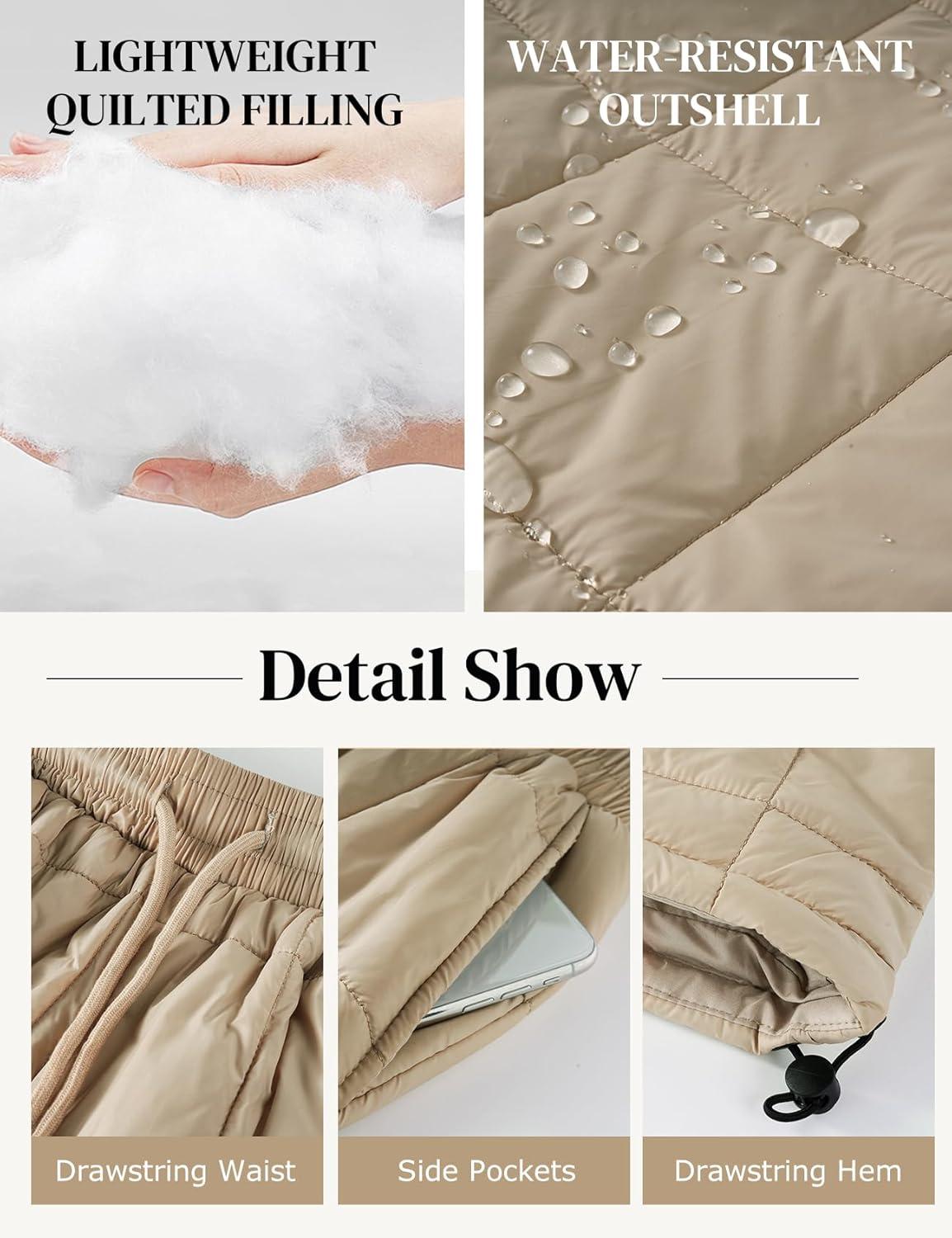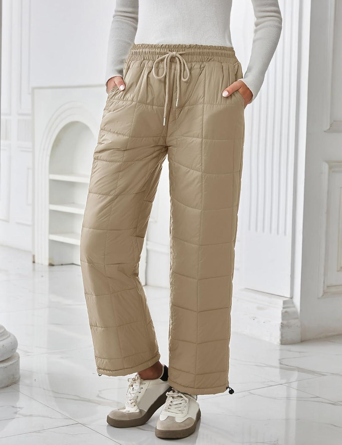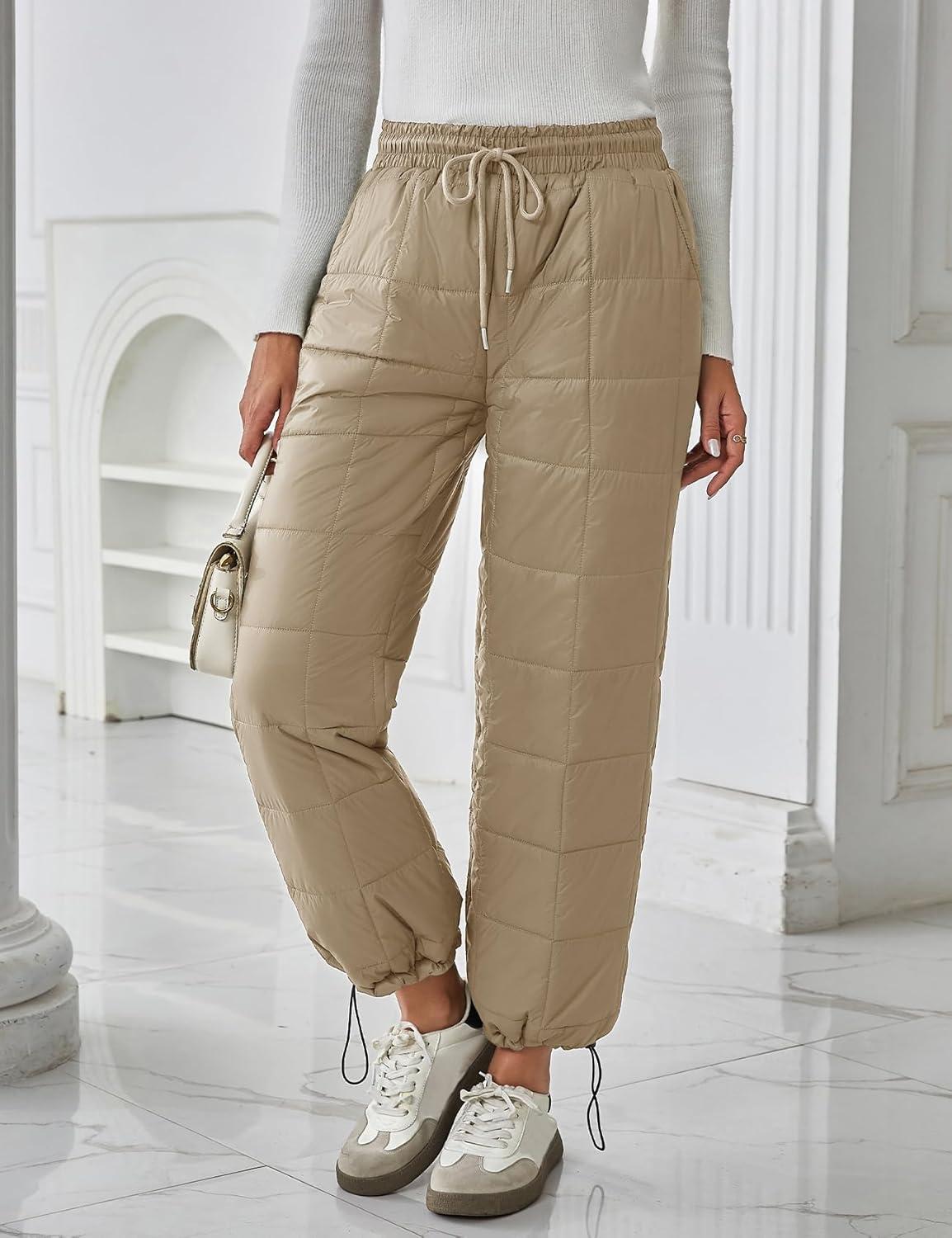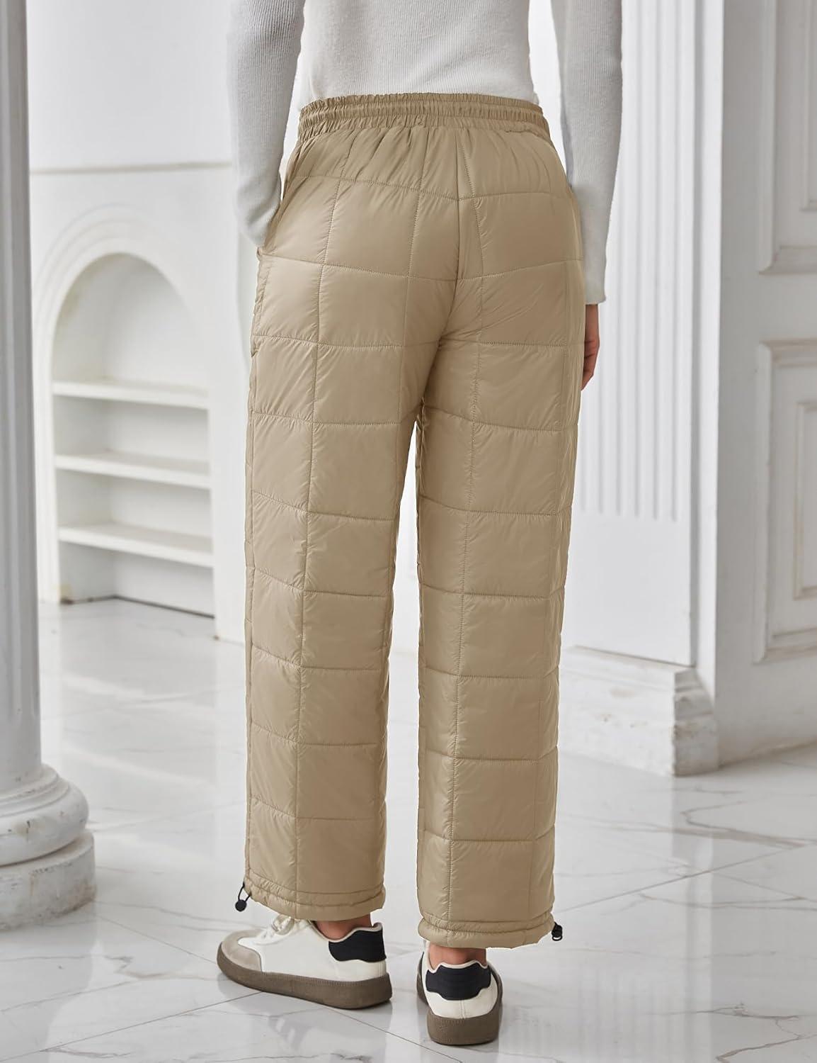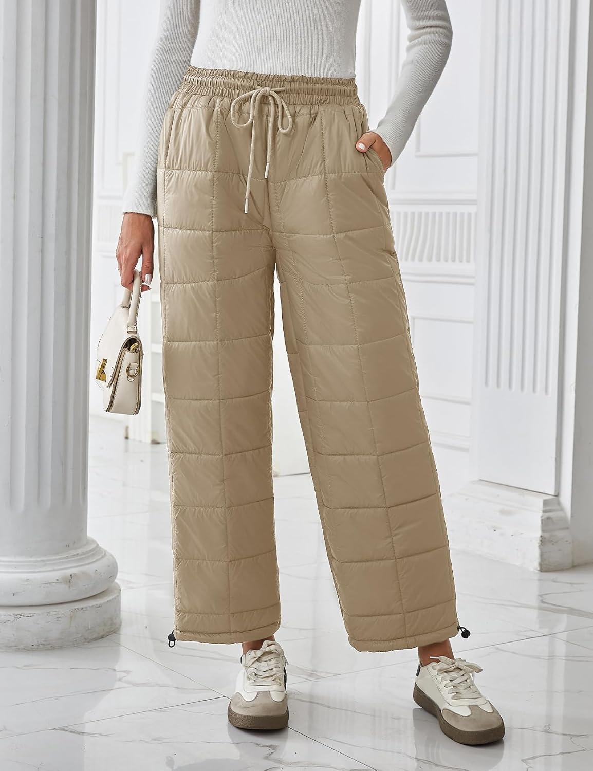 Flygo Women Winter Pants Lightweight Quilted Puffy Down Snow Pants Casual Baggy Wide Leg Trousers with Pockets(Light Khaki)