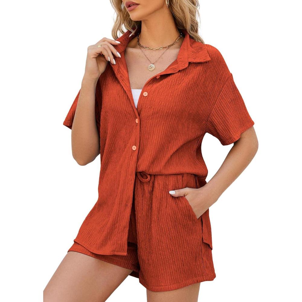 Flygo Womens 2 Piece Casual Outfits Summer Pleated Short Sleeve Top and Set Button Down Shirt Y2K(Brick Red)