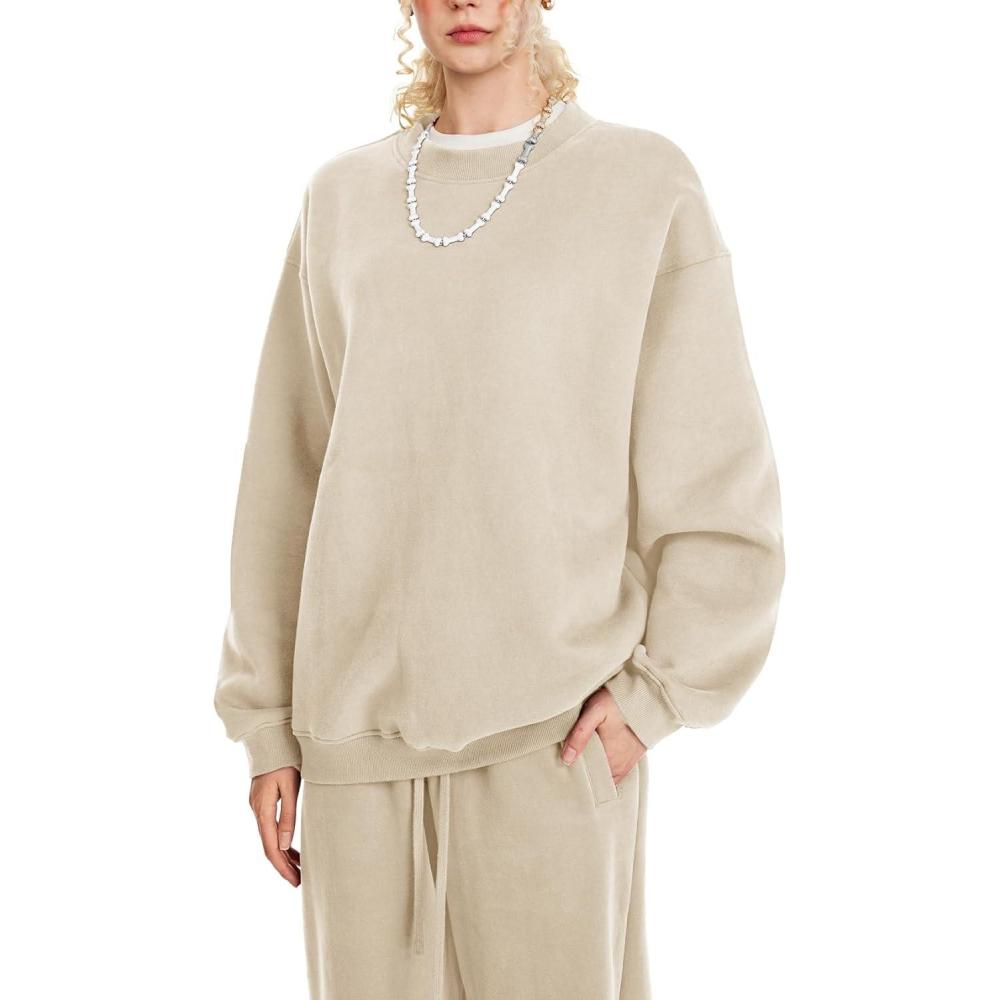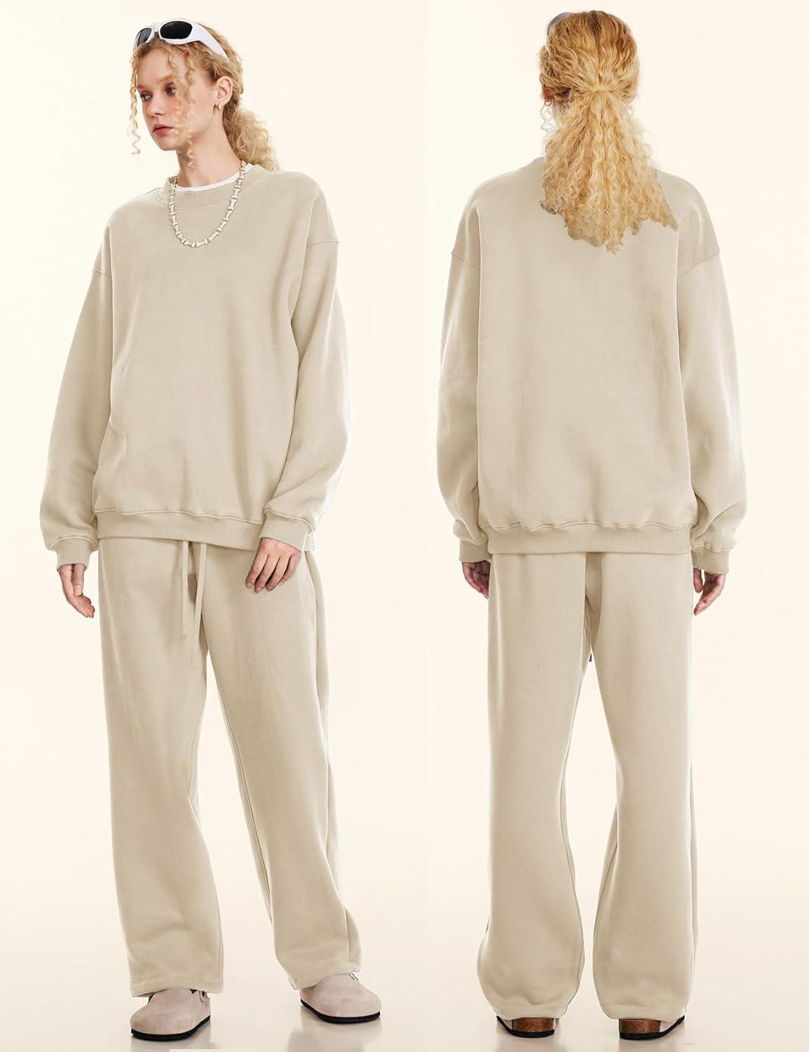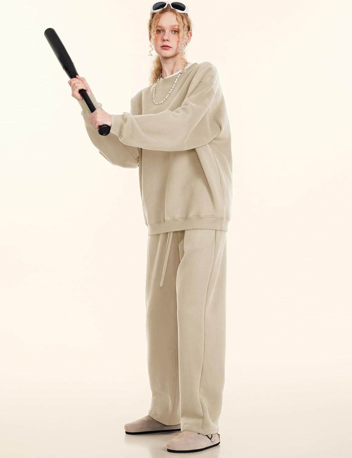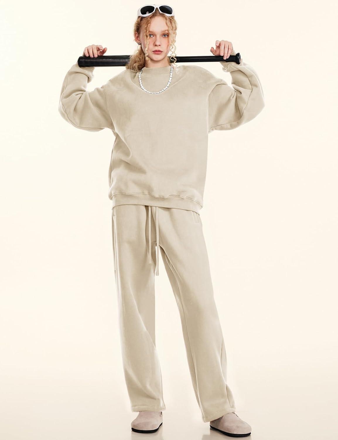 Flygo Womens 2 Piece Outfit Fleece Sweatsuit Sets Crewneck Long Sleeve Pullover Wide Leg Jogger Sweatpants Matching Tracksuit(Khaki)