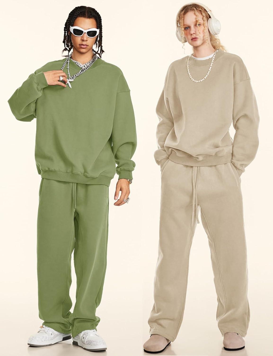 Flygo Womens 2 Piece Outfit Fleece Sweatsuit Sets Crewneck Long Sleeve Pullover Wide Leg Jogger Sweatpants Matching Tracksuit(Greygreen)