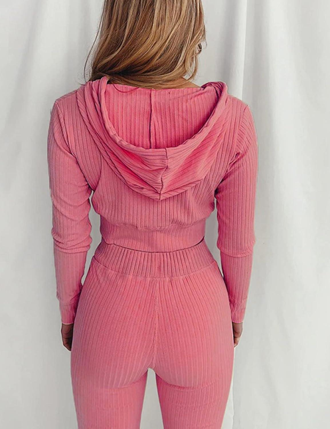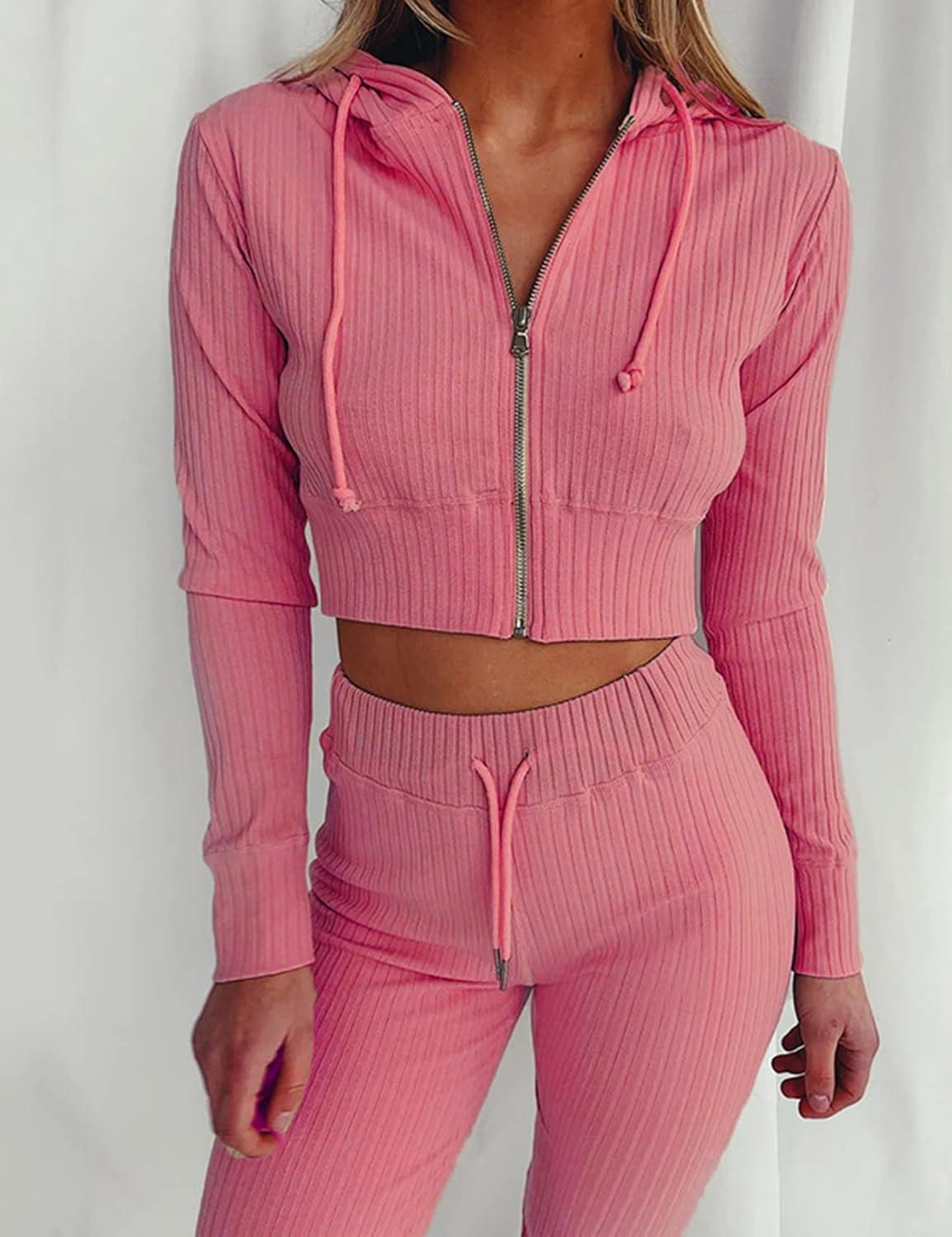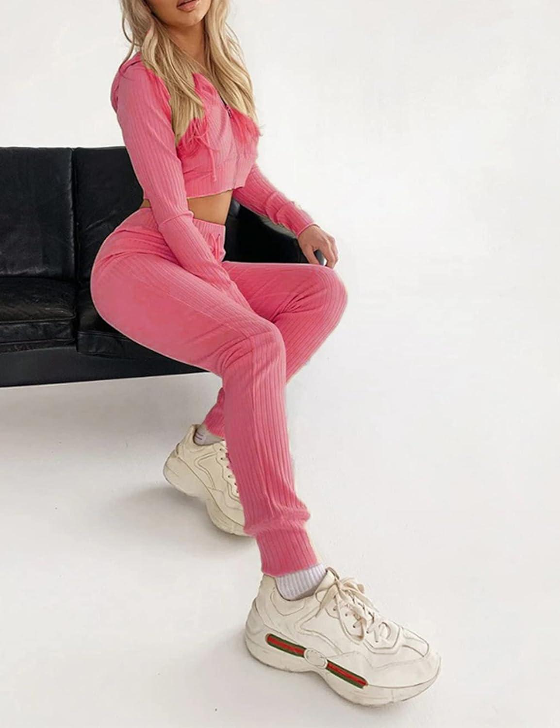 Flygo Women’s 2 Piece Outfits Long Sleeve Zip Up Crop Hooded Sweatshirt Long Pants Tracksuit Set(Pink)