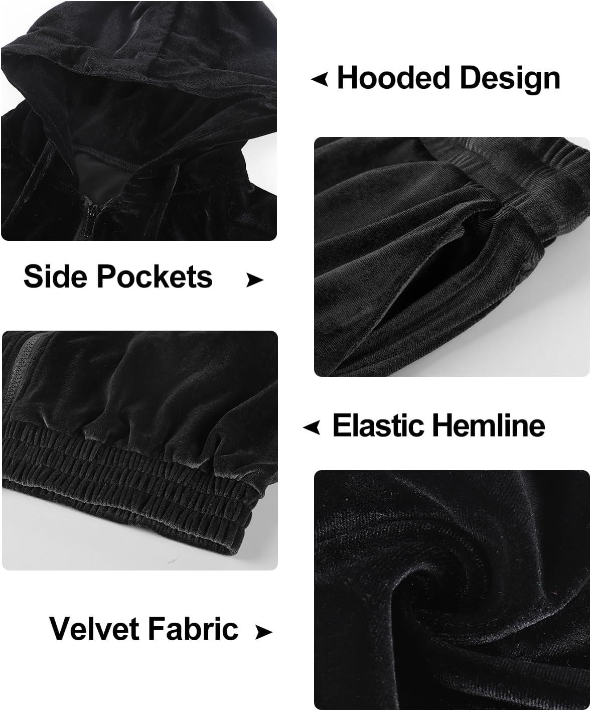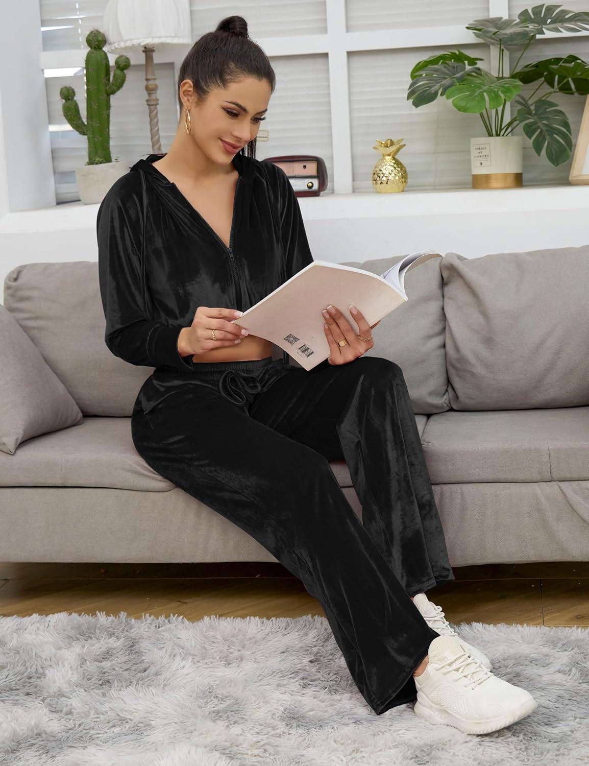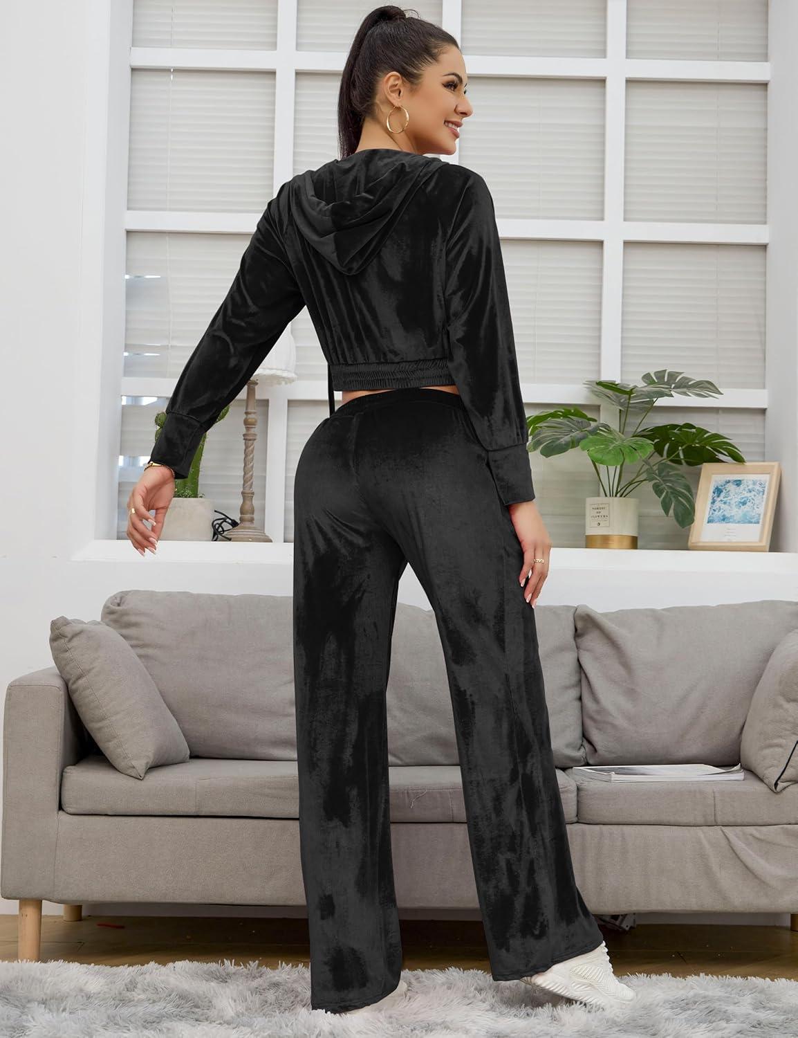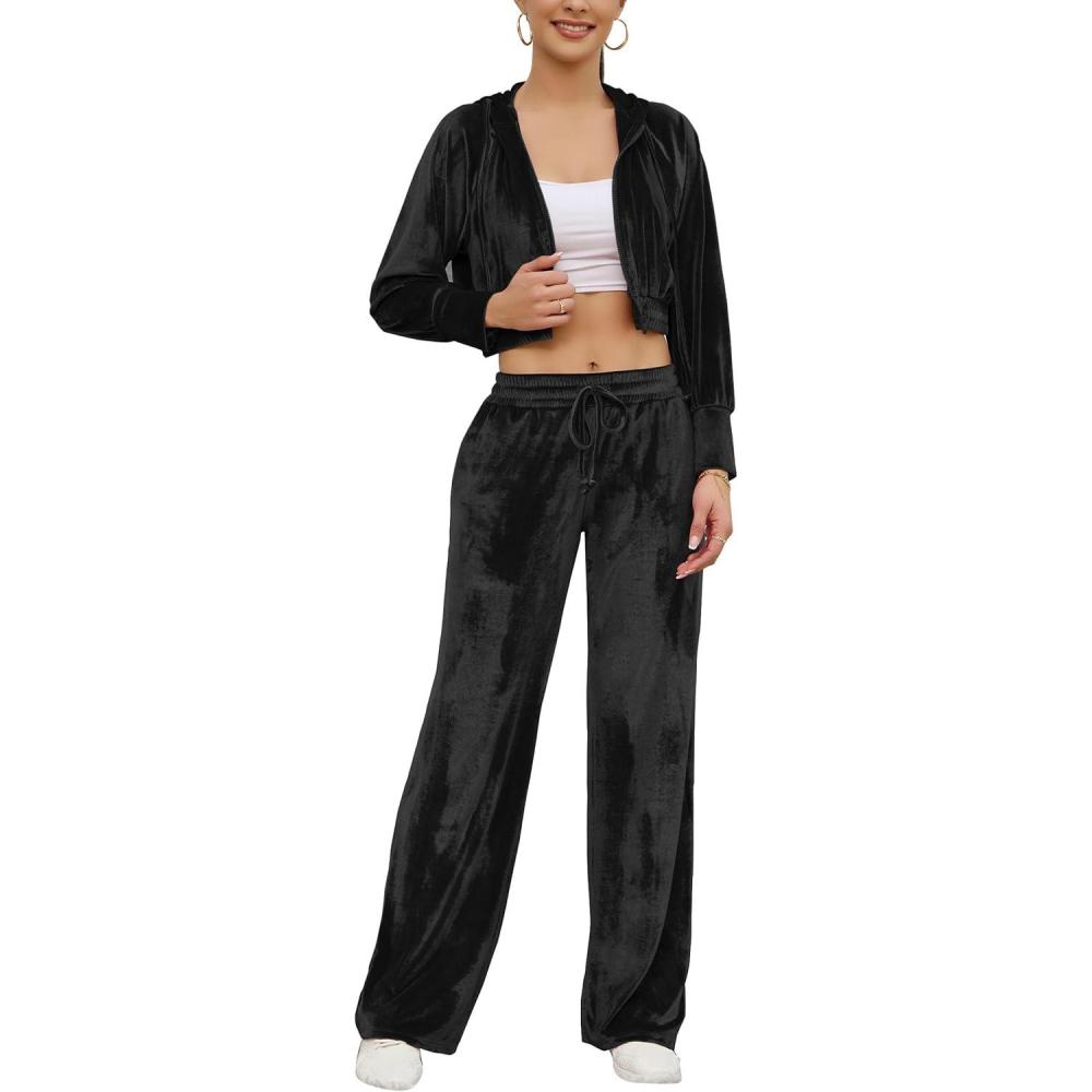 Flygo Women’s 2 Piece Velour Sweatsuits Sexy Bodycon Outfits Zip Crop Tops Tracksuit Drawstring Flare Pants Set(Black)