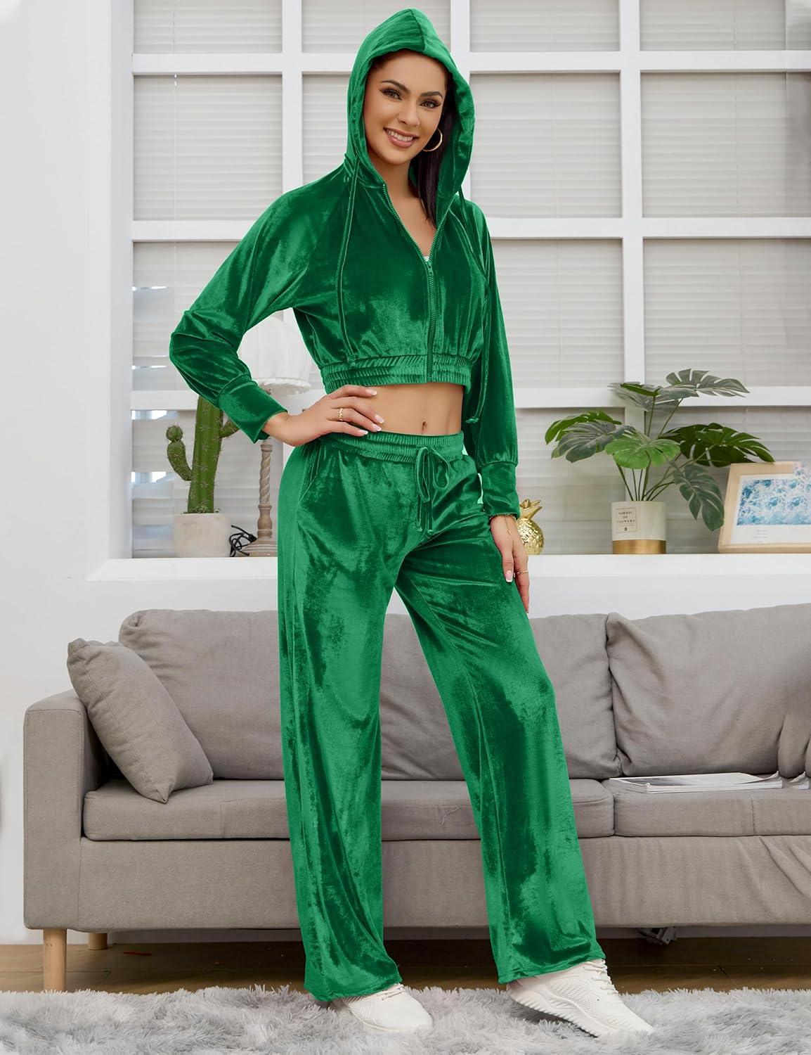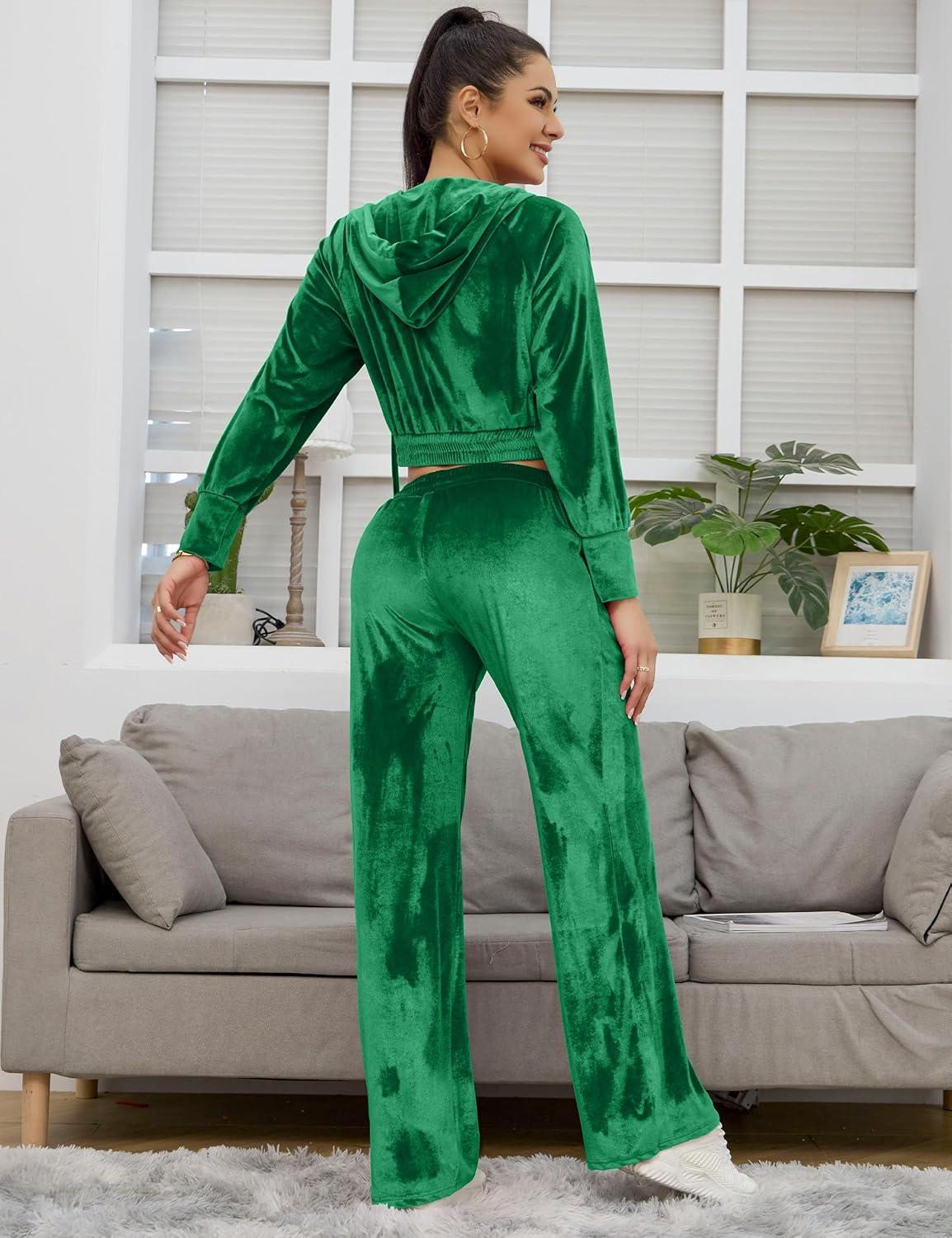 Flygo Women’s 2 Piece Velour Sweatsuits Sexy Bodycon Outfits Zip Crop Tops Tracksuit Drawstring Flare Pants Set(Green)
