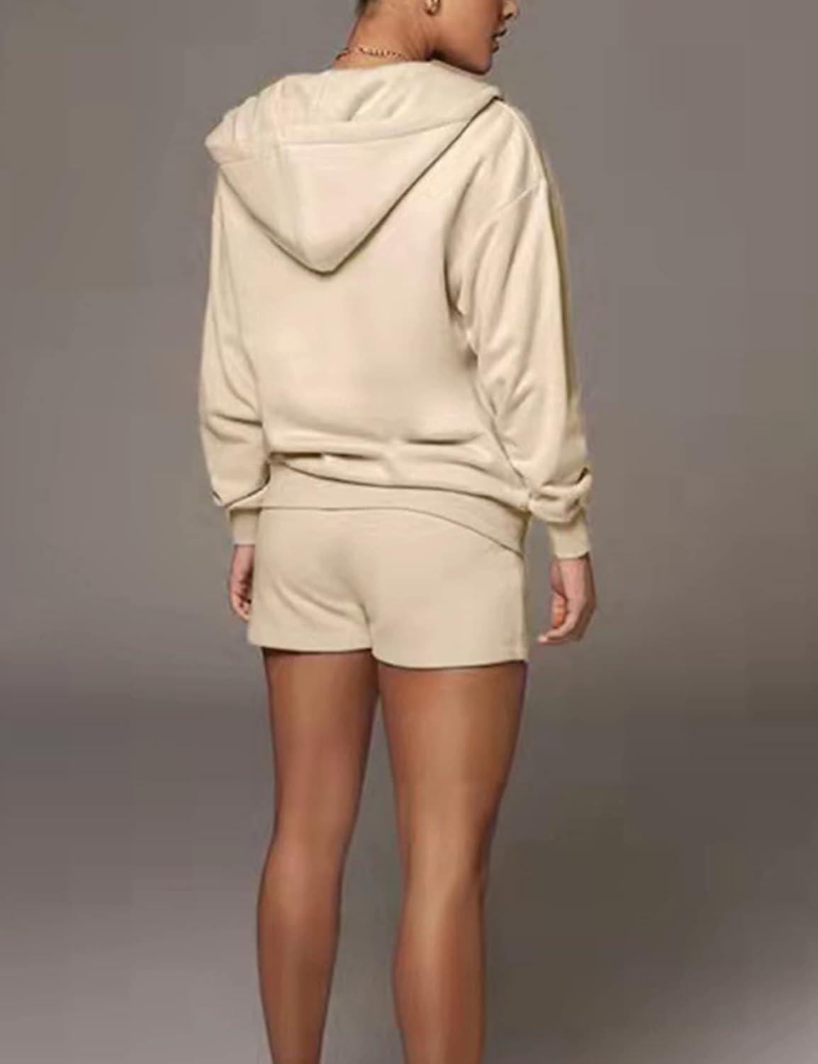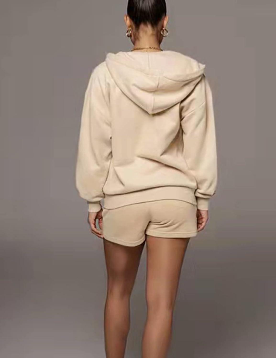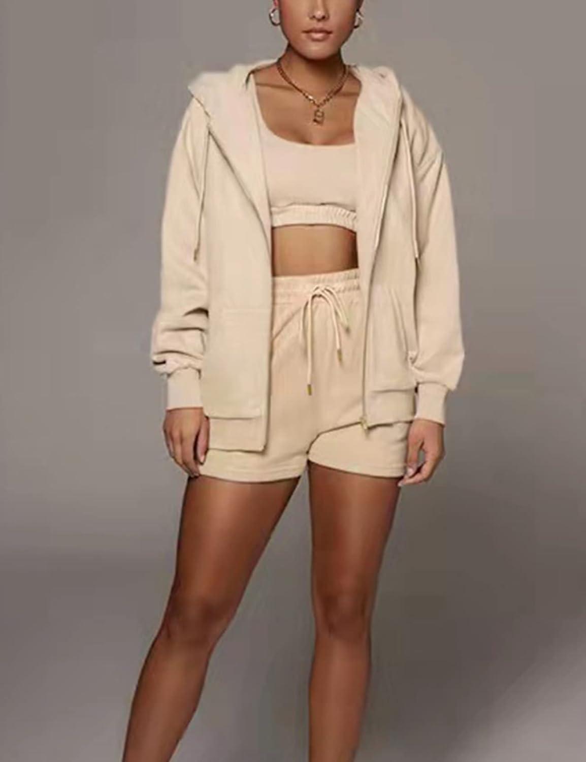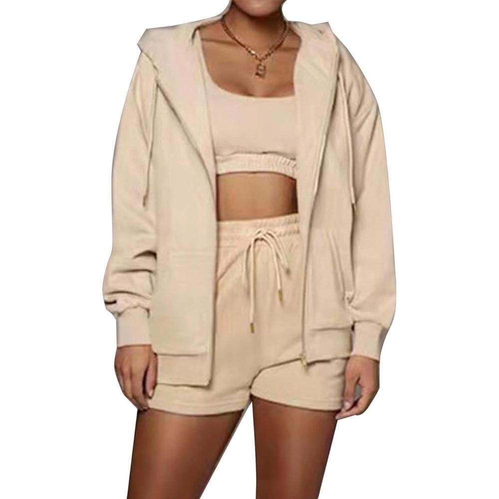 Flygo Womens 3 Piece Lounge Sets Long Sleeve Tracksuits Sexy Hooded Sweatsuit Outfits Shorts Jacket(Apricot)