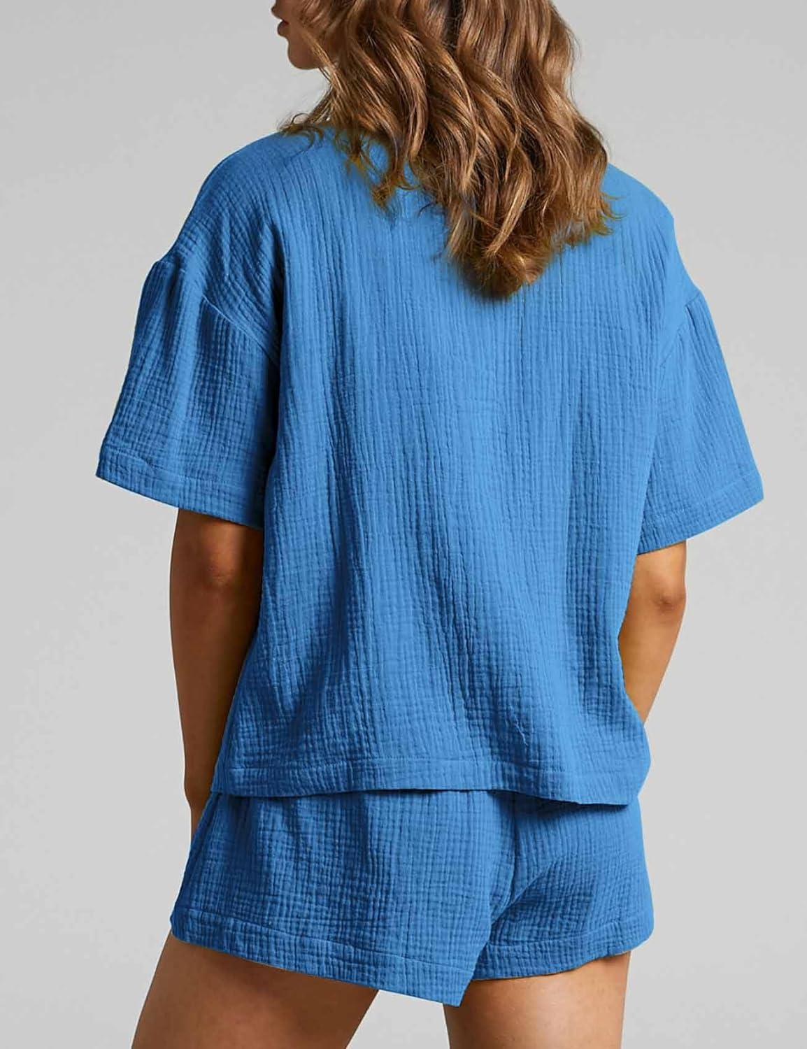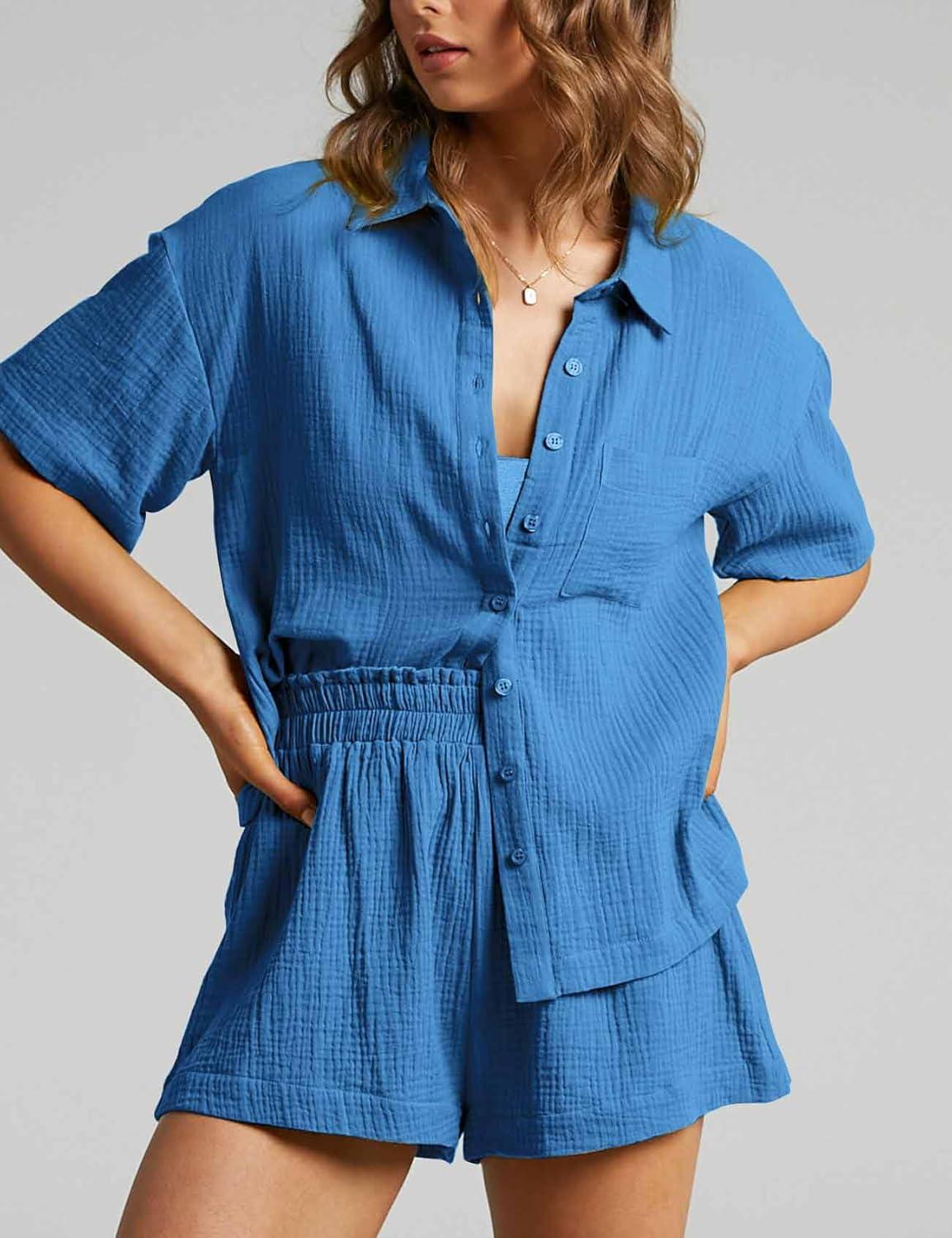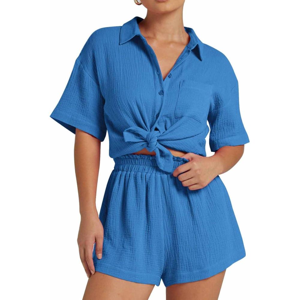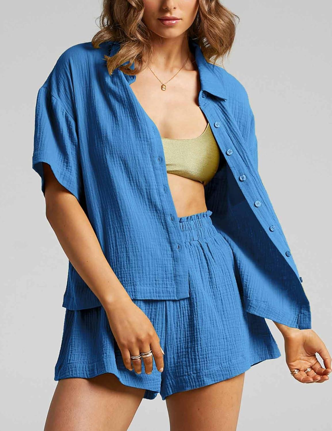Flygo Womens Casual 2 Piece Outfits Cotton Linen Sets Button Down Oversized Shirt Shorts 2025 Pajama Lounge Beach Set(Blue)