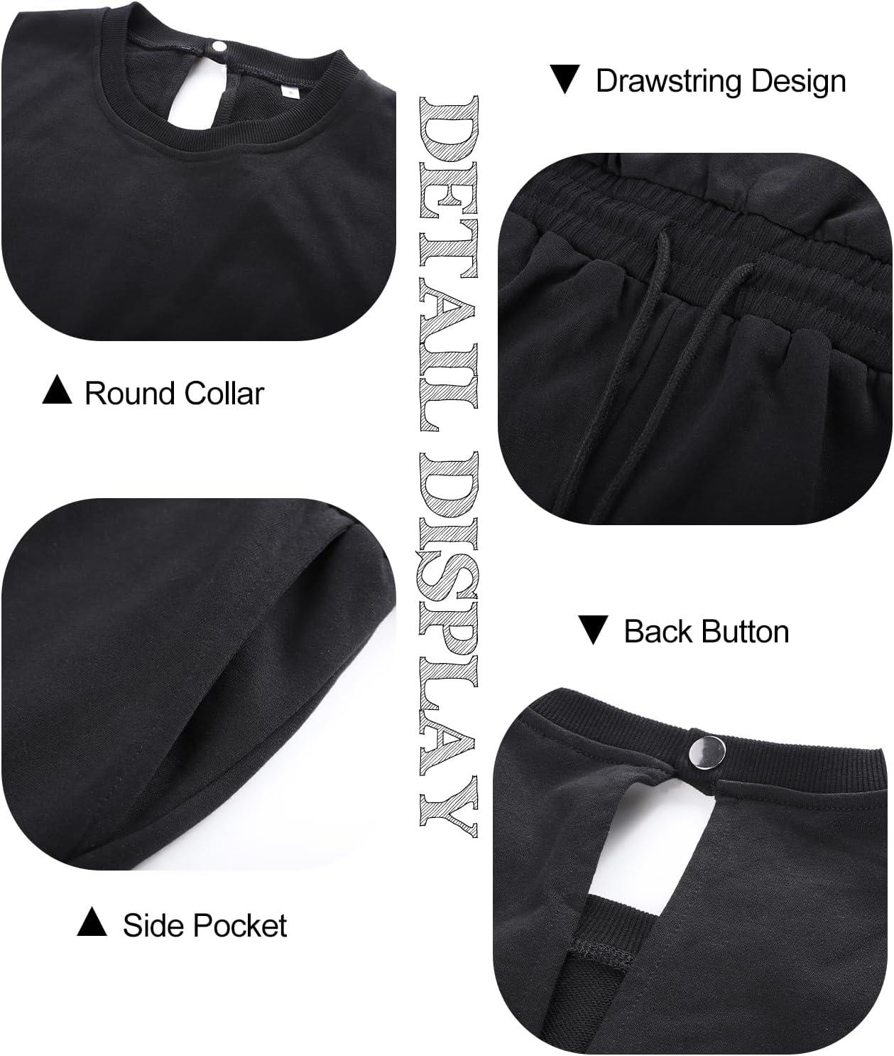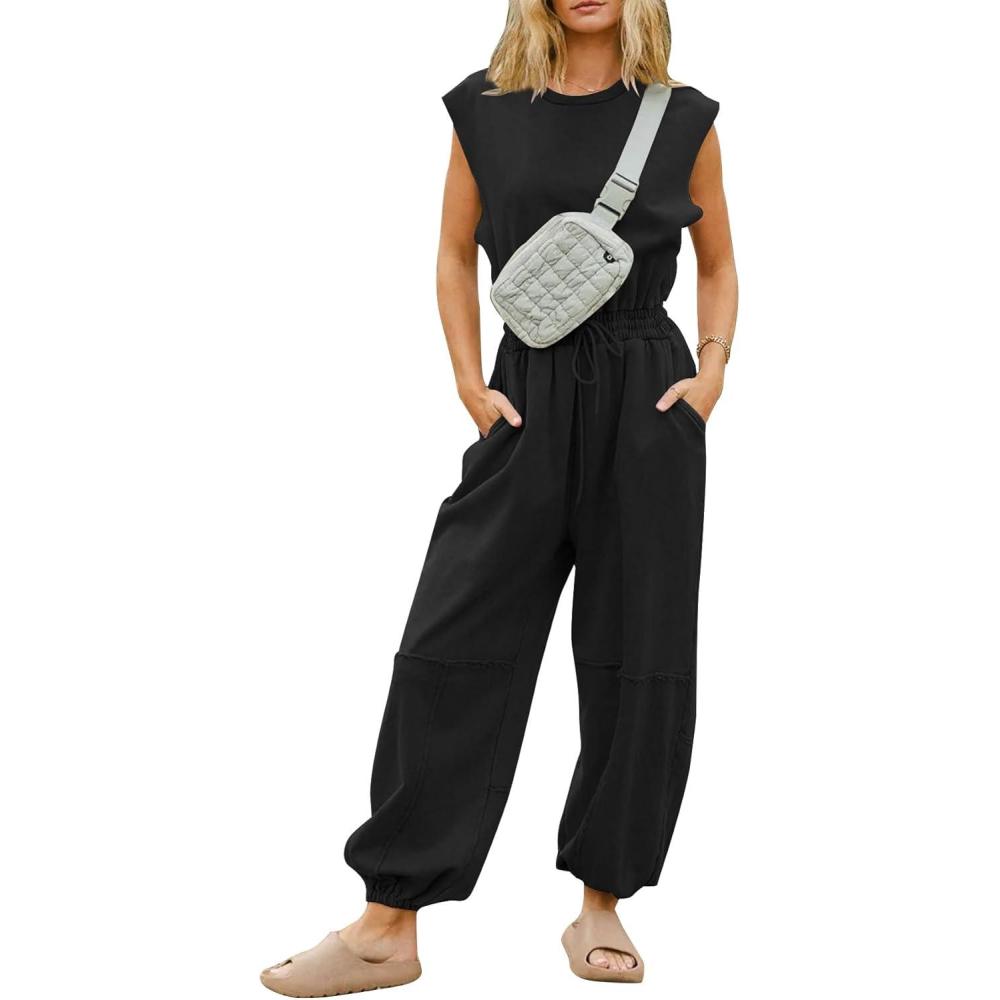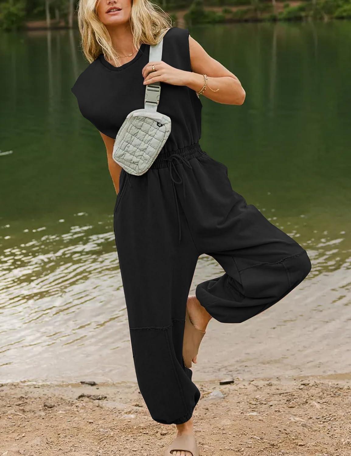 Flygo Womens Casual Jumpsuit Crewneck Cap Sleeve Long Wide Leg Pants One Piece Outfits Drawstring Romper with Pockets(Black)