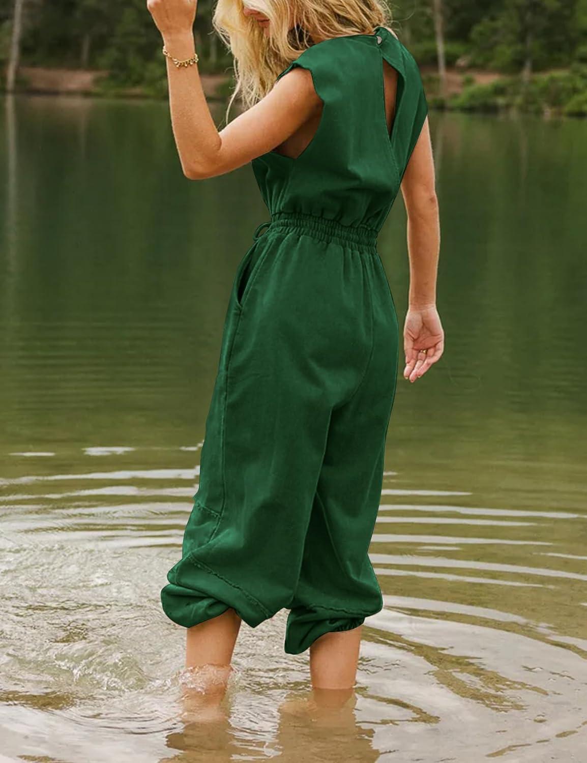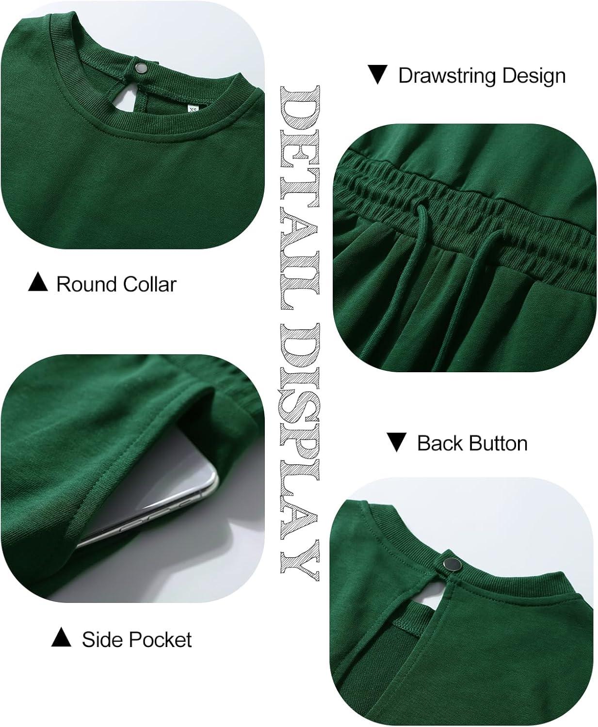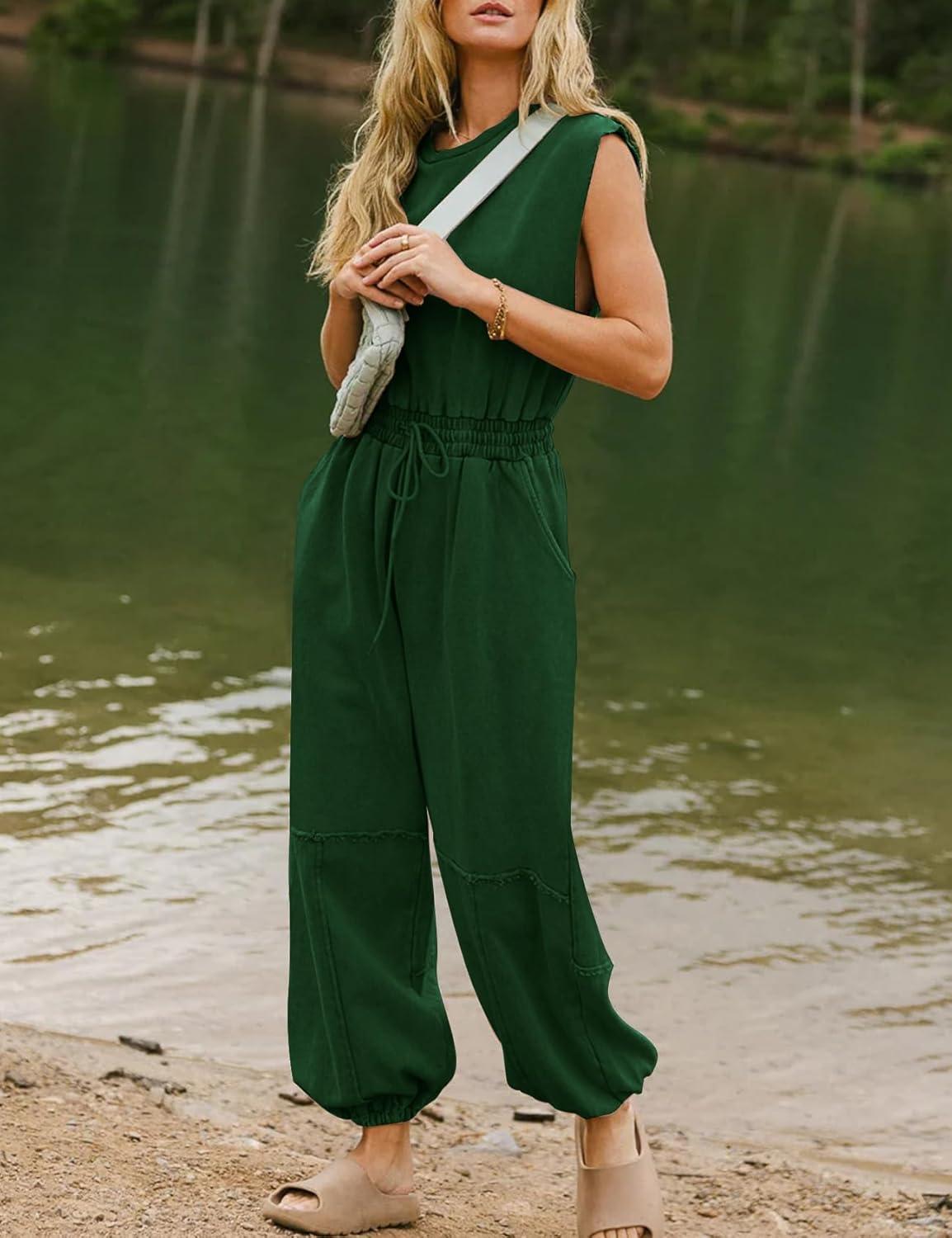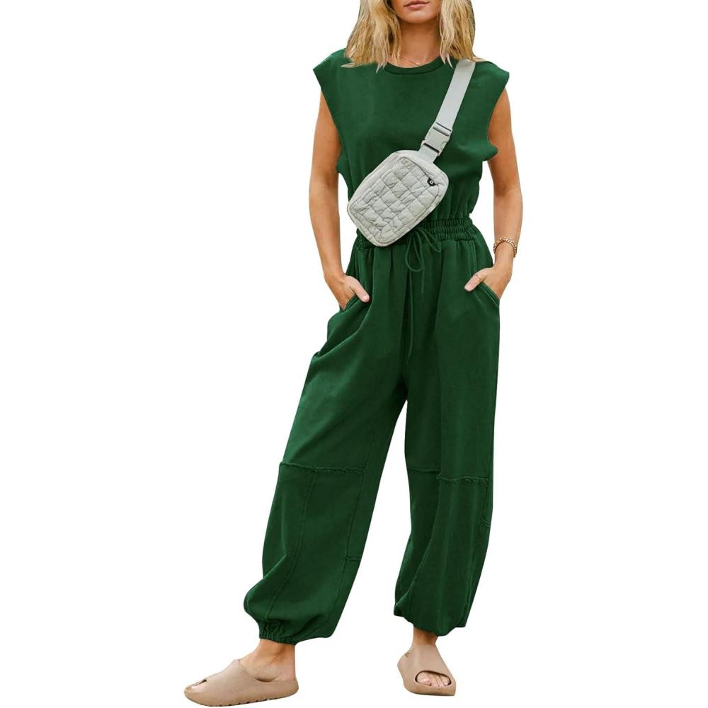 Flygo Womens Casual Jumpsuit Crewneck Cap Sleeve Long Wide Leg Pants One Piece Outfits Drawstring Romper with Pockets(Darkgreen)