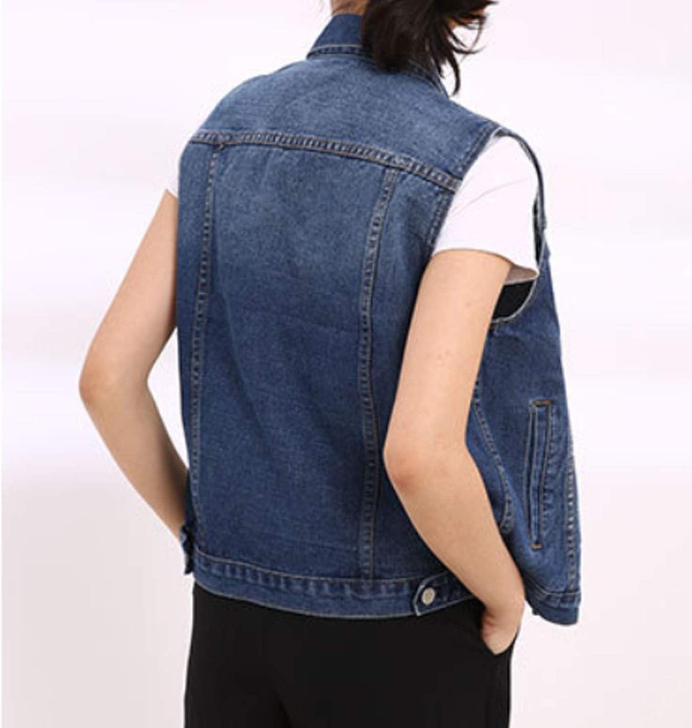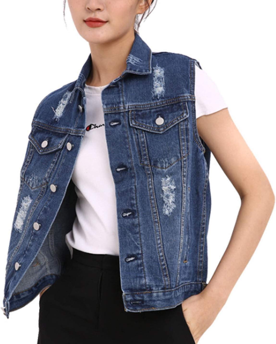 Flygo Womens Casual Plus Size Buttoned Distressed Washed Denim Vest Sleeveless Jean Jacket W Chest Flap Pockets(Blue)