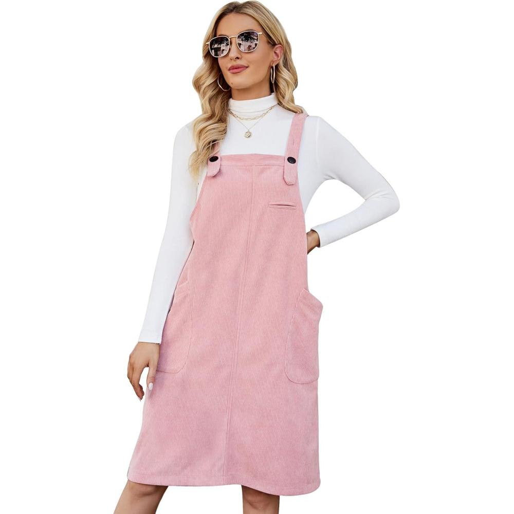 Flygo Women’s Corduroy Jumper Overall Pinafore Midi Dress Skirt with Pockets(Pink)