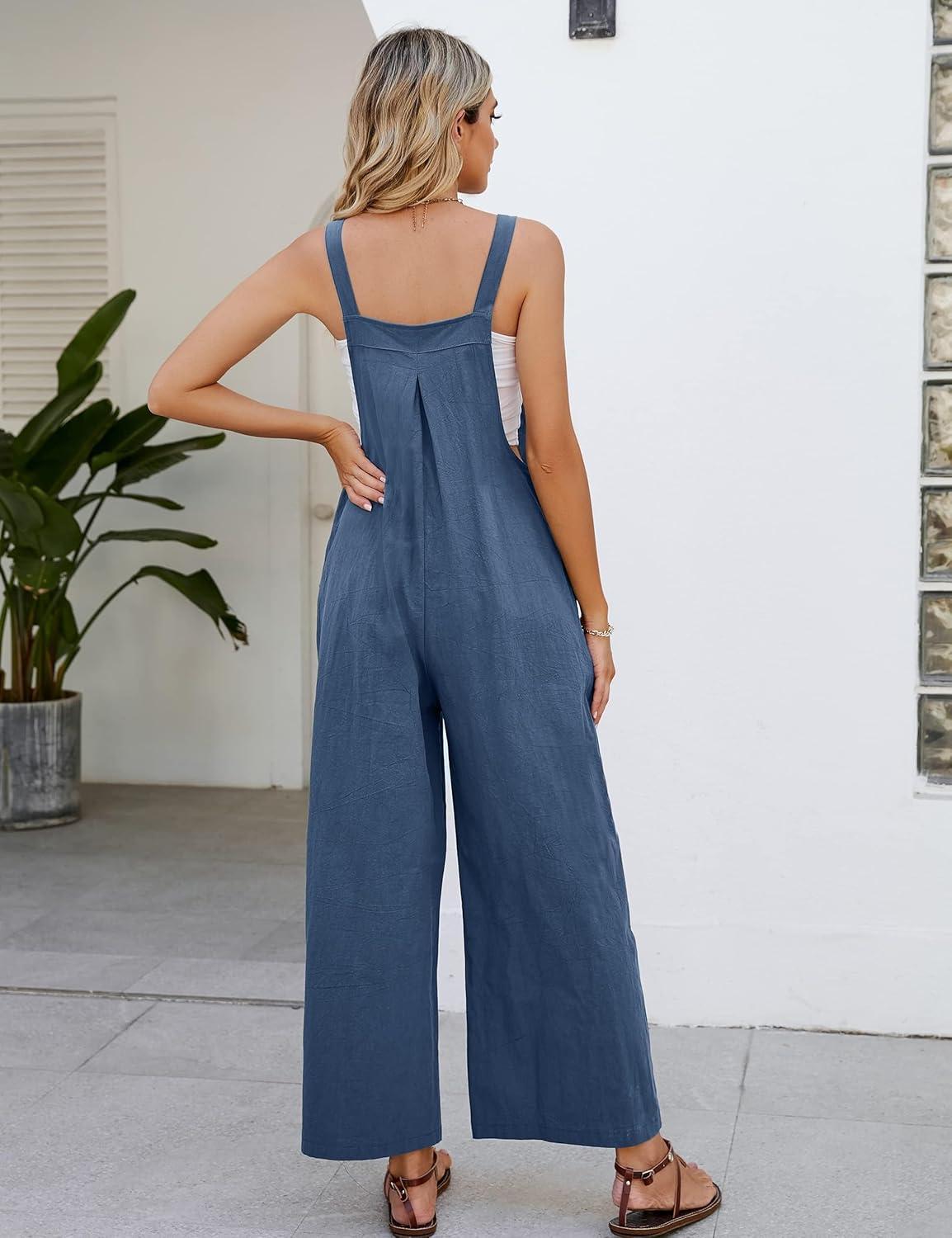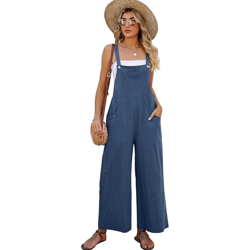 Flygo Women’s Cotton Bib Overalls Loose Fit Wide Leg Jumpsuits Casual Rompers with Pockets(Blue)