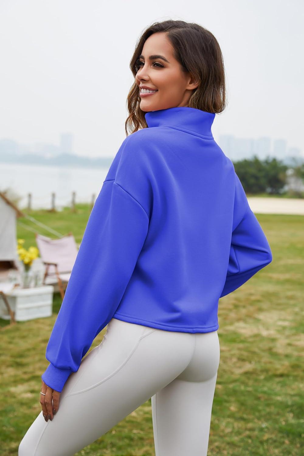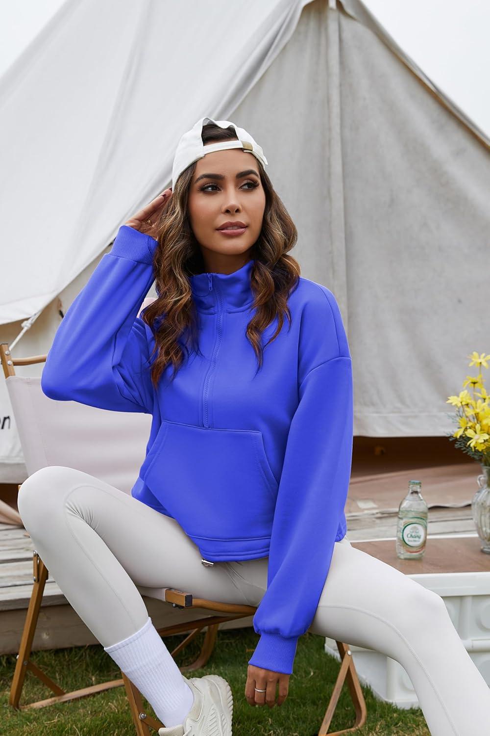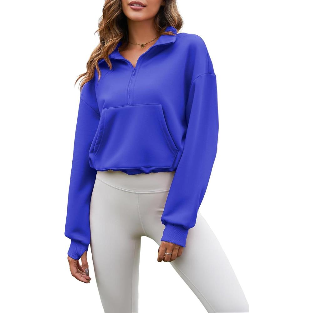 Flygo Womens Crop Half Zip Pullover Workout Big Pocket Sweatshirt Fleece Lined Sweatshirt Sweater Tops with Thumb Hole(Royal Blue)