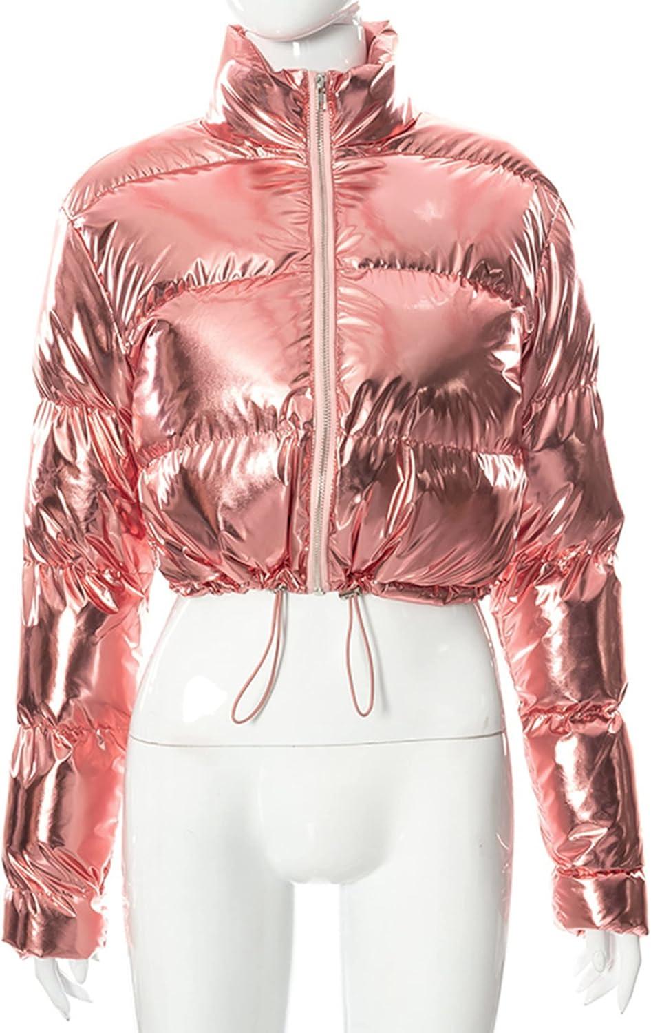 Flygo Women's Cropped Puffer Jacket-Shiny Waterproof Stand Collar Warm Winter Lightweight Coats
