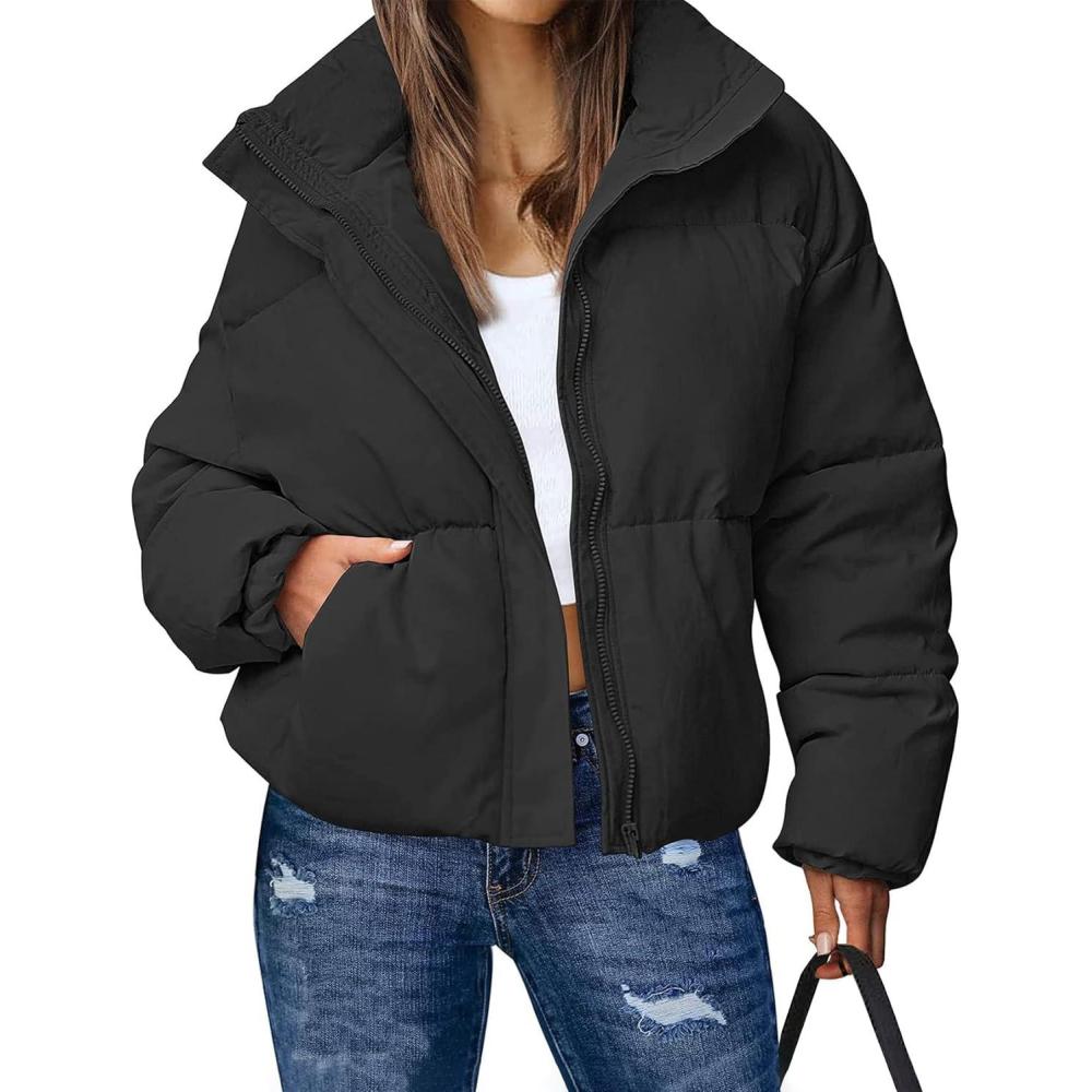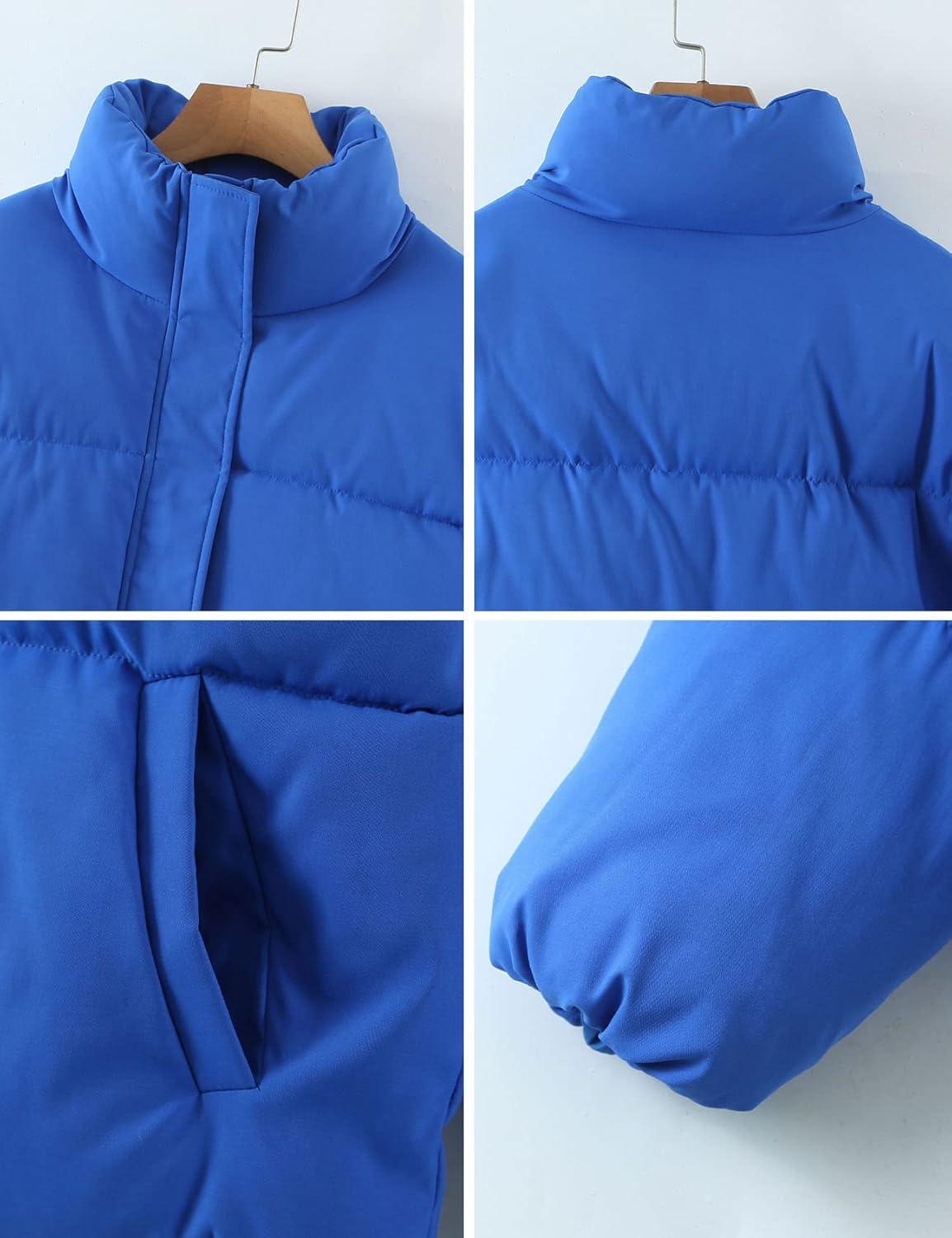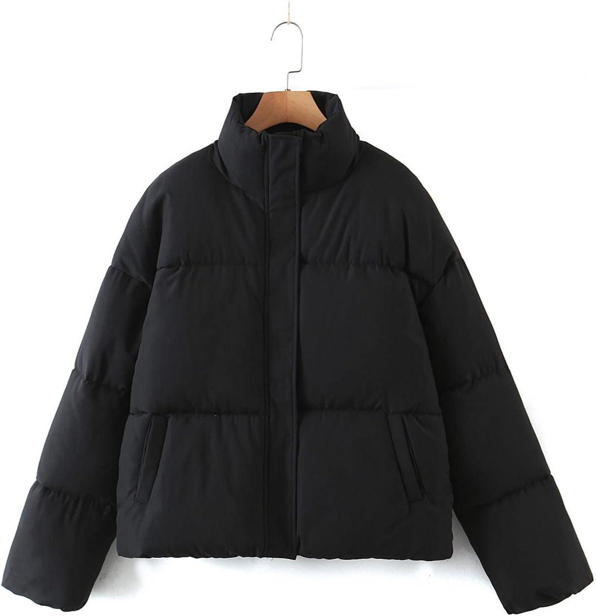 Women's Winter Long Sleeve Zip Puffer Jacket Stand Collar Baggy Short Down Coats with Pockets