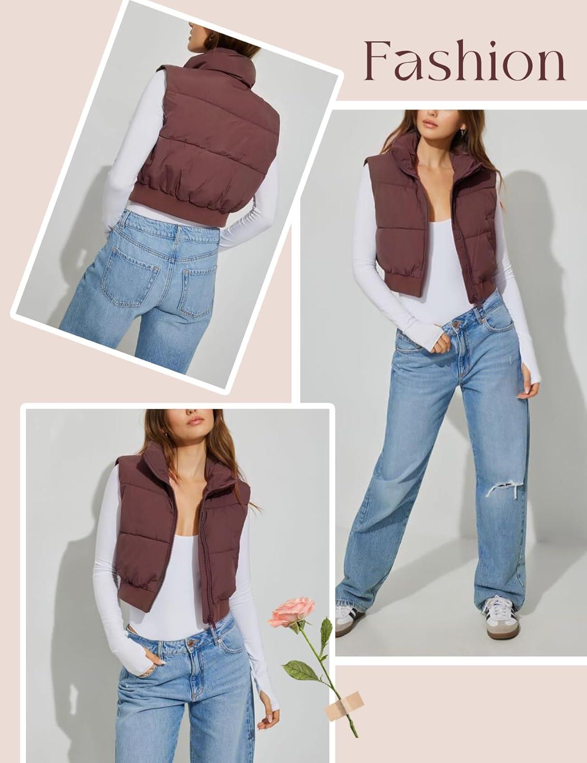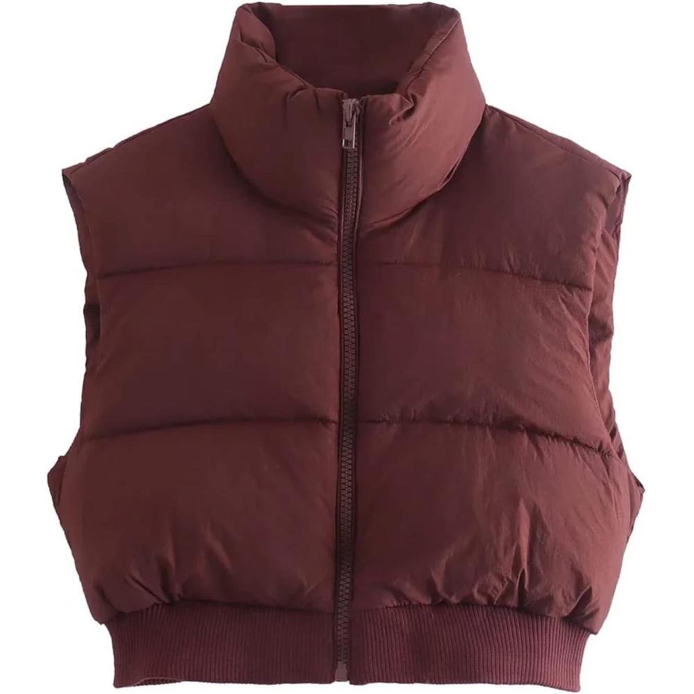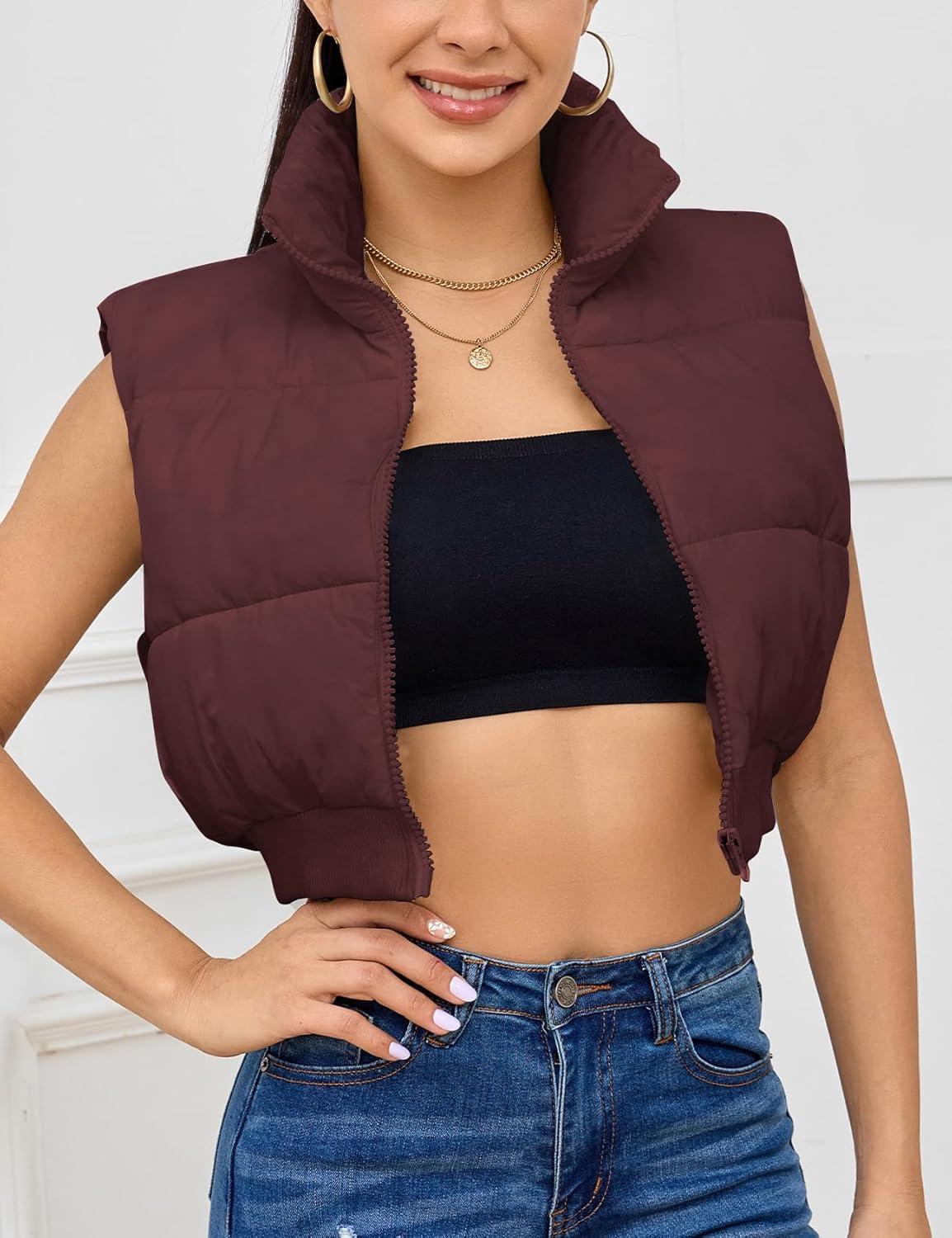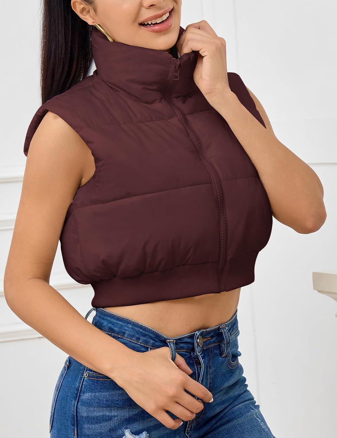Flygo Women’s Cropped Puffer Vest Zip Up Stand Collar Sleeveless Padded Bubble Vest(02 Burgundy)