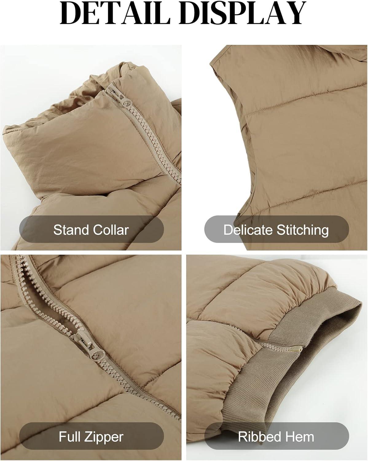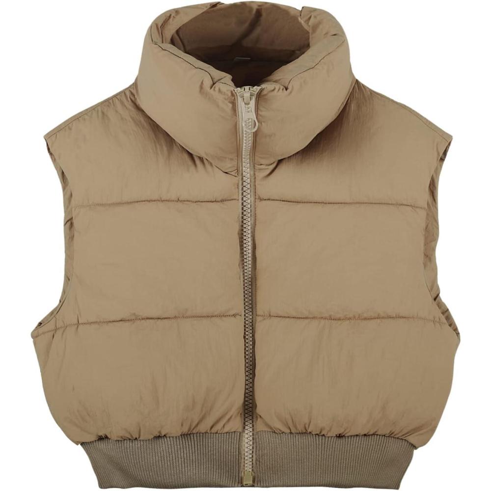 Flygo Women’s Cropped Puffer Vest Zip Up Stand Collar Sleeveless Padded Bubble Vest(02 Khaki)