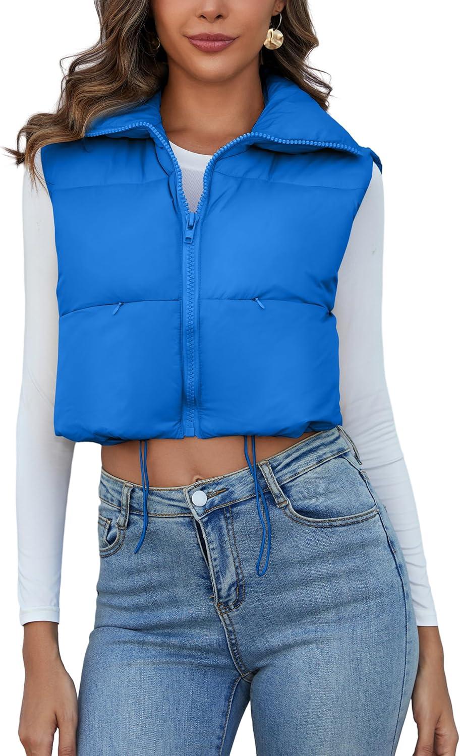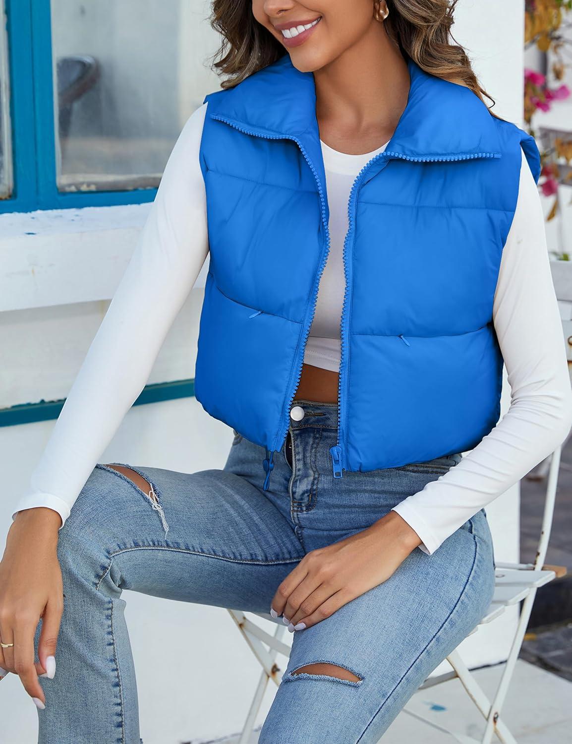 Flygo Women’s Cropped Puffer Vest Zip Up Stand Collar Sleeveless Padded Bubble Vest(Blue)