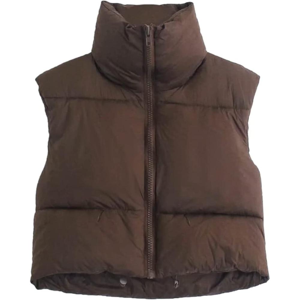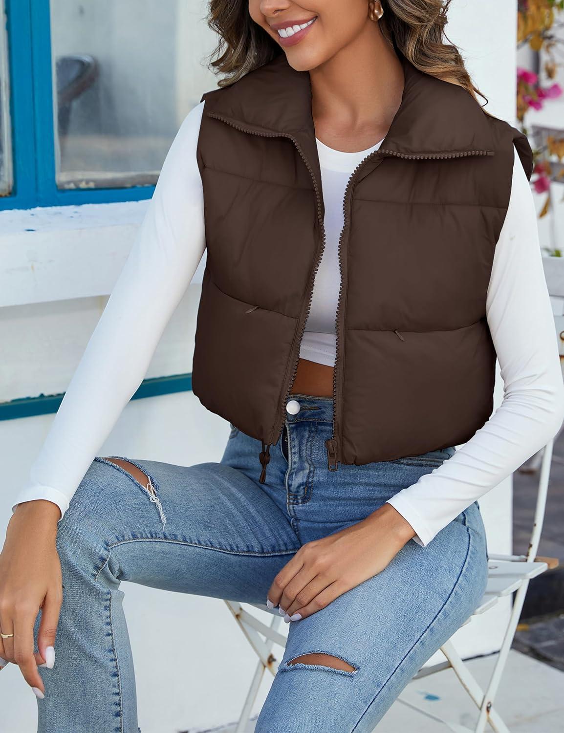 Flygo Women’s Cropped Puffer Vest Zip Up Stand Collar Sleeveless Padded Bubble Vest(Brown)