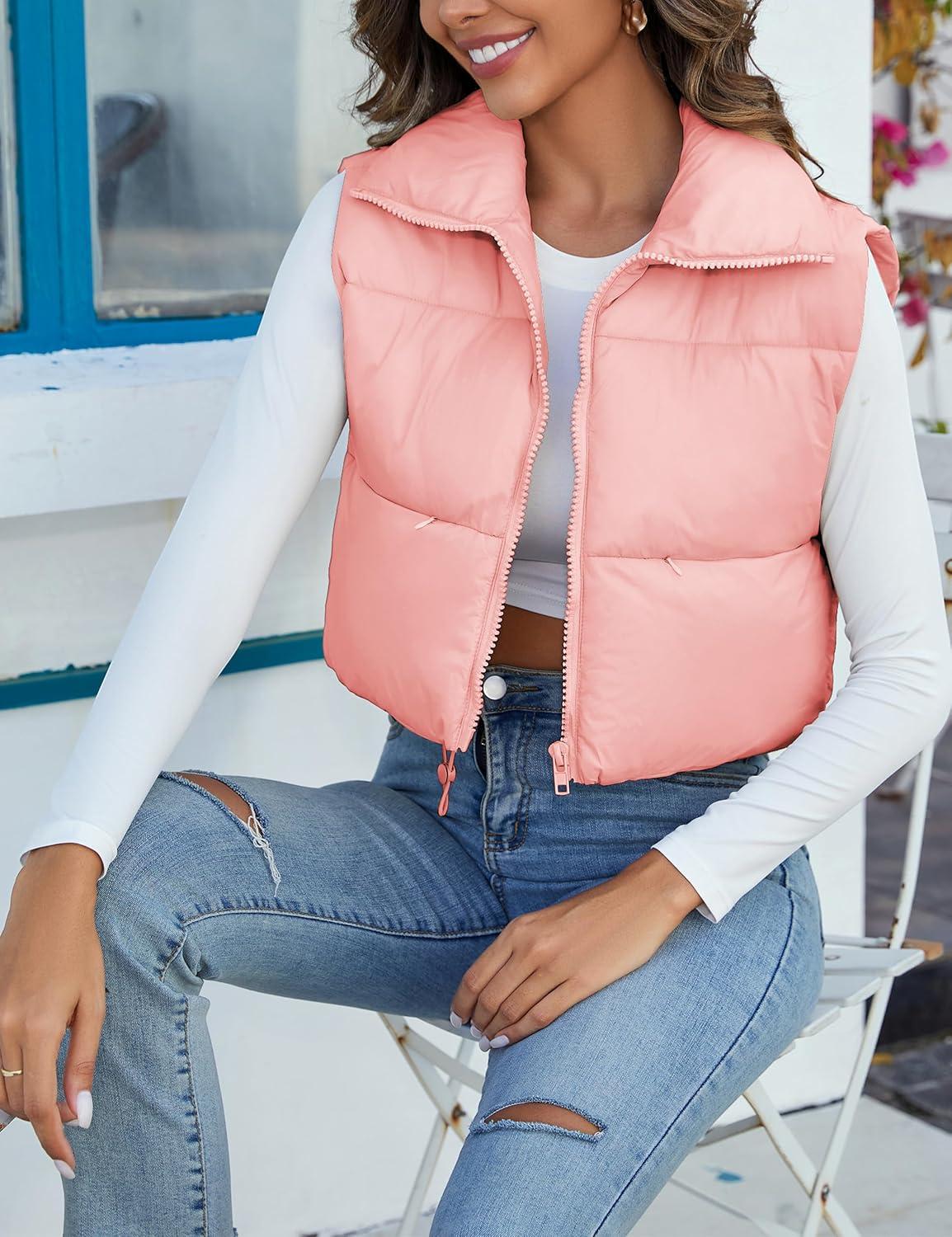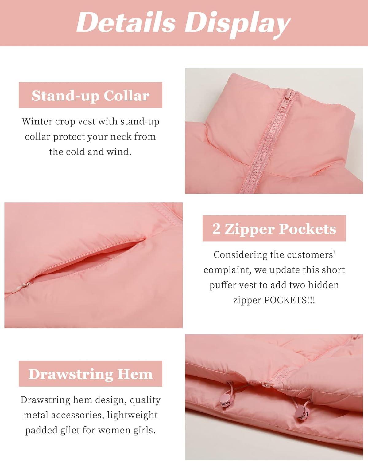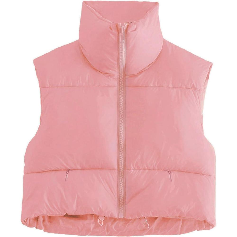 Flygo Women’s Cropped Puffer Vest Zip Up Stand Collar Sleeveless Padded Bubble Vest(Pink)