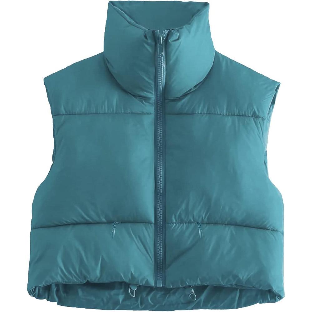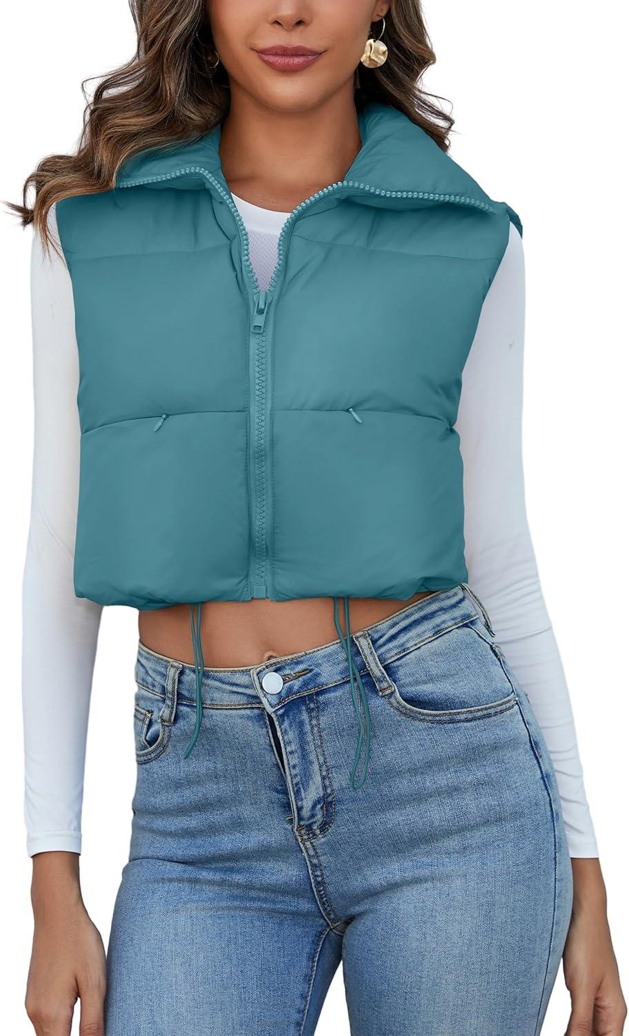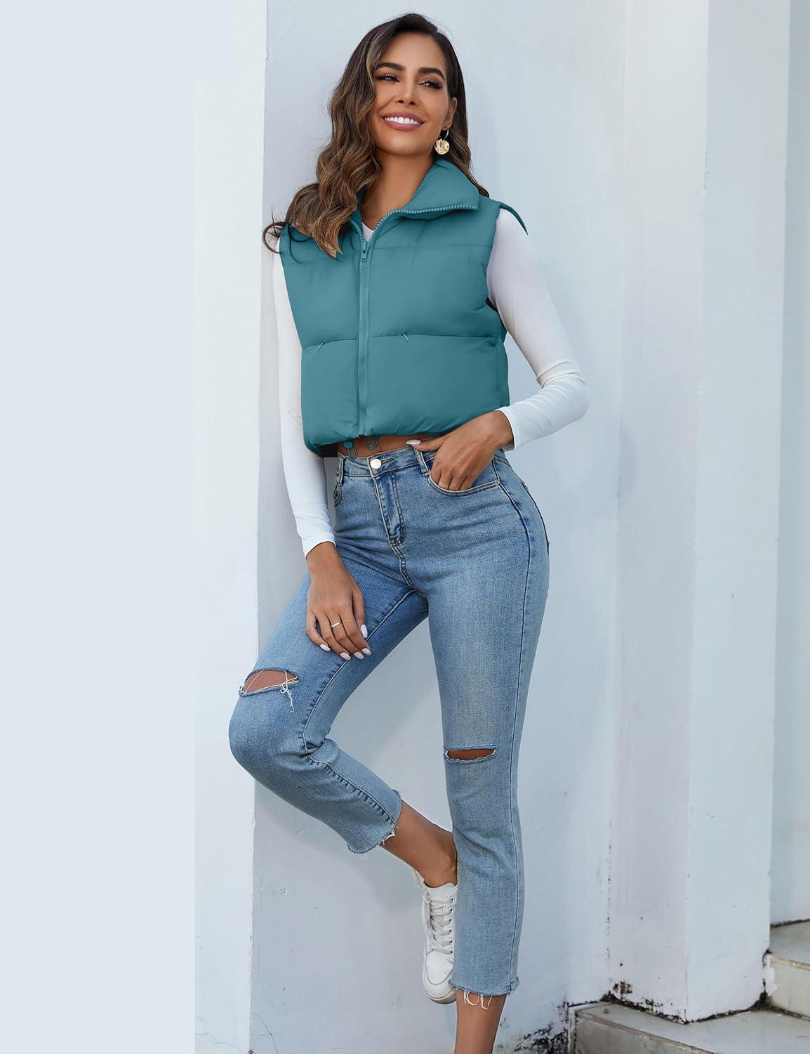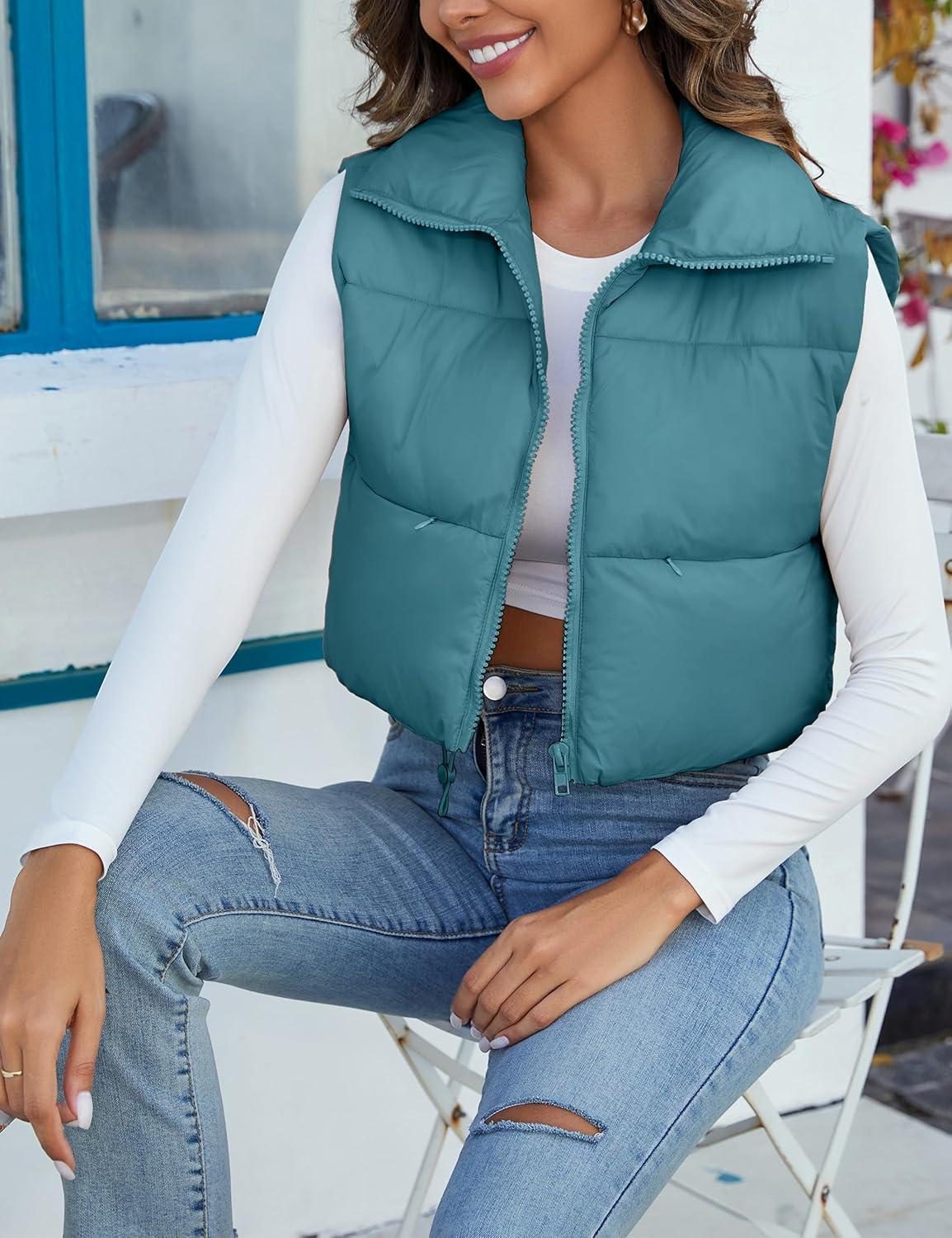 Flygo Women’s Cropped Puffer Vest Zip Up Stand Collar Sleeveless Padded Bubble Vest(Teal)