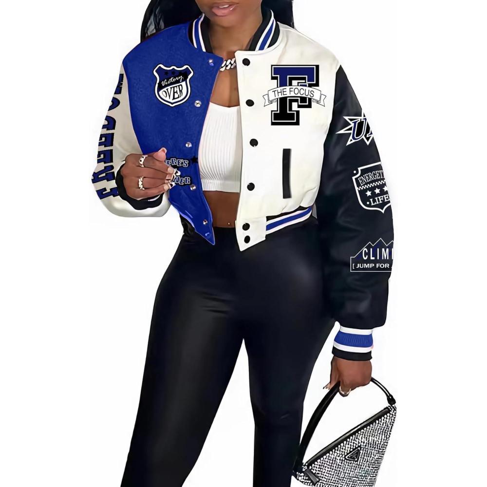 Flygo Women’s Cropped Varsity Jacket Baseball Jacket Colorblock Letter Print Y2k Button Down Bomber Uniform(Blue)