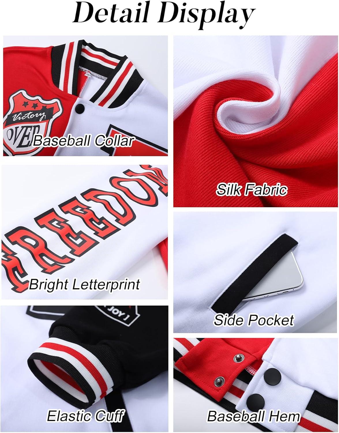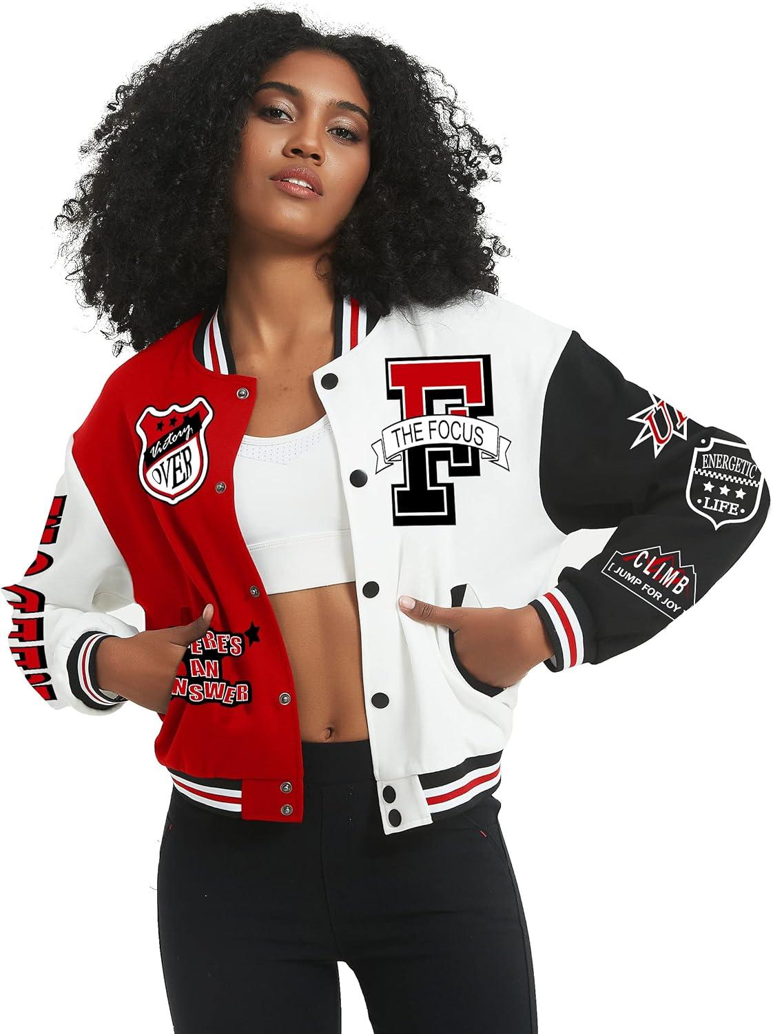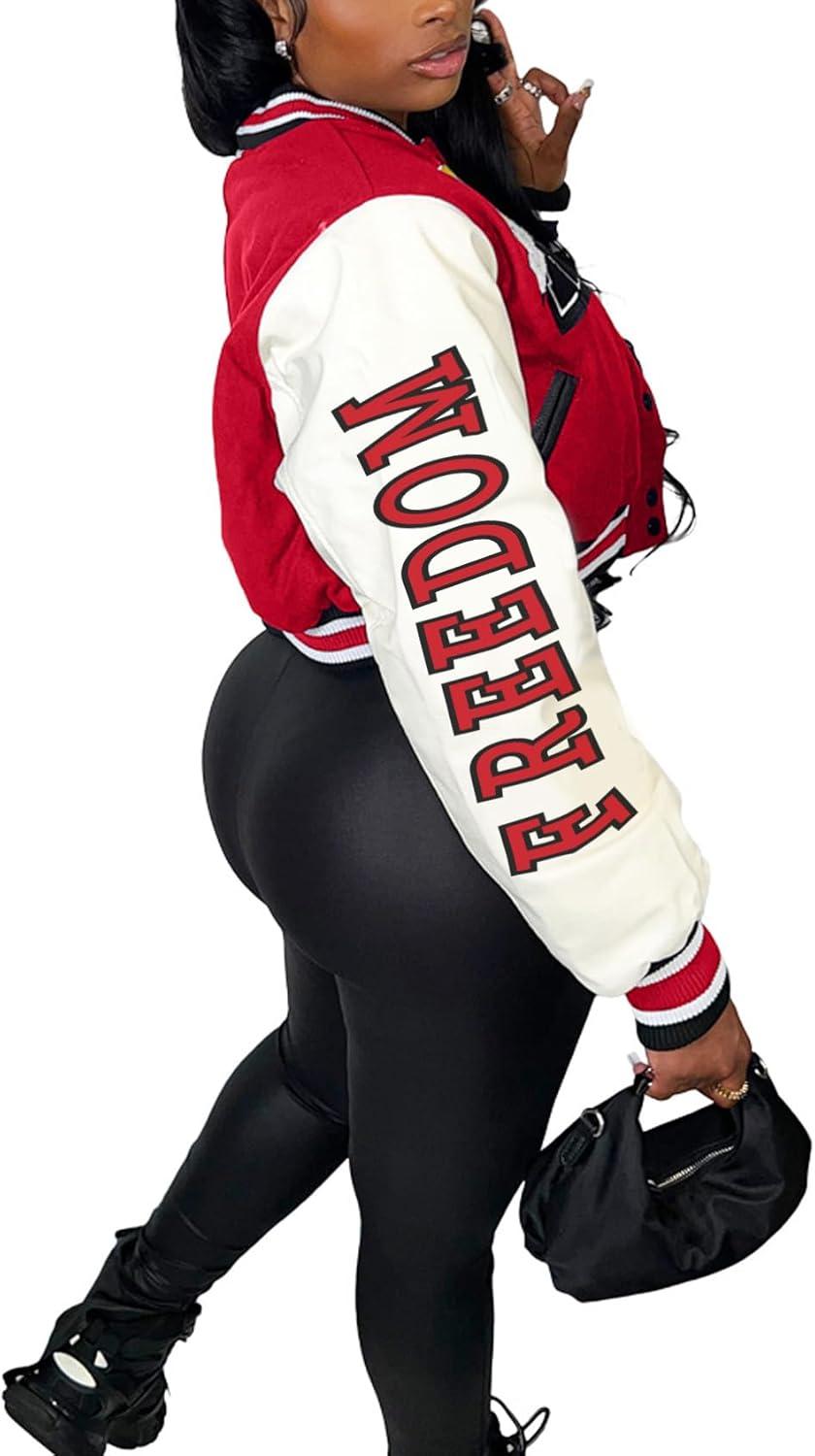 Flygo Women’s Cropped Varsity Jacket Baseball Jacket Colorblock Letter Print Y2k Button Down Bomber Uniform(Red)