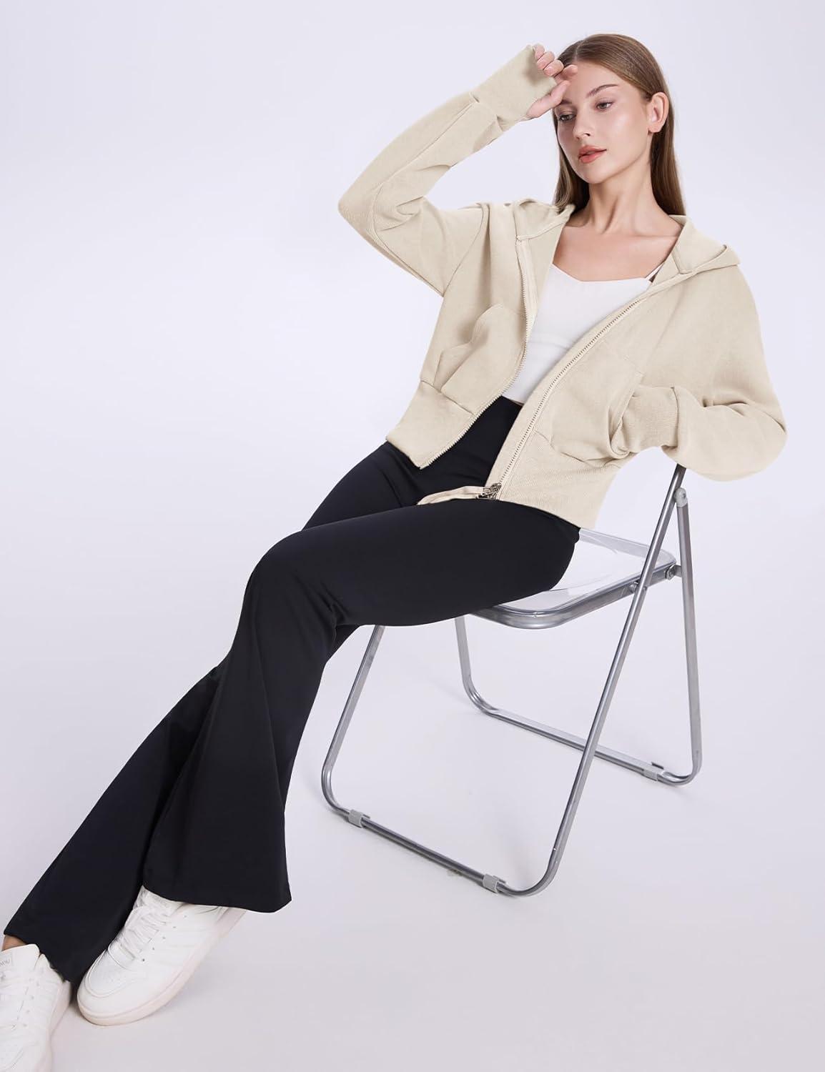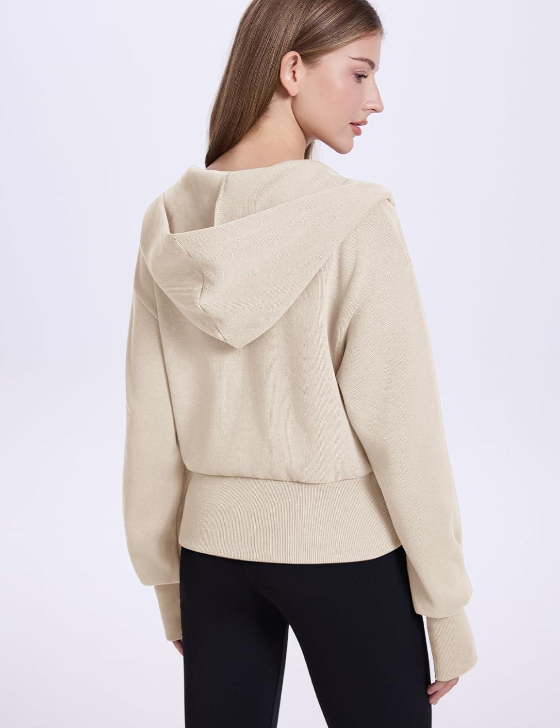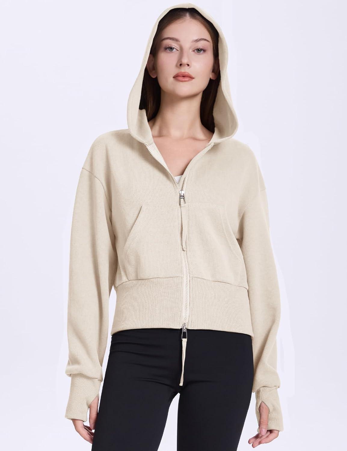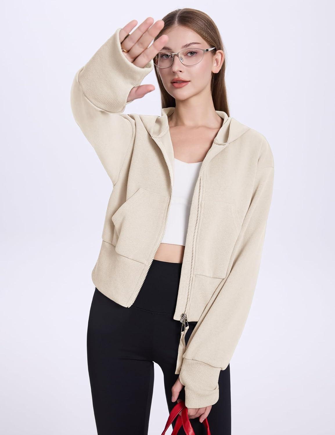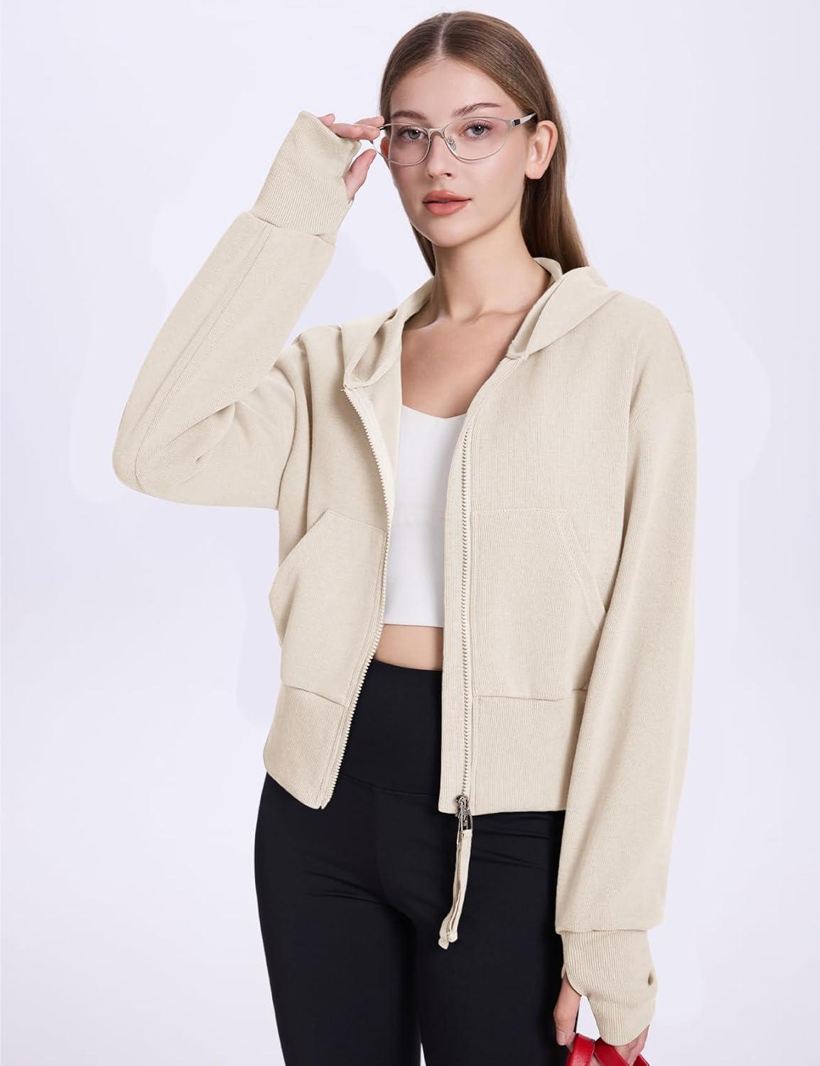 Flygo Women’s Cropped Zip Up Hoodie Long Sleeve Drop Shoulder Sweatshirts Casual Ribbed Hem Workout Top Jacket with Pockets(Beige)