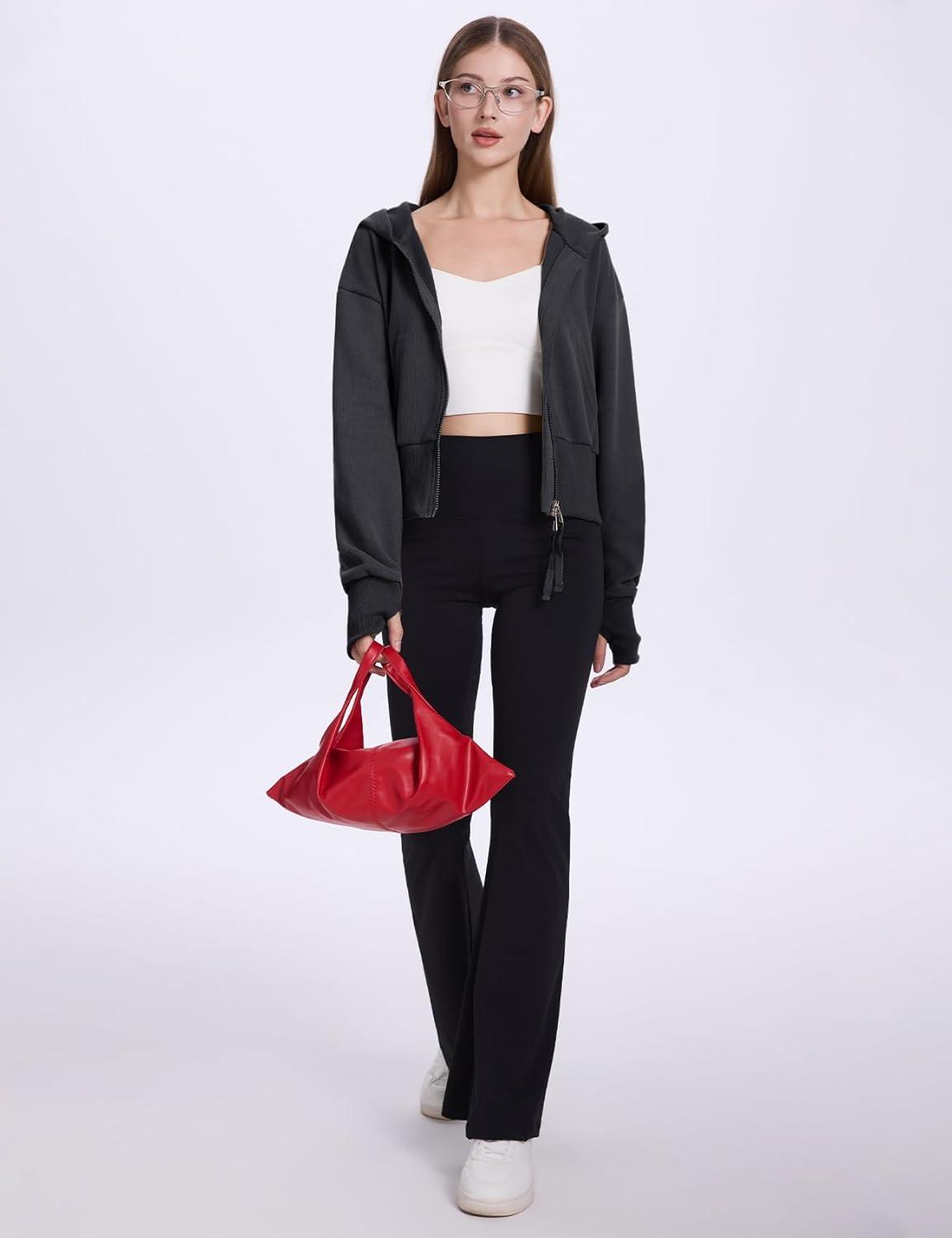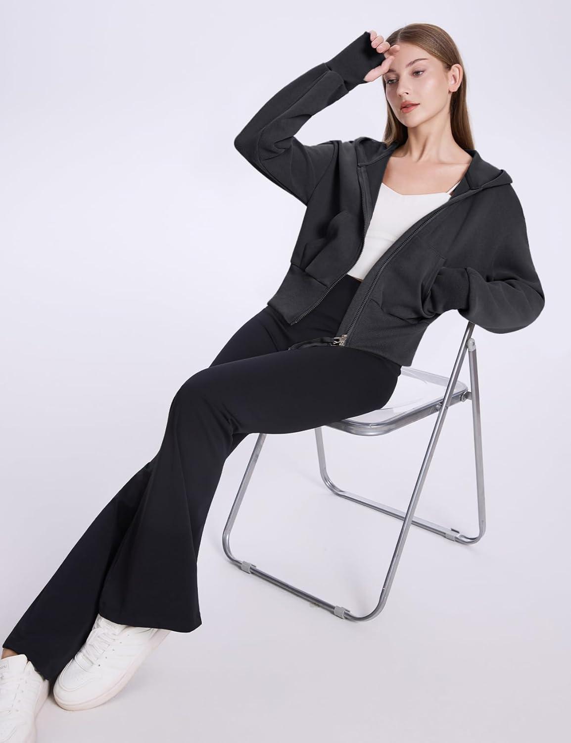 Flygo Women’s Cropped Zip Up Hoodie Long Sleeve Drop Shoulder Sweatshirts Casual Ribbed Hem Workout Top Jacket with Pockets(Black)