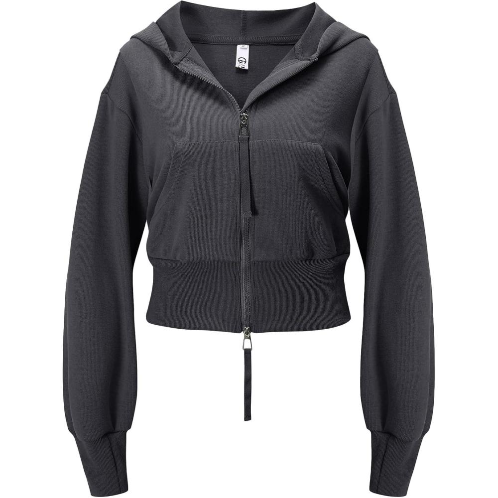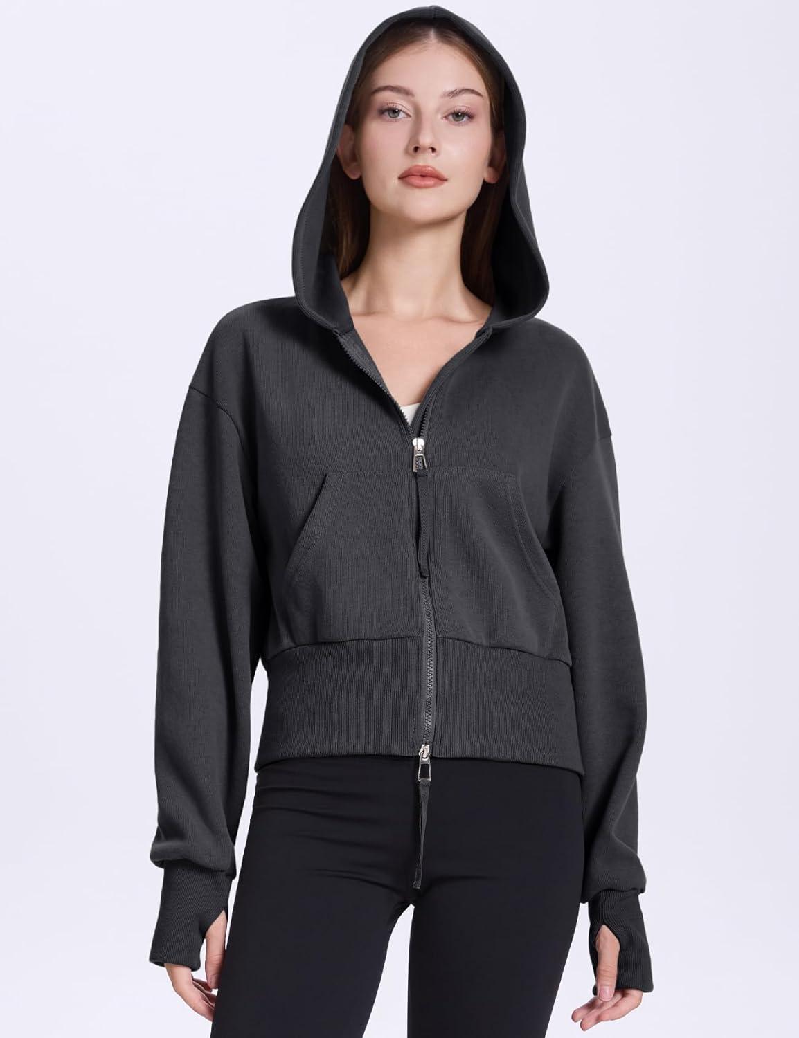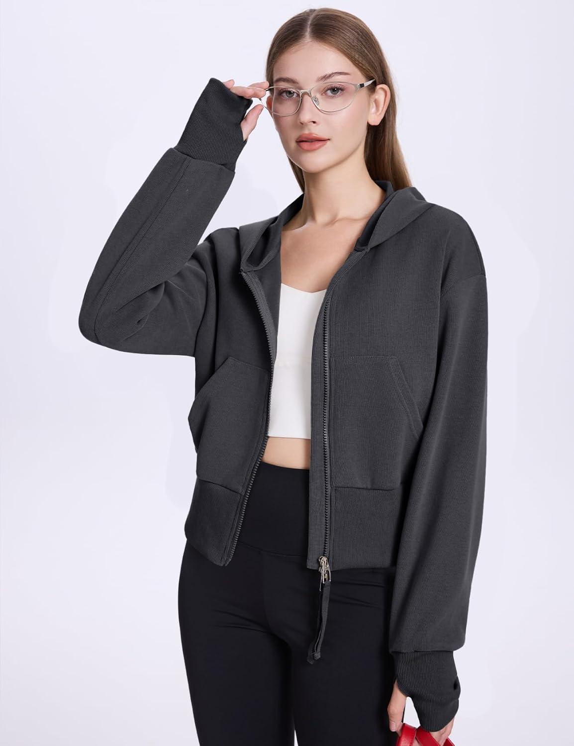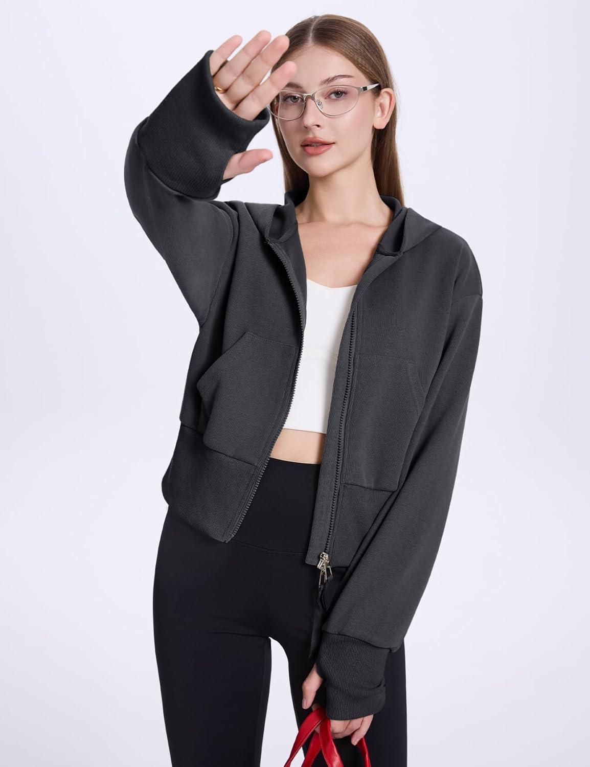 Flygo Women’s Cropped Zip Up Hoodie Long Sleeve Drop Shoulder Sweatshirts Casual Ribbed Hem Workout Top Jacket with Pockets(Dark Grey)