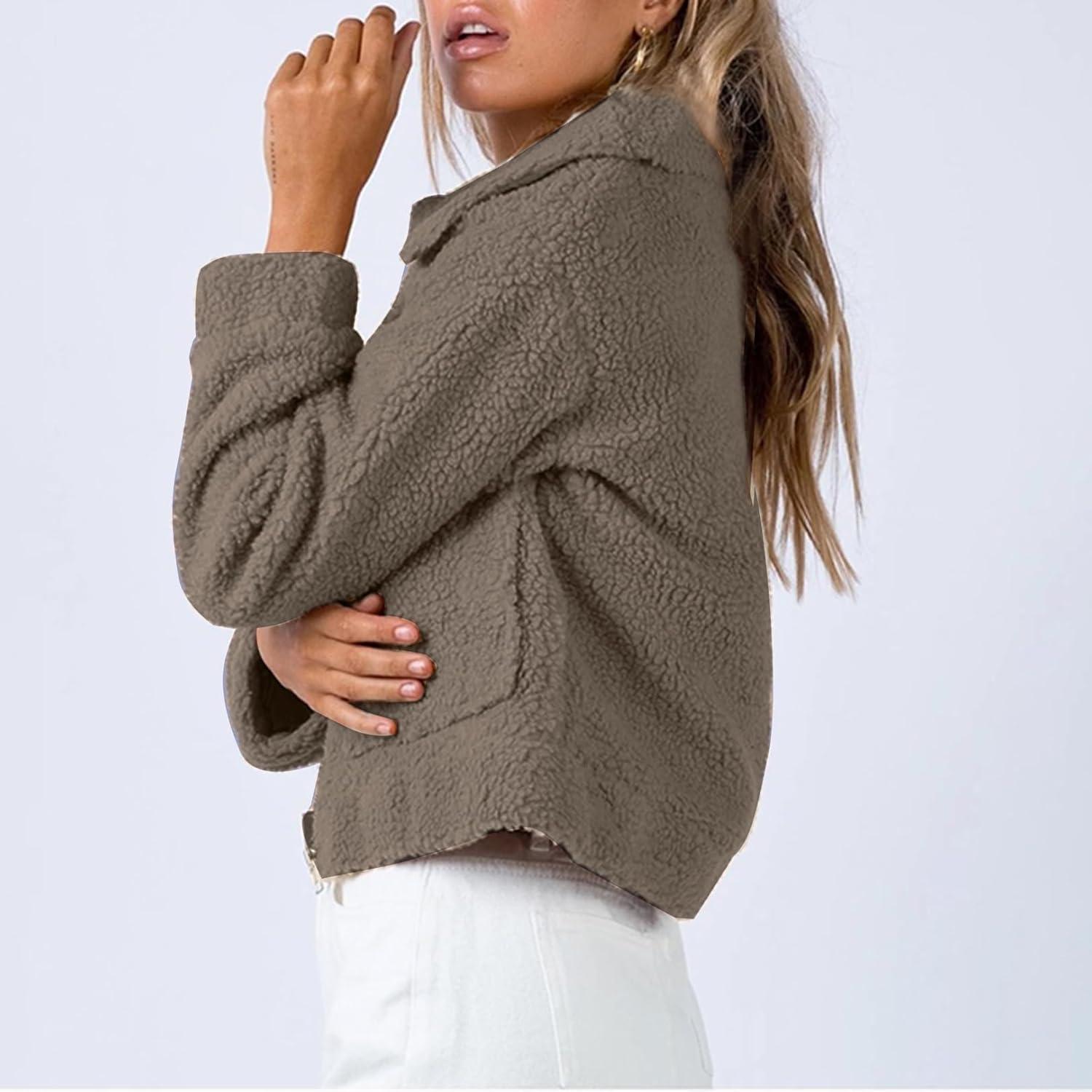 Flygo Womens Cropped Zip Up Lapel Shaggy Teddy Fleece Jacket Faux Fur Coat(Brown)
