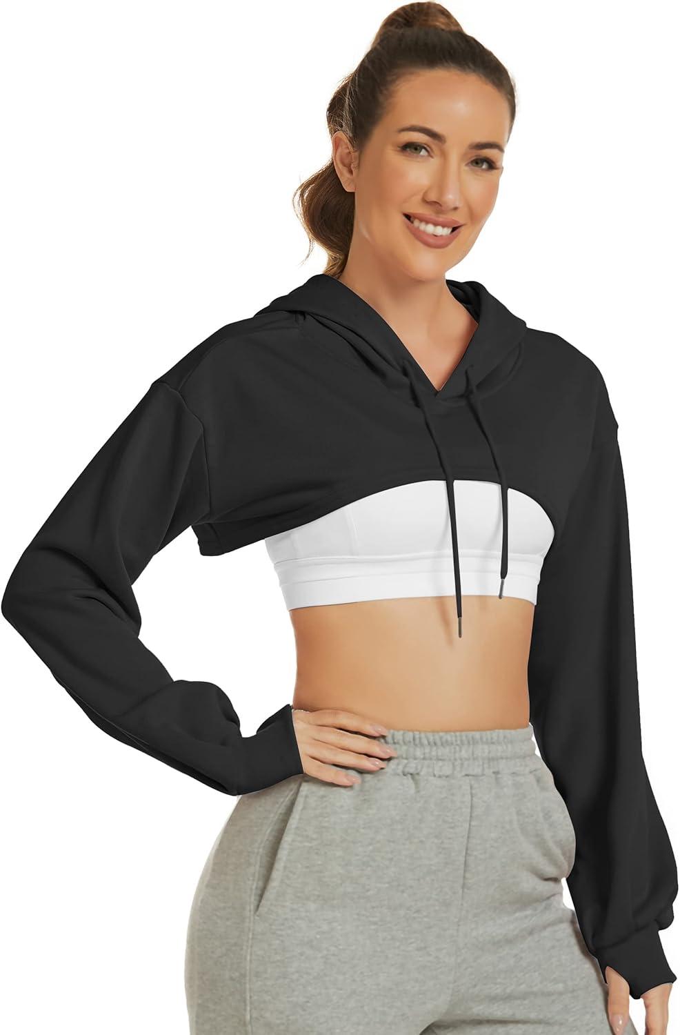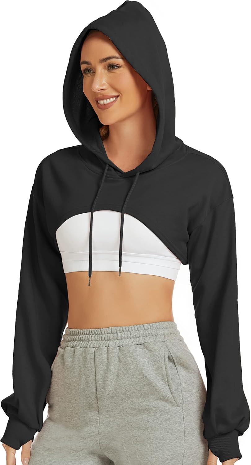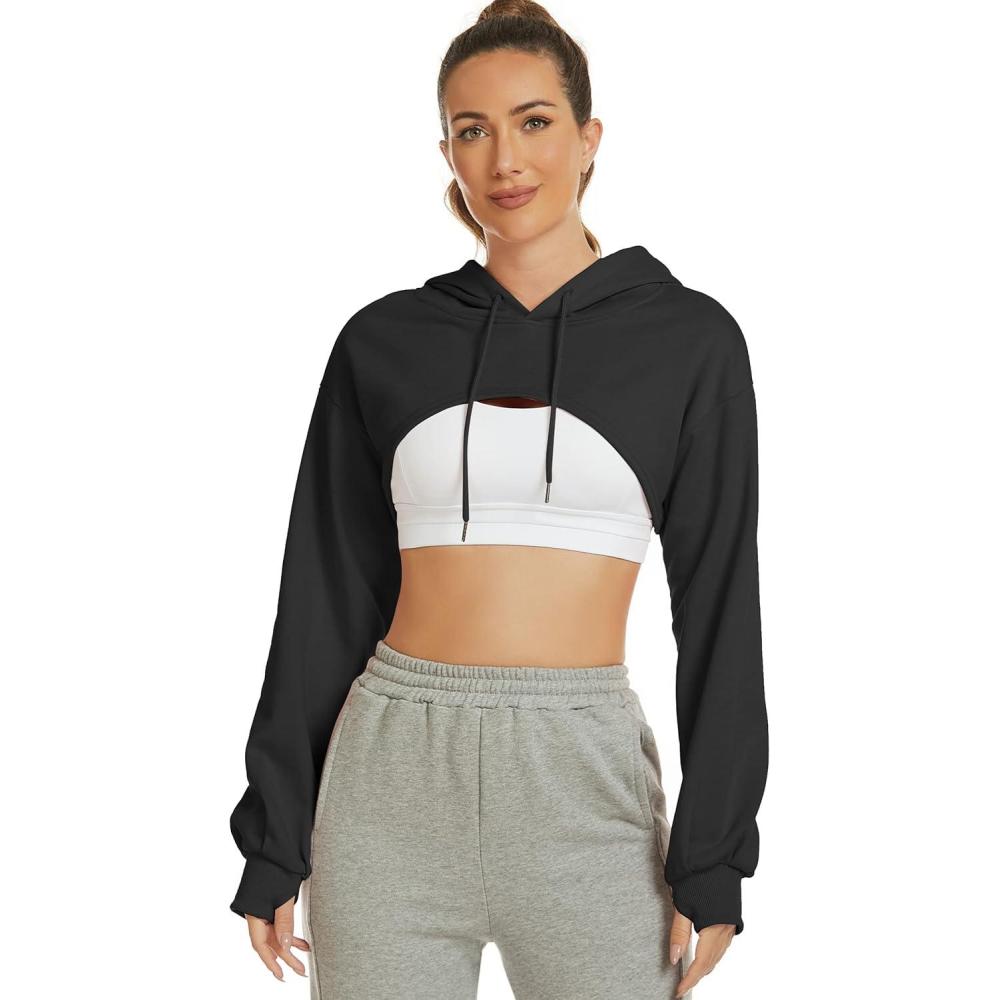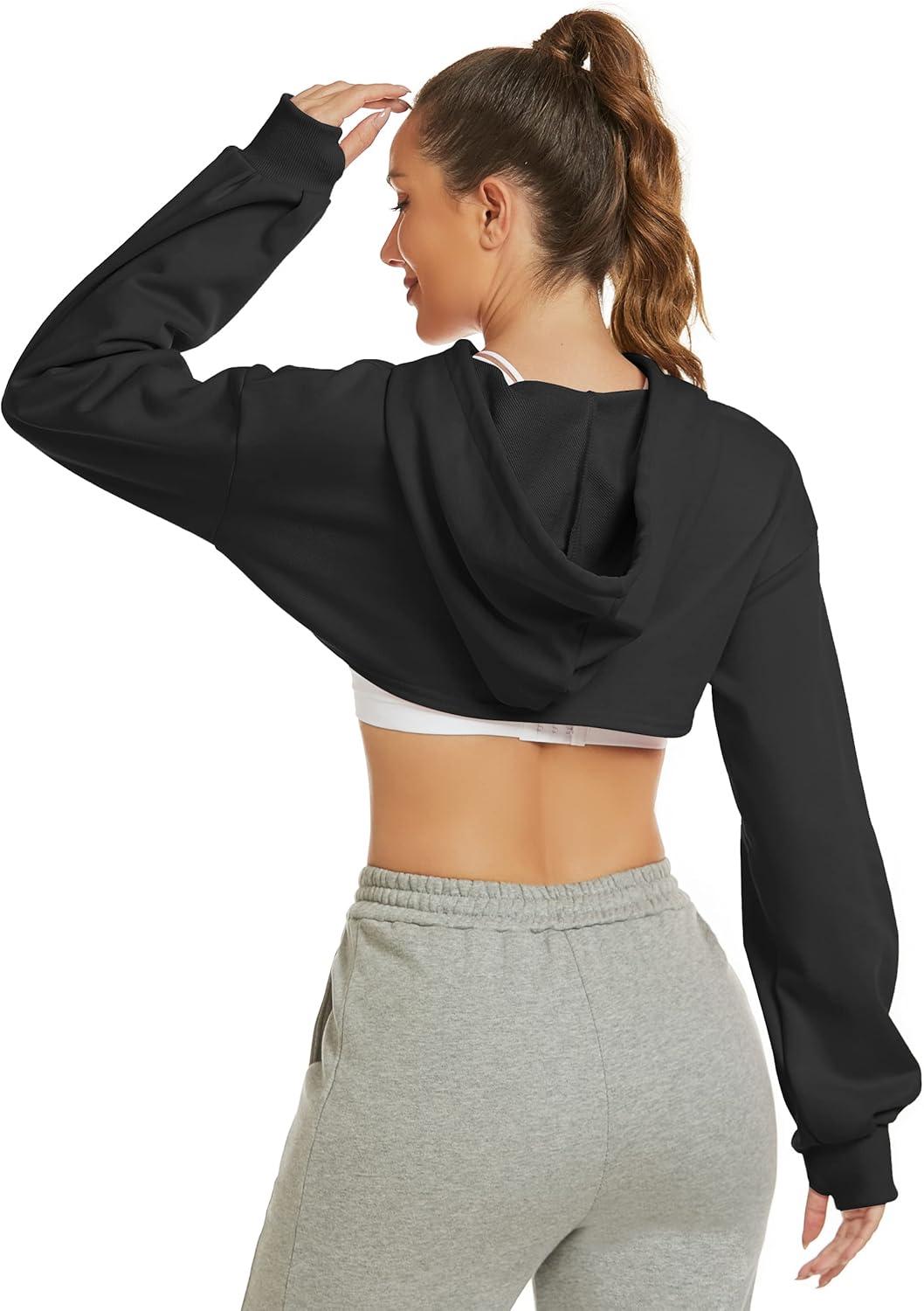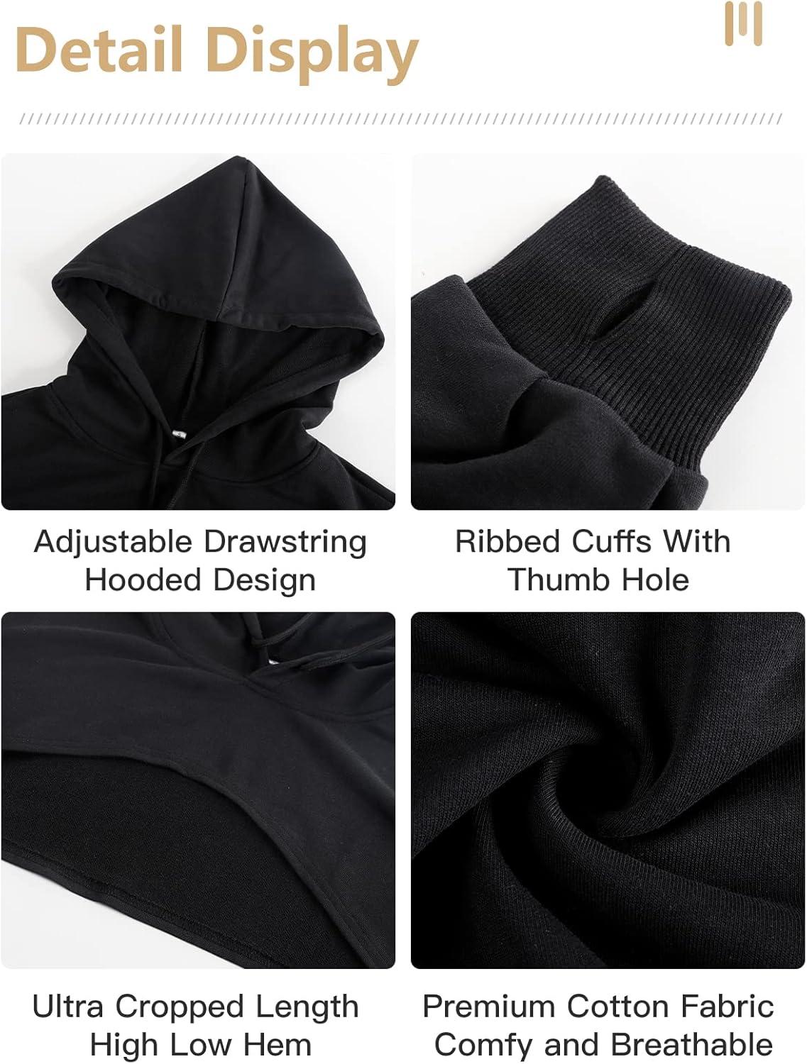 Flygo Women’s Cut Out Super Cropped Hoodie Long Sleeve Hooded Sweatshirt Pullover Active Top(01 Black)