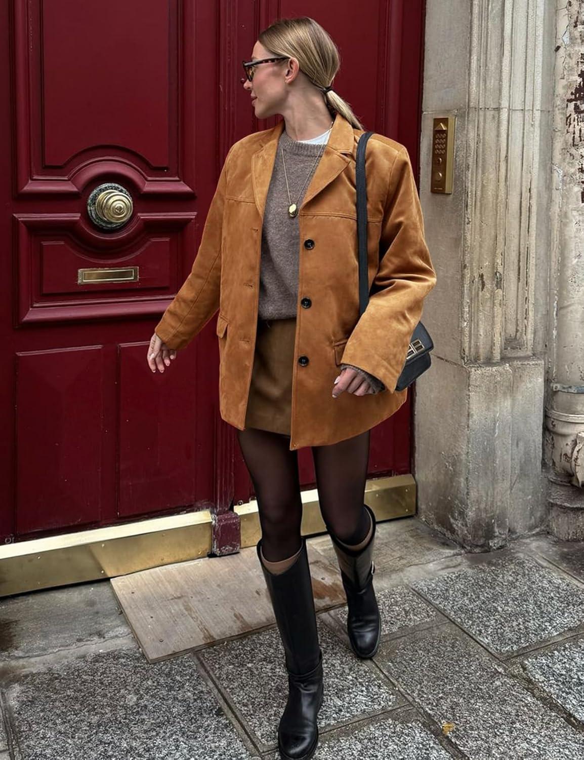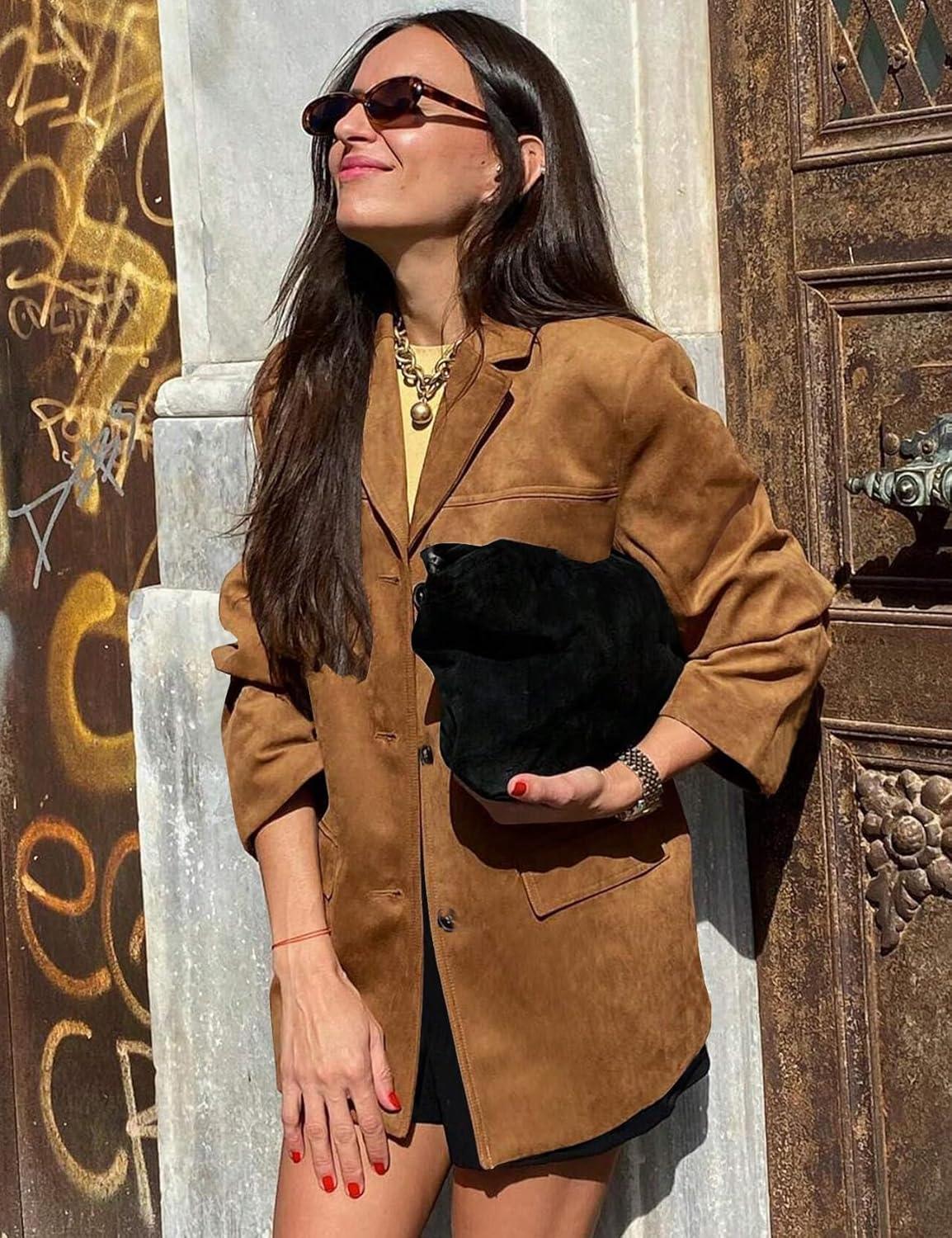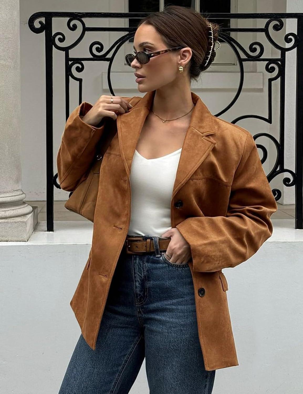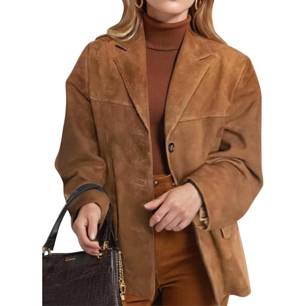 Flygo Womens Faux Suede Blazer Jacket Vintage Long Sleeve Button Down Casual Blazer Business Work Outfits(Brown-S)