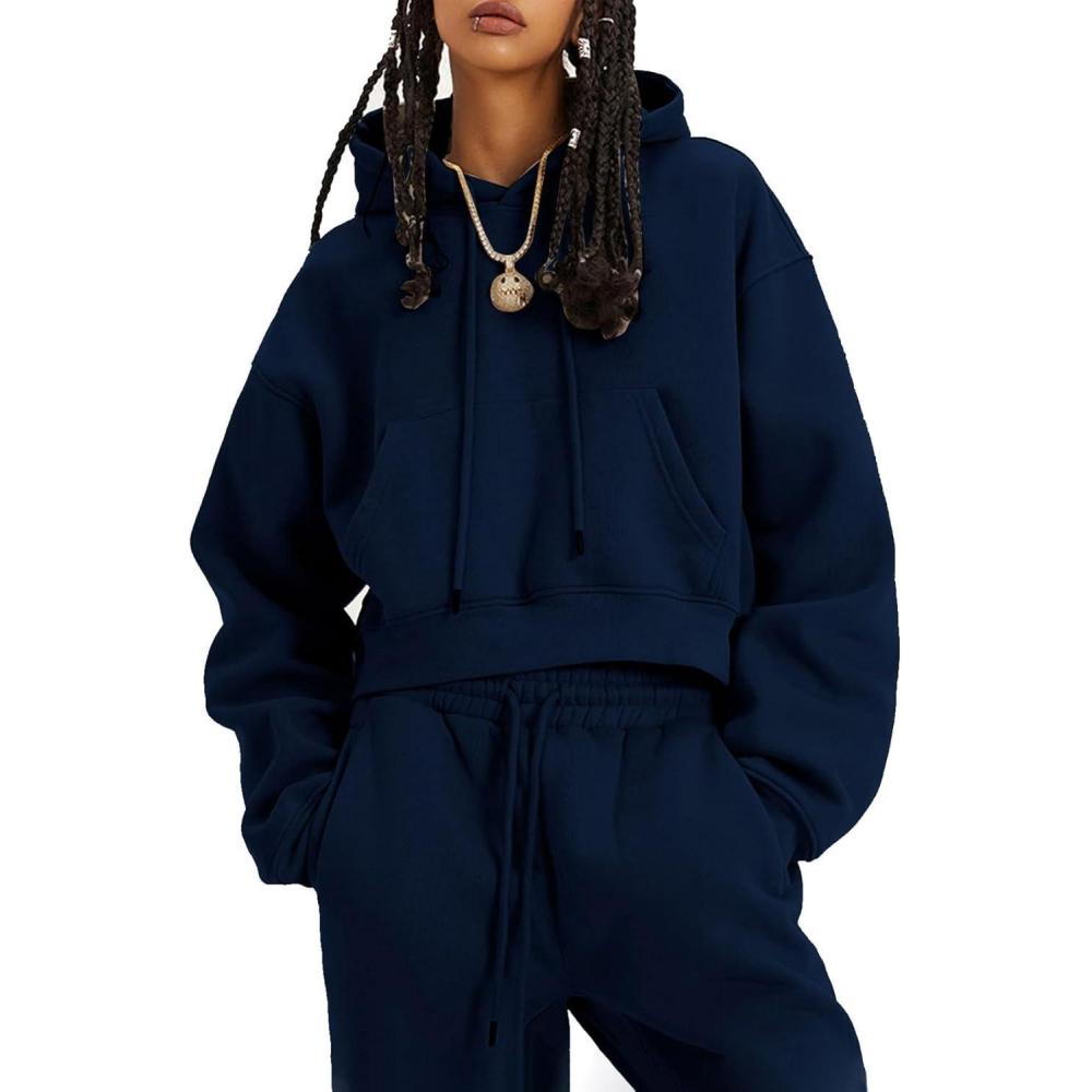Flygo Womens Fleece 2 Piece Outfits Sweatsuit Crop Pullover Sweatshirt Joggers Pants Tracksuit Set(Navyblue)