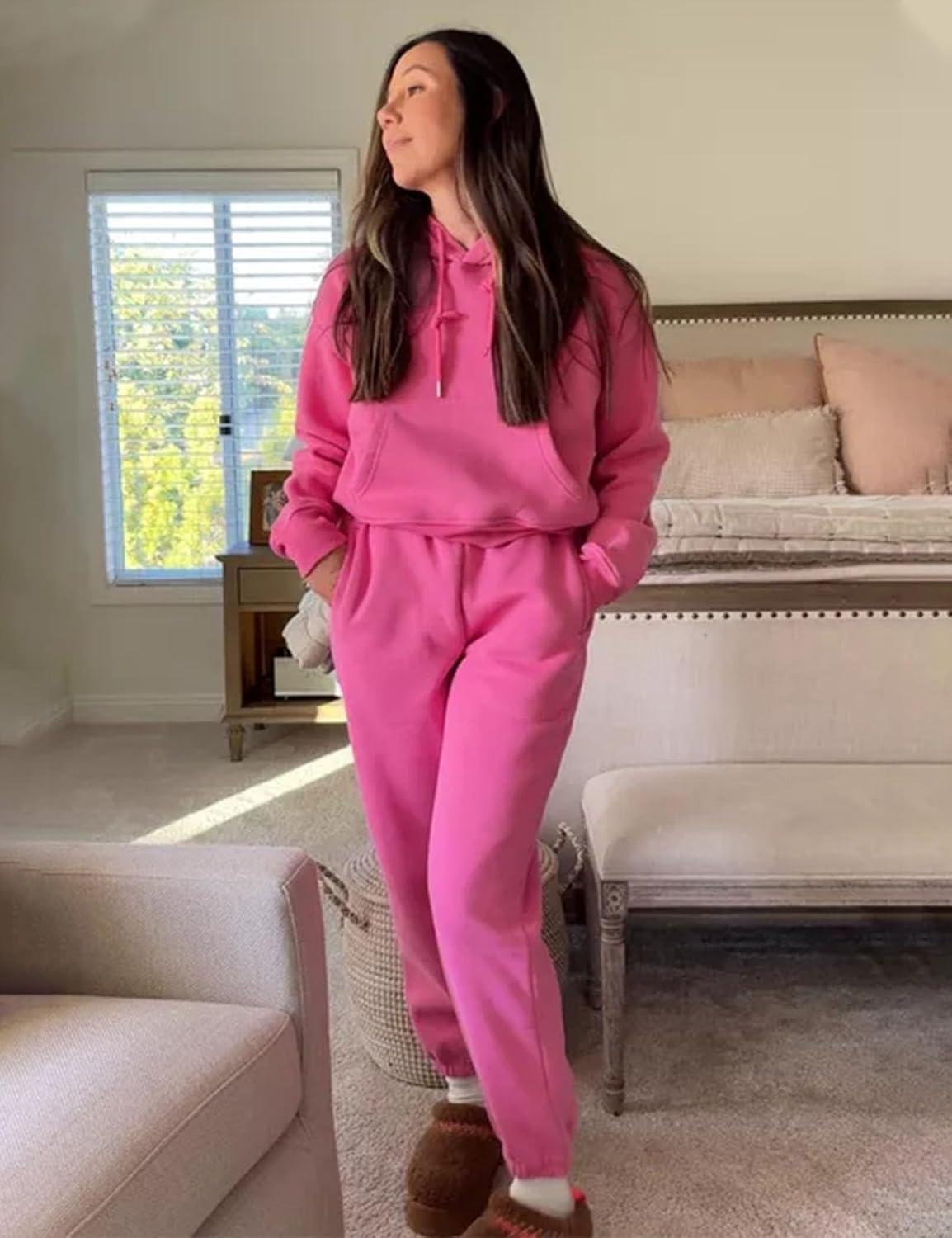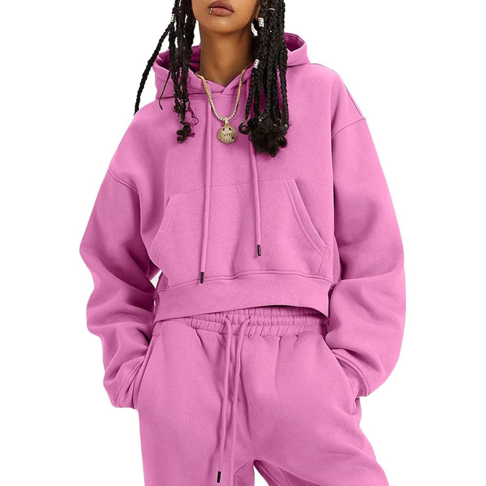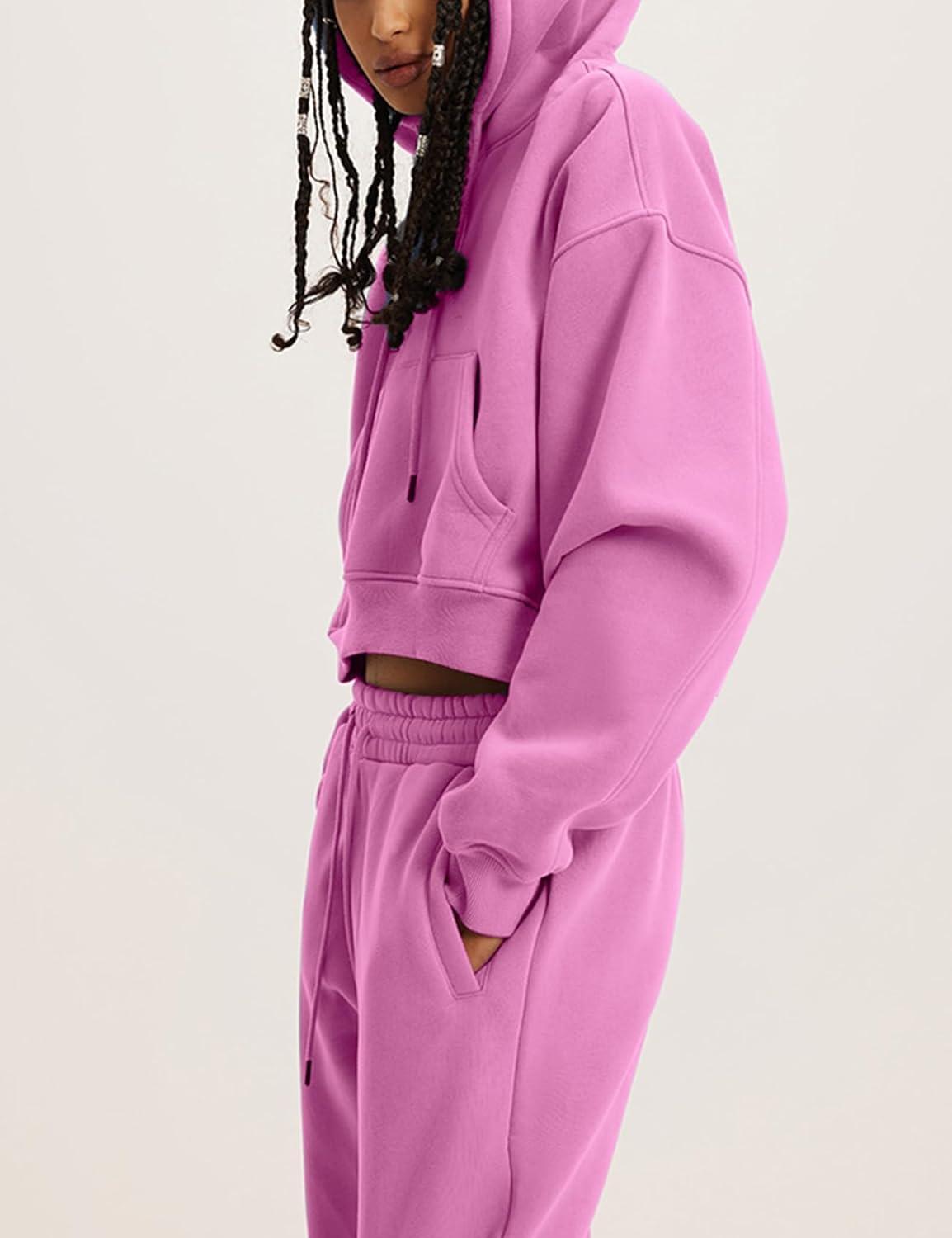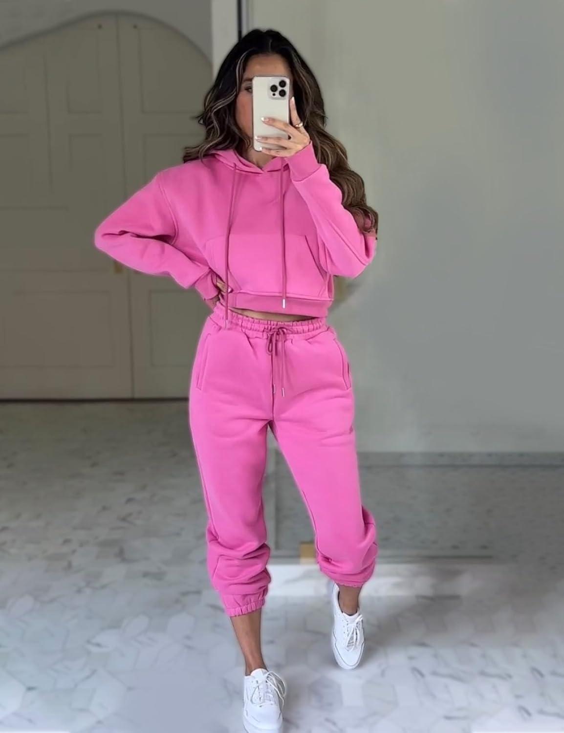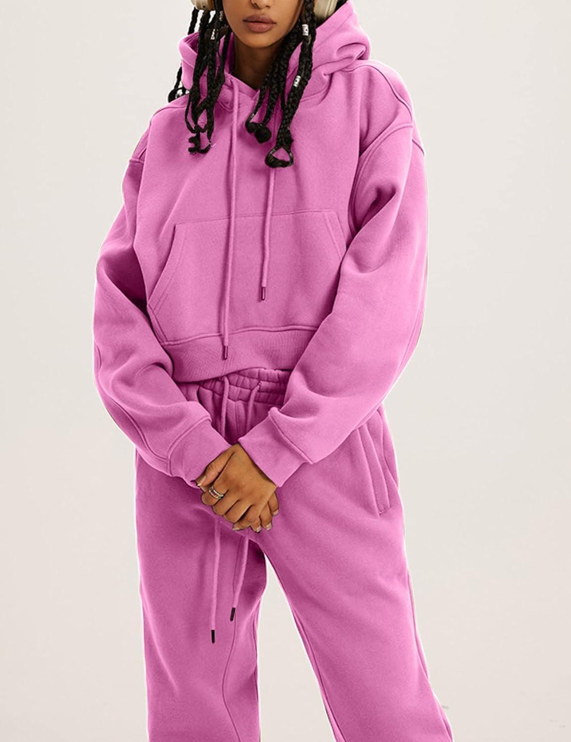 Flygo Womens Fleece 2 Piece Outfits Sweatsuit Crop Pullover Sweatshirt Joggers Pants Tracksuit Set(Rose)