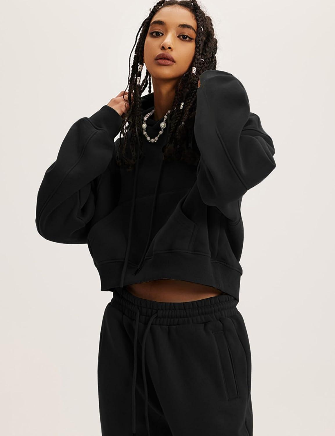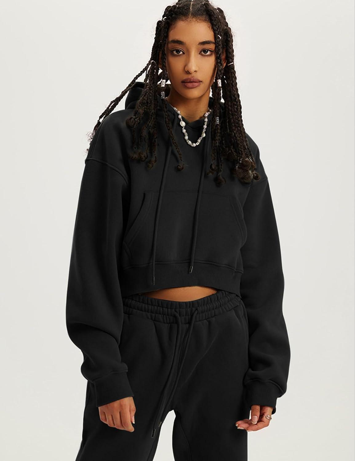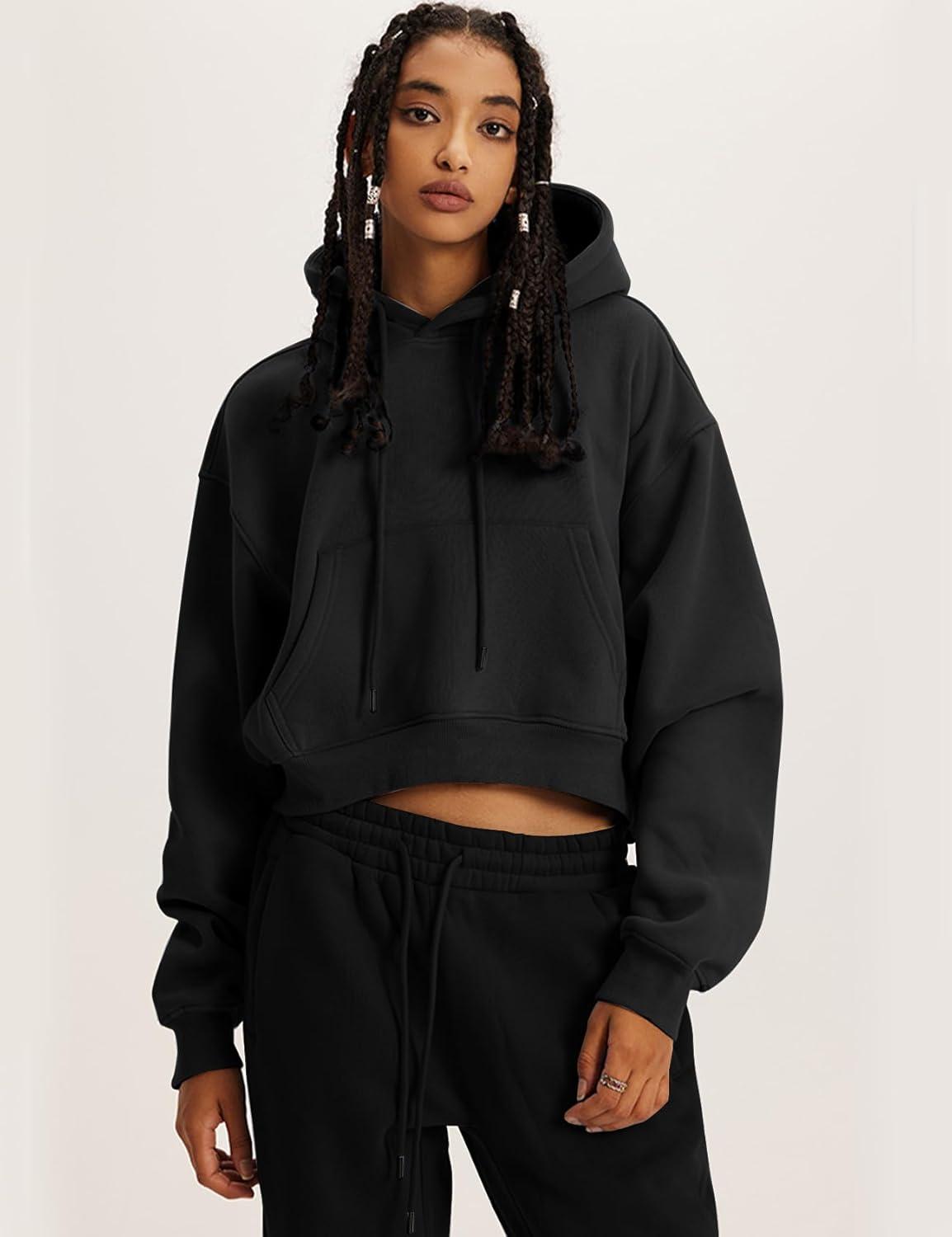 Flygo Womens Fleece Hoodie Sweatshirt Cropped Drawstring Hooded Crop Tops Pullover with Kangaroo Pocket(Black)