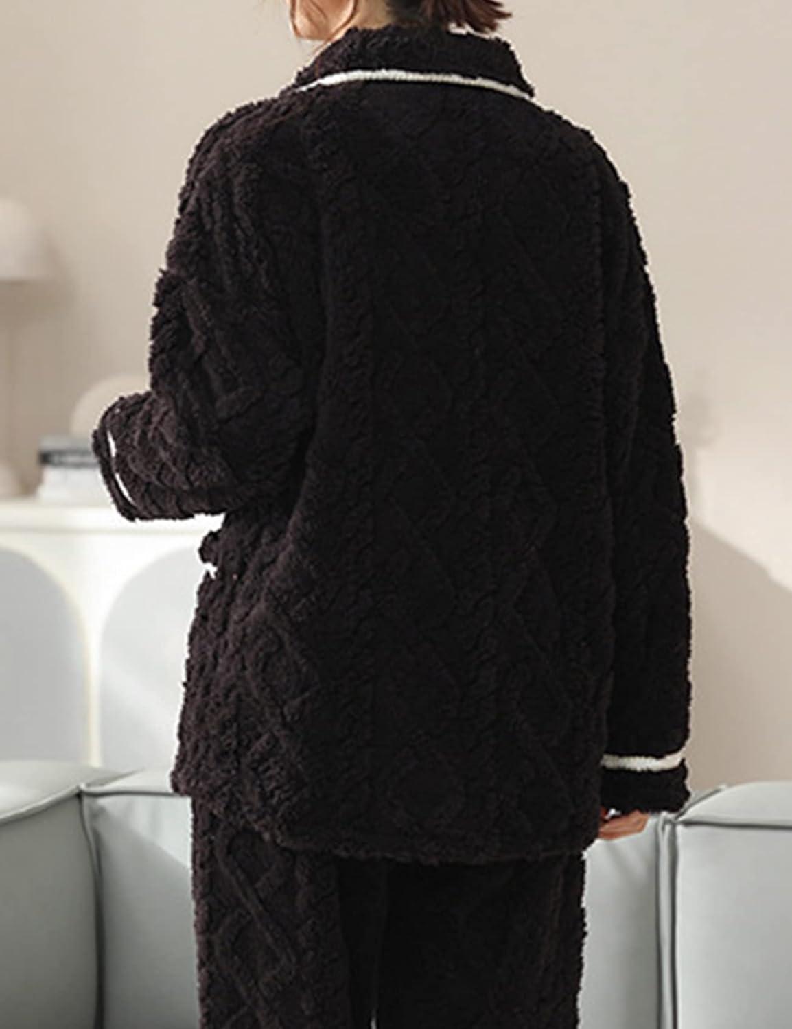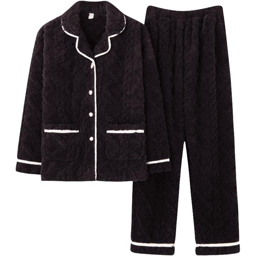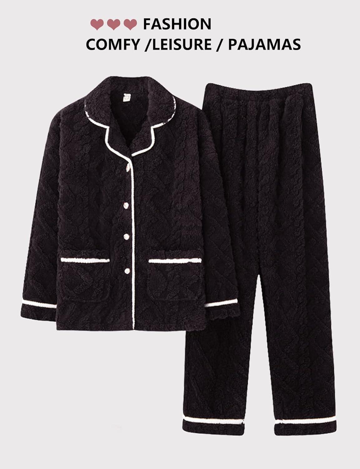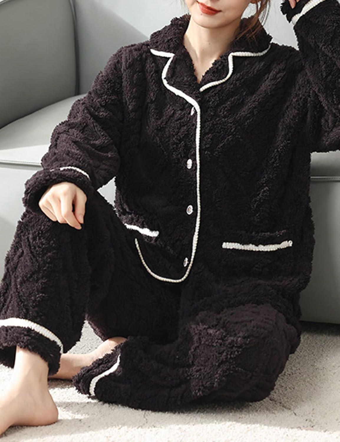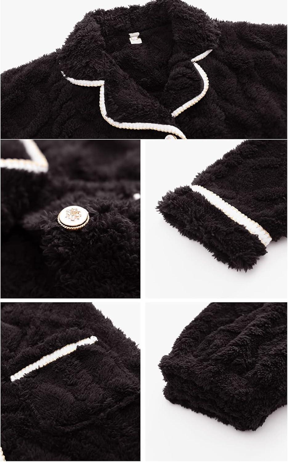 Flygo Women’s Fluffy Pajama Sets Fleece Warm Lapel Top and Pant Sleepwear Loungewear(Black)