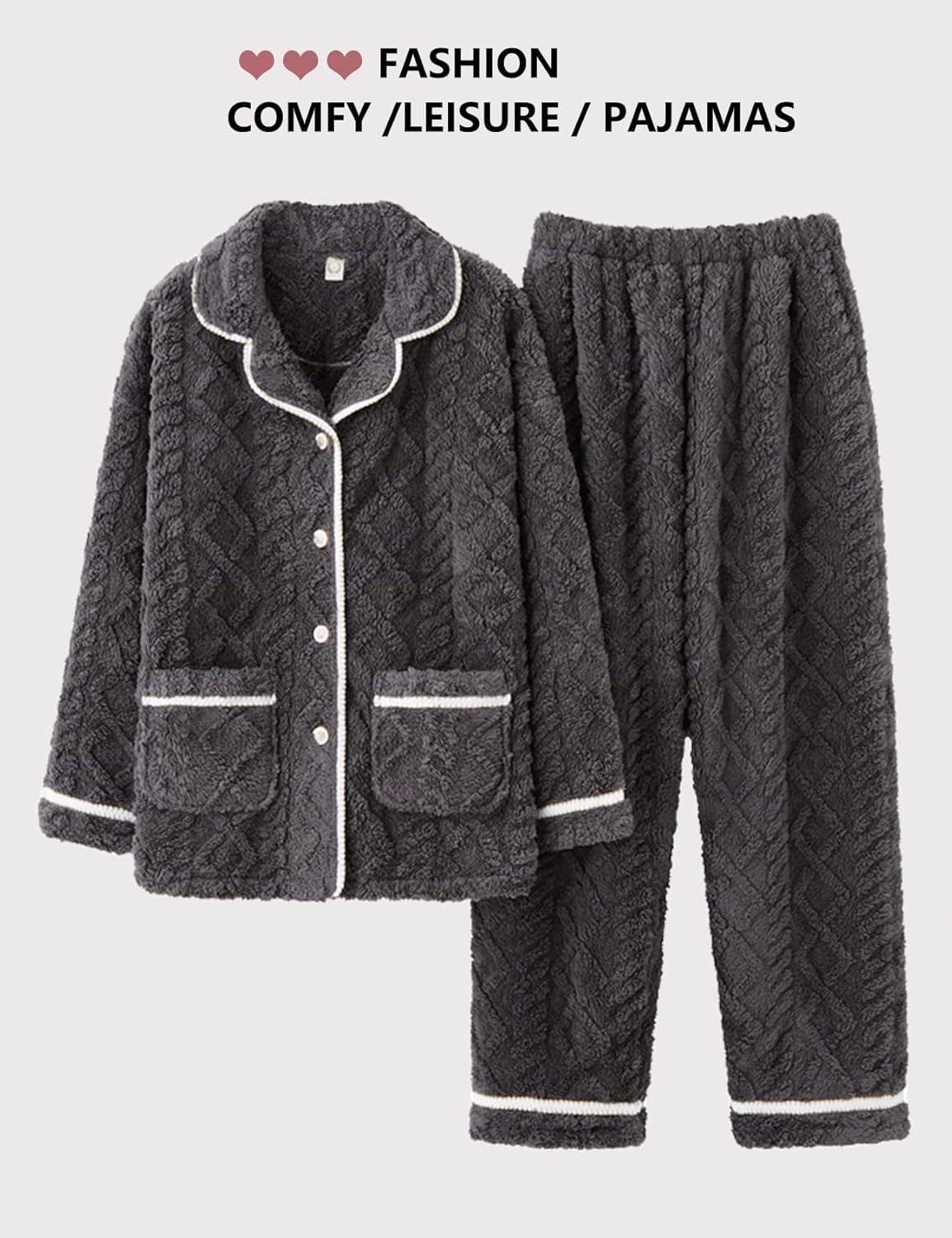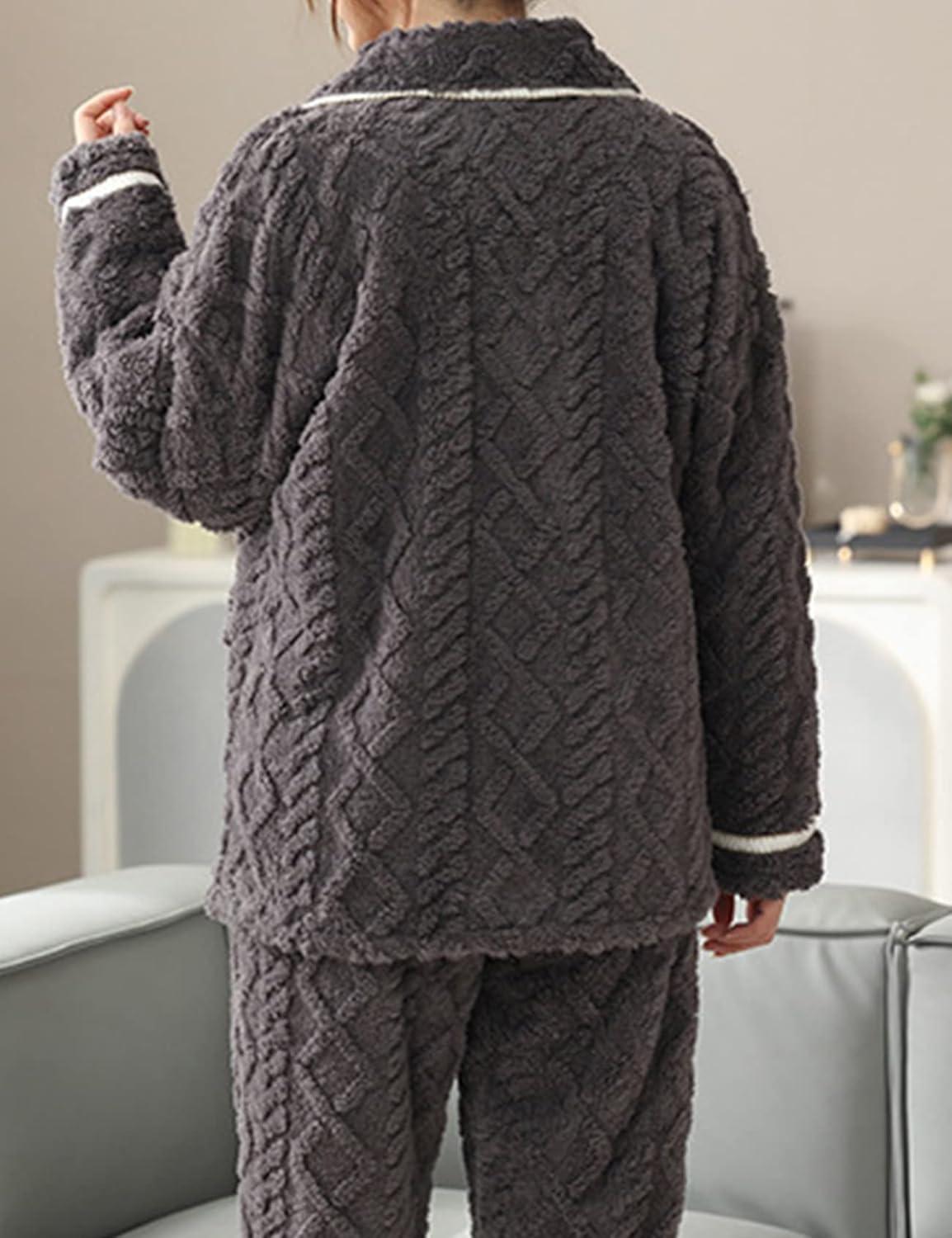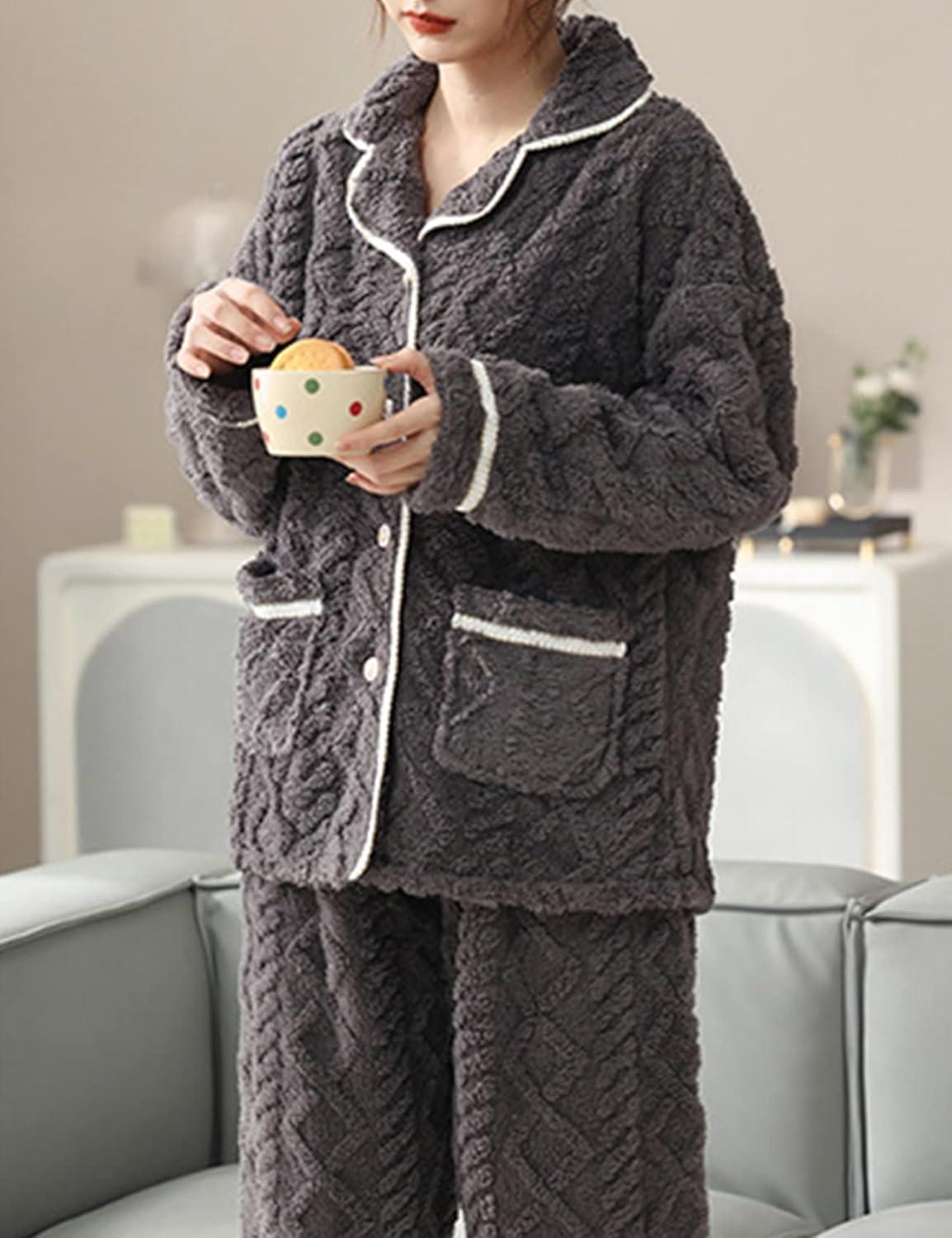 Flygo Women’s Fluffy Pajama Sets Fleece Warm Lapel Top and Pant Sleepwear Loungewear(Grey)