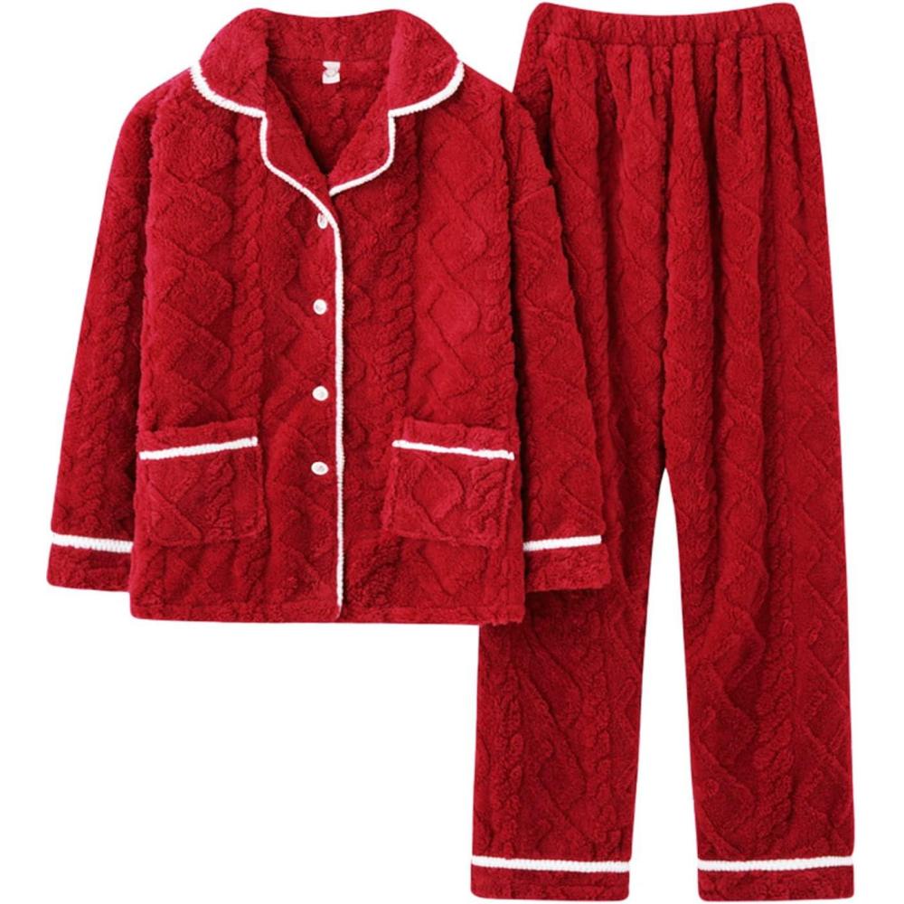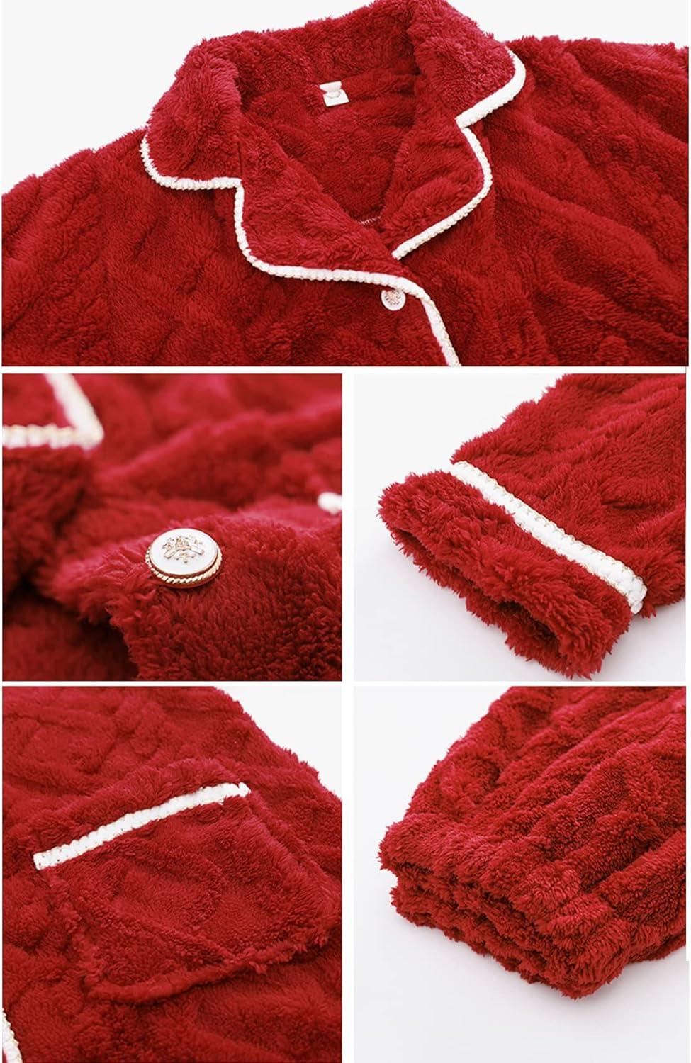 Flygo Women’s Fluffy Pajama Sets Fleece Warm Lapel Top and Pant Sleepwear Loungewear(Red)