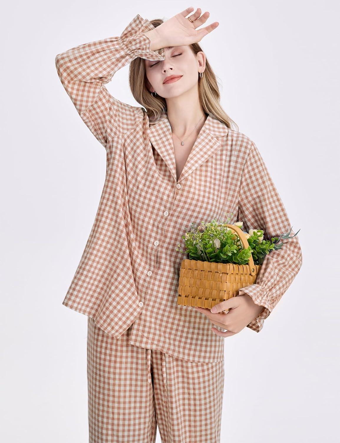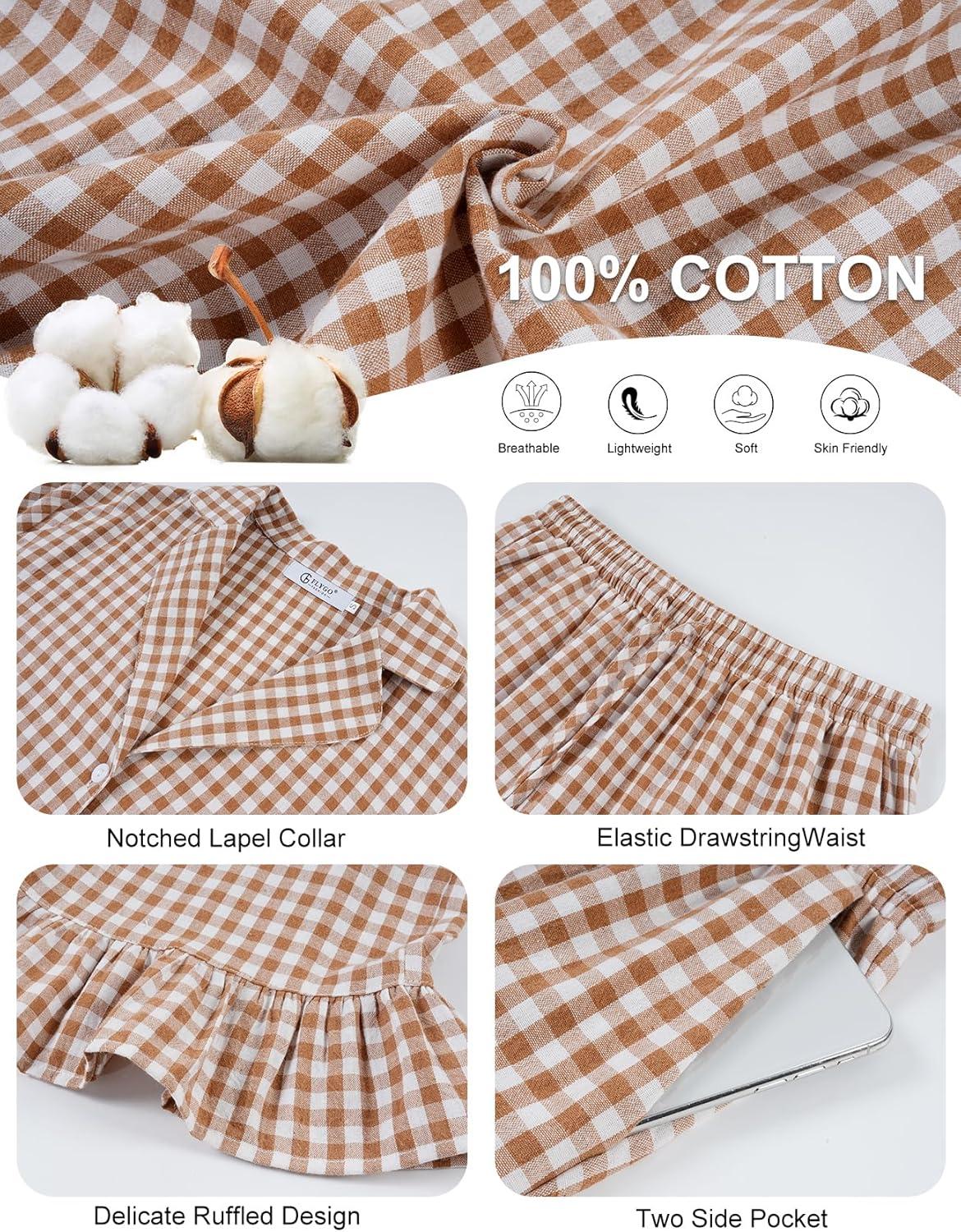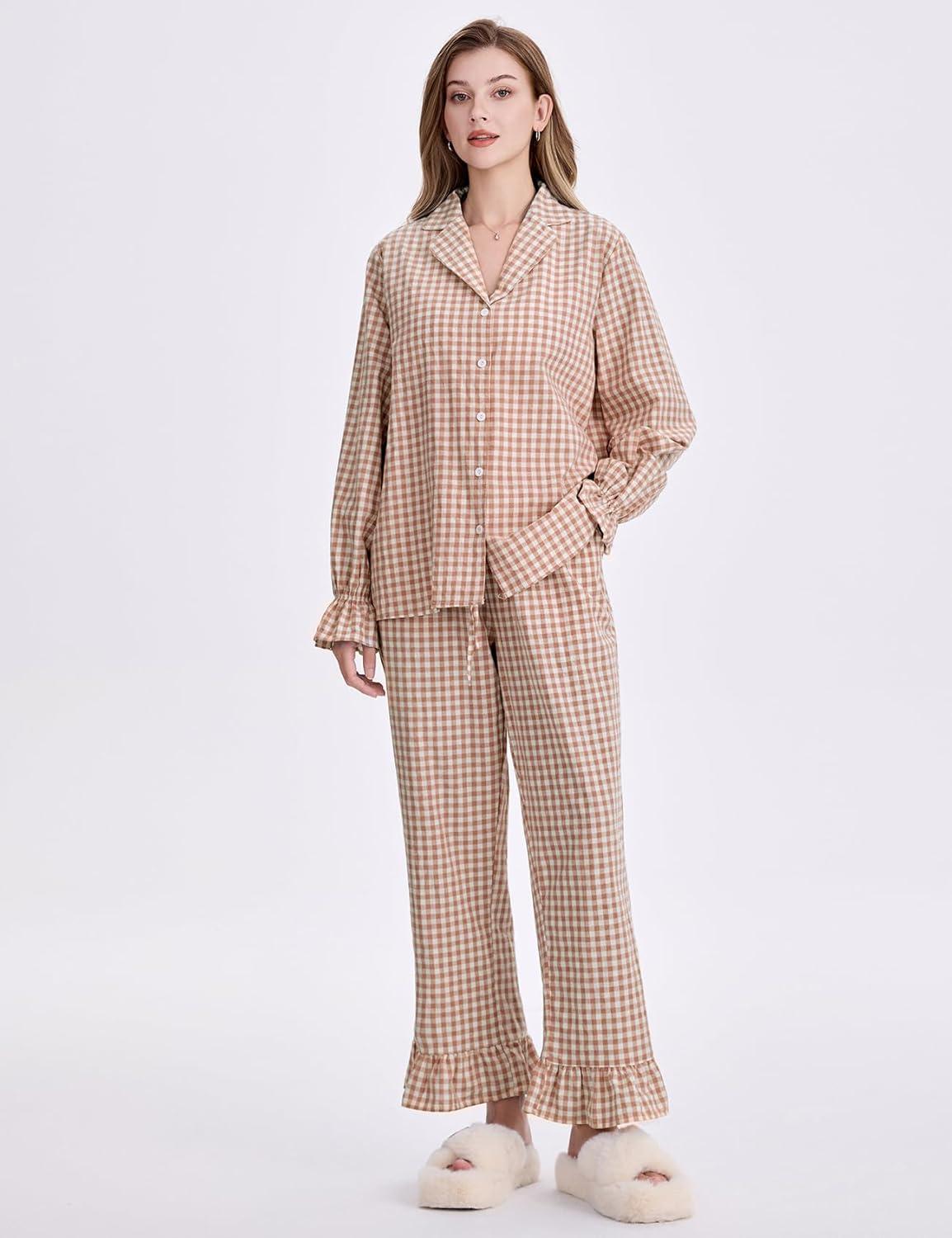 Flygo Womens Gingham Pajamas Sets Cotton Plaid Pjs Ruffled Sleeve Button Down Shirt Pants Y2k 2 Piece Lounge Set(Brown)