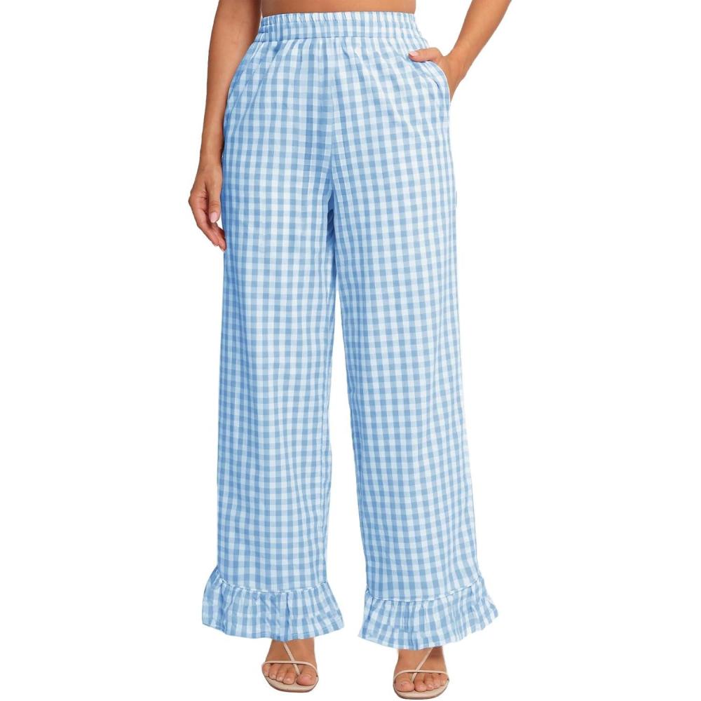 Flygo Women’s Gingham Pants Y2K Cotton Wide Leg Ruffle Hem Lounge Pants Plaid Elastic Wasited Trouser with Pockets(Blue)