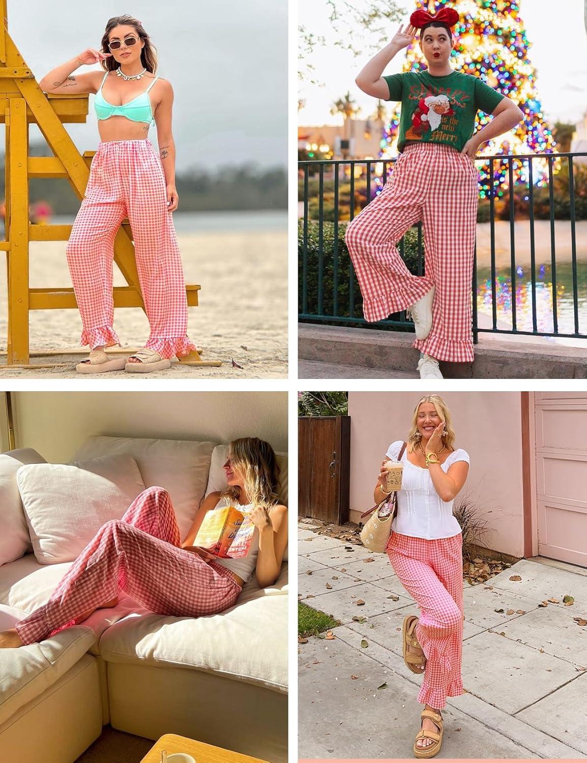 Flygo Women’s Gingham Pants Y2K Cotton Wide Leg Ruffle Hem Lounge Pants Plaid Elastic Wasited Trouser with Pockets(Pink)