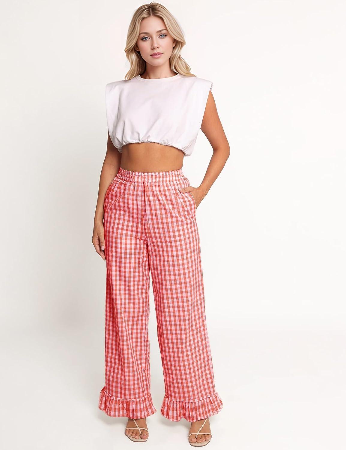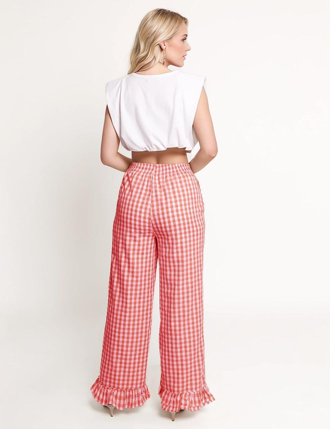 Flygo Women’s Gingham Pants Y2K Cotton Wide Leg Ruffle Hem Lounge Pants Plaid Elastic Wasited Trouser with Pockets(Orangered)