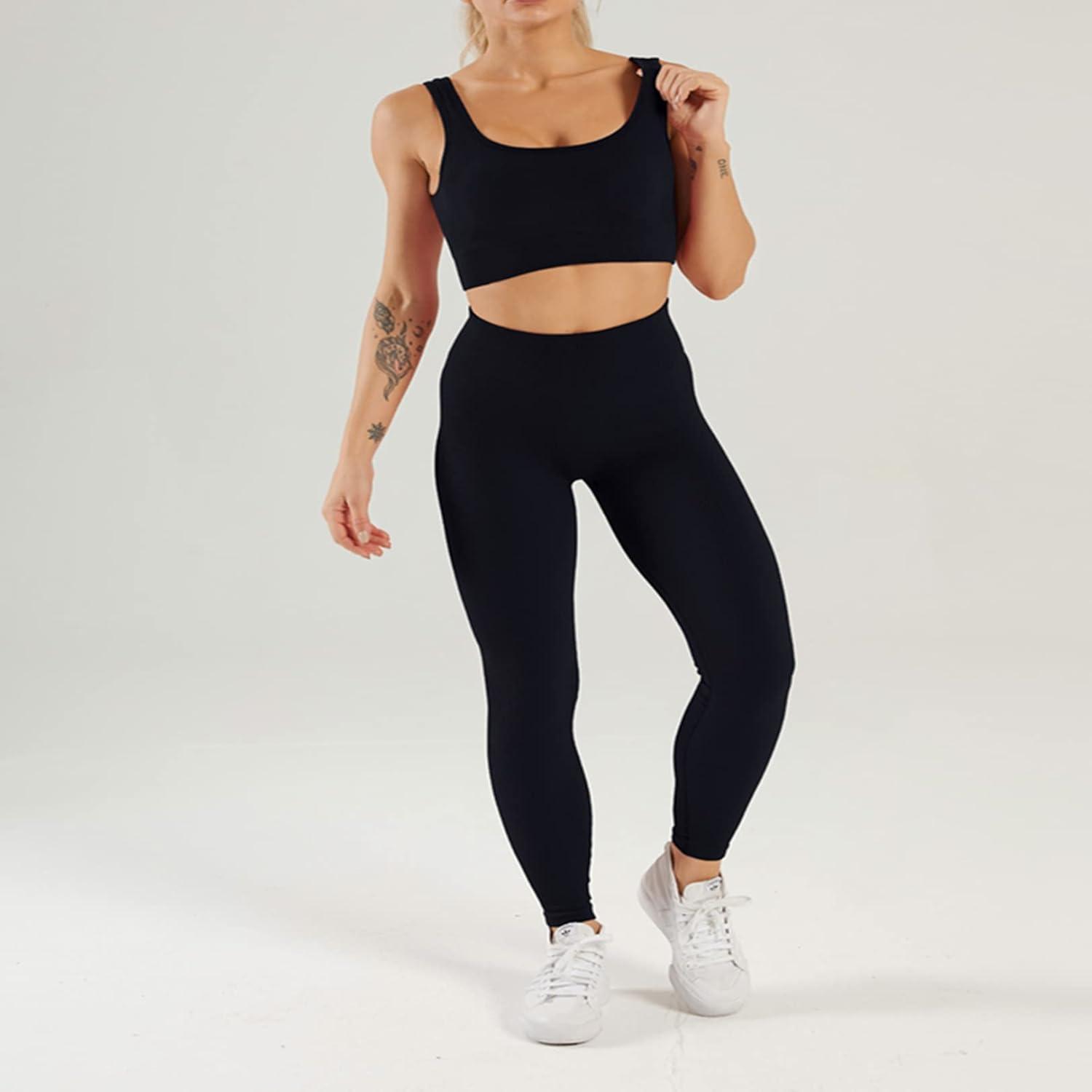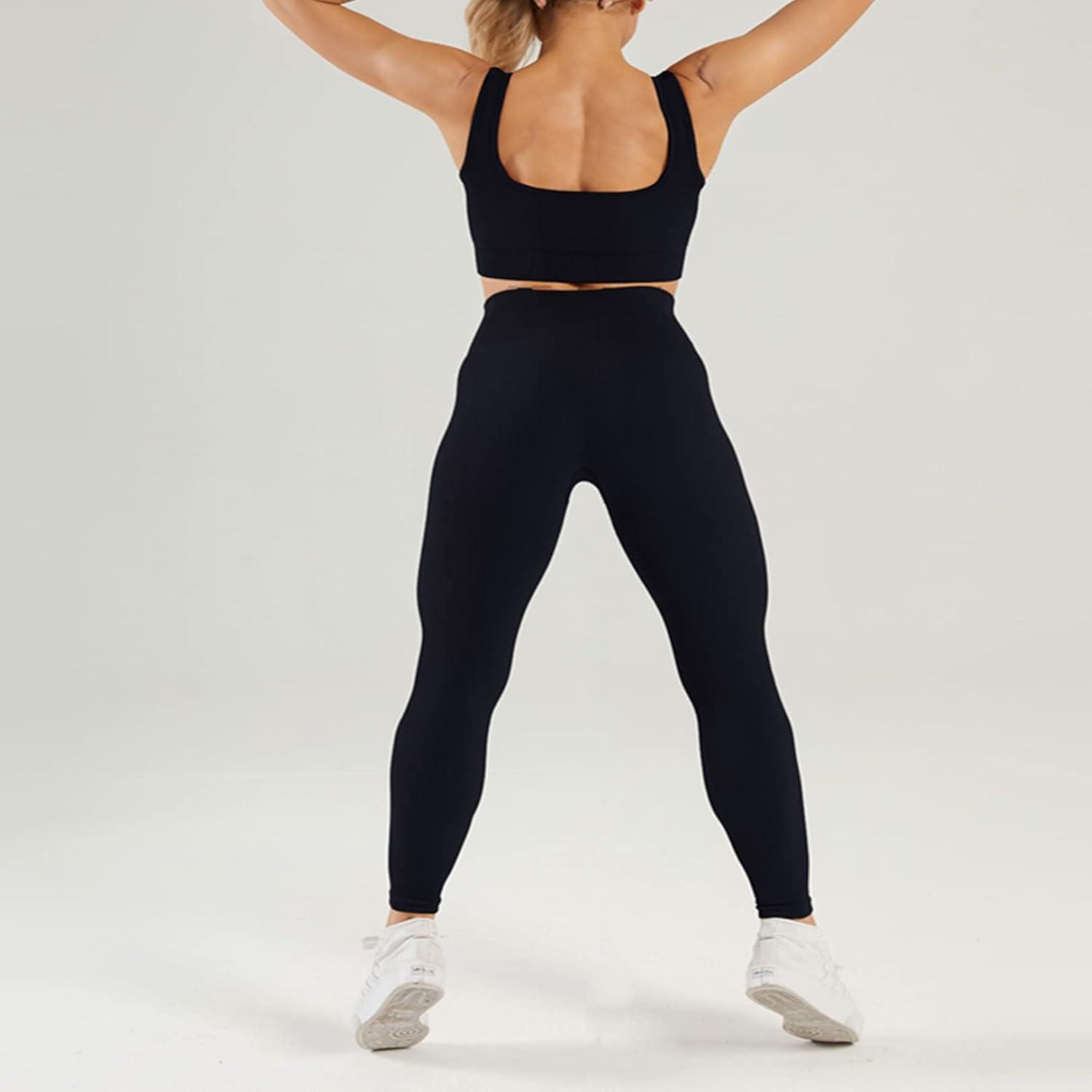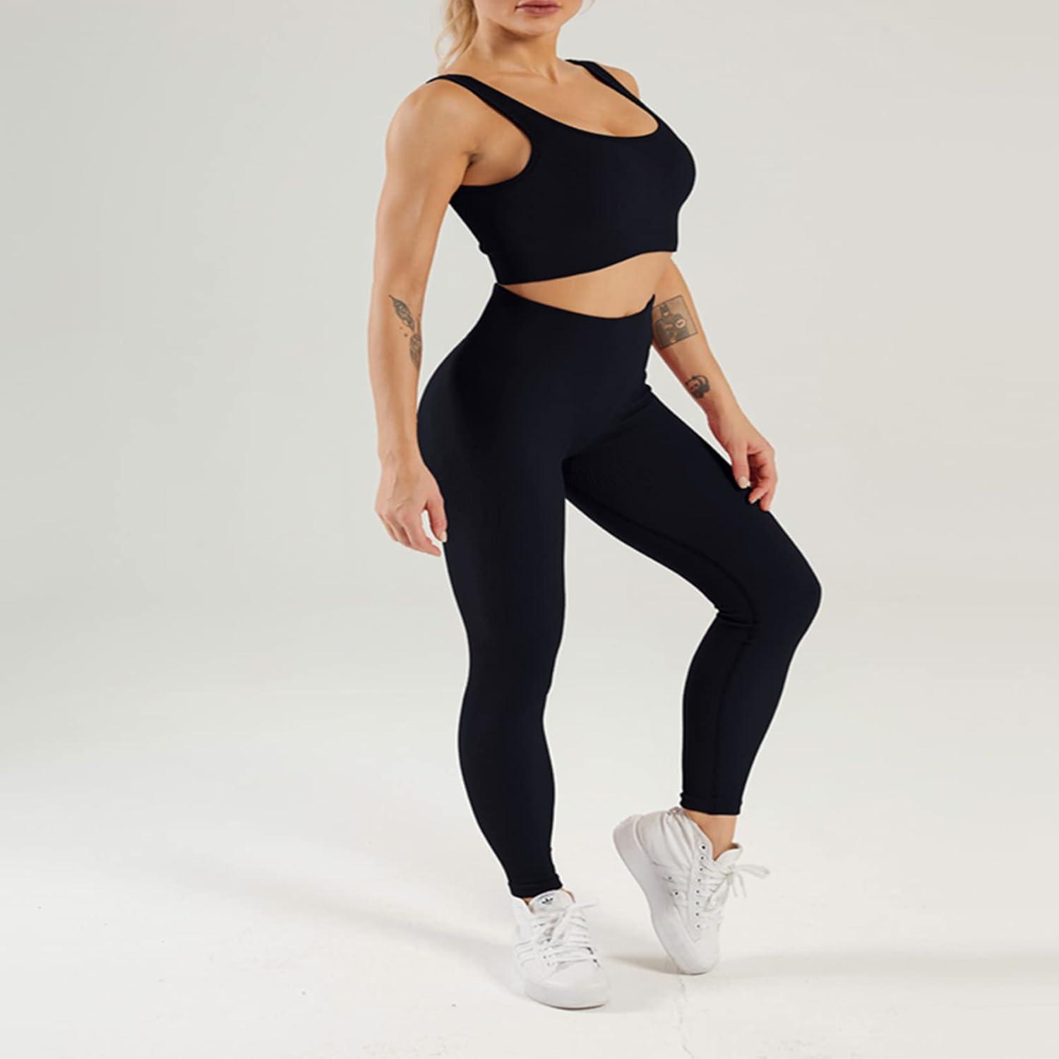 Flygo Womens Gym Yoga Outfits 2 Piece Ribbed Sports Bra High Waist Leggings Set Workout Tracksuits(Black)