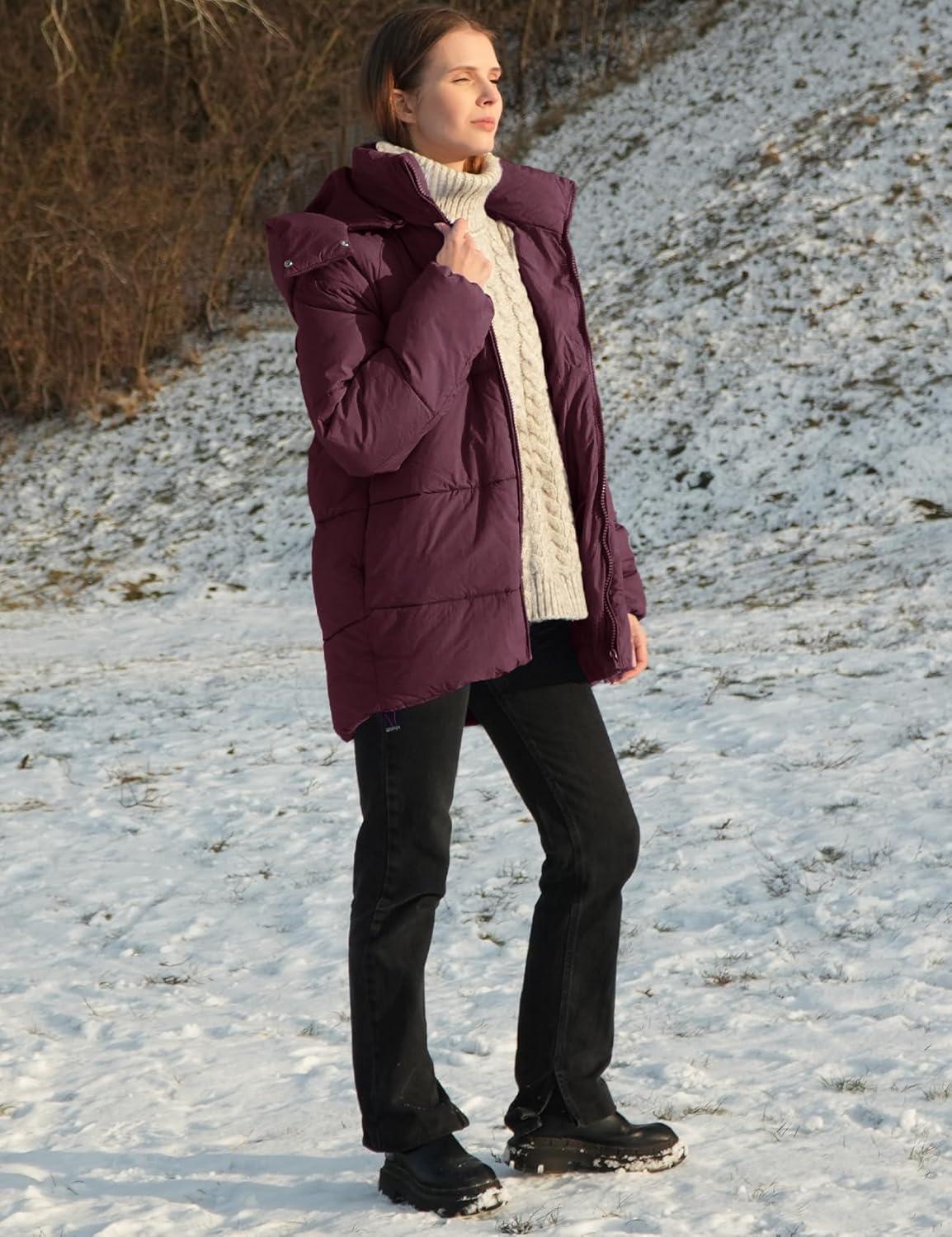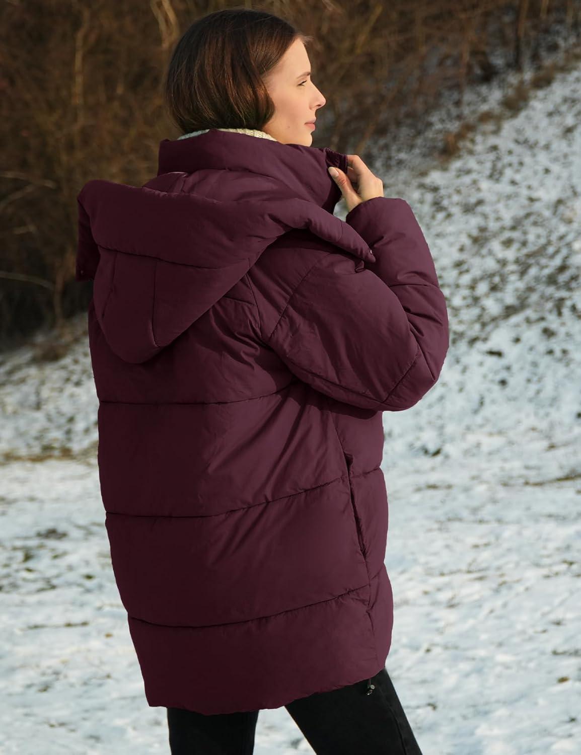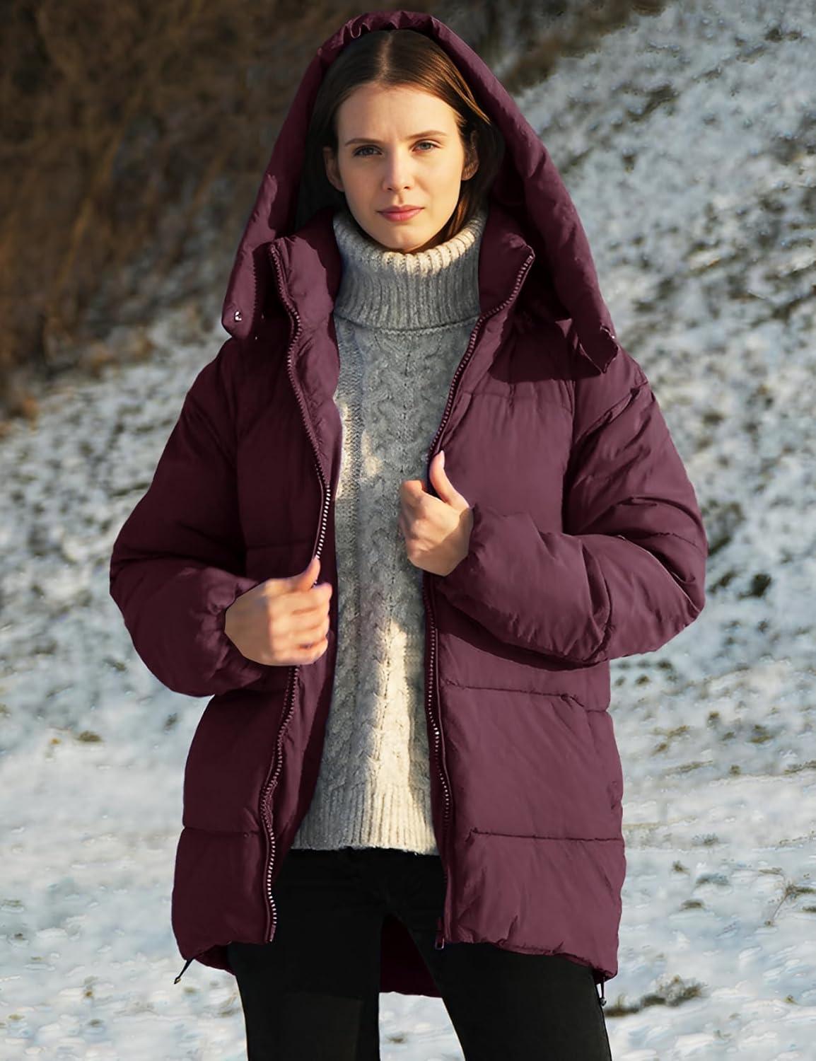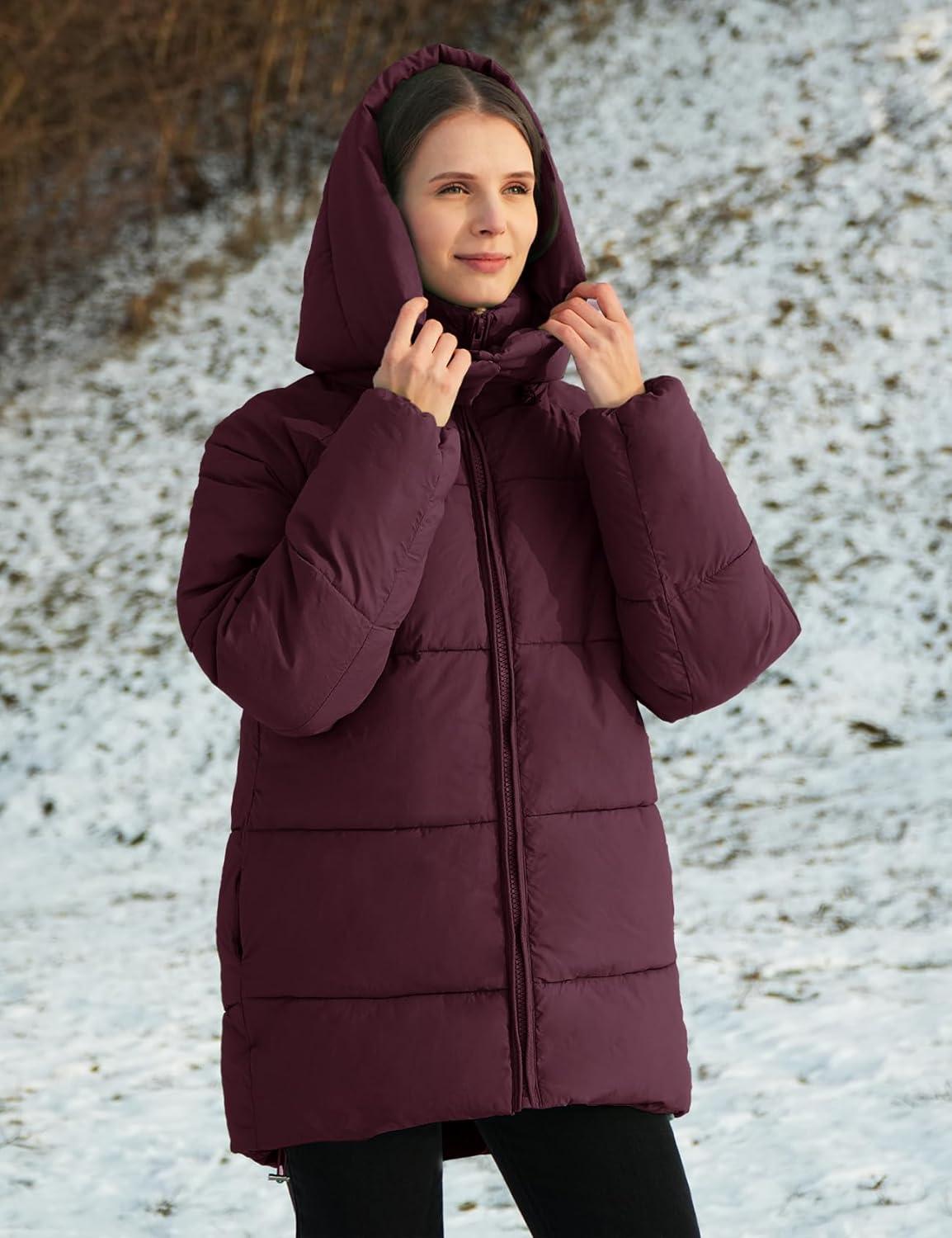 Flygo Womens Hooded Quilted Puffer Jacket Mid-Length Padded Warm Winter Heavyweight Coat Outerwear(Burgundy)