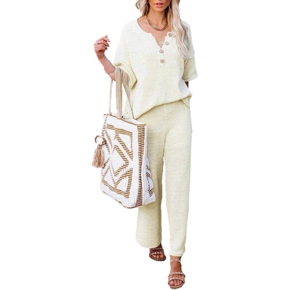 Women's 2 piece outfits sweatsuit knit short sleeve sweater wide leg pants loungewear must in your wardrobe.