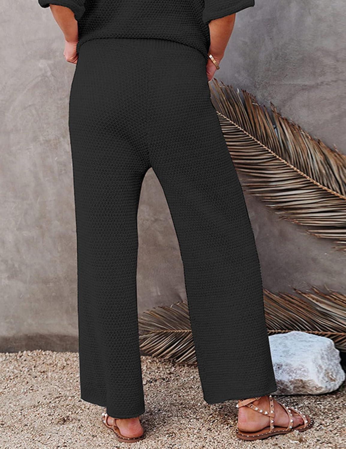 Flygo Womens Knit Two Piece Outfits Waffle Sweatsuit Short Sleeve Sweater Wide Leg Pants Loungewear Set (Black-XXL)