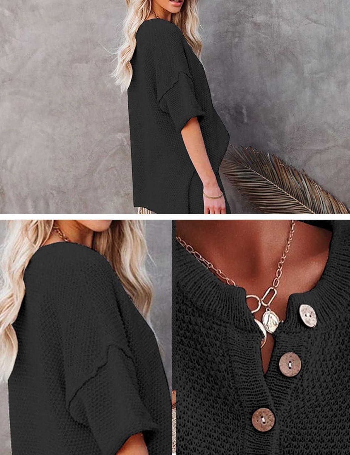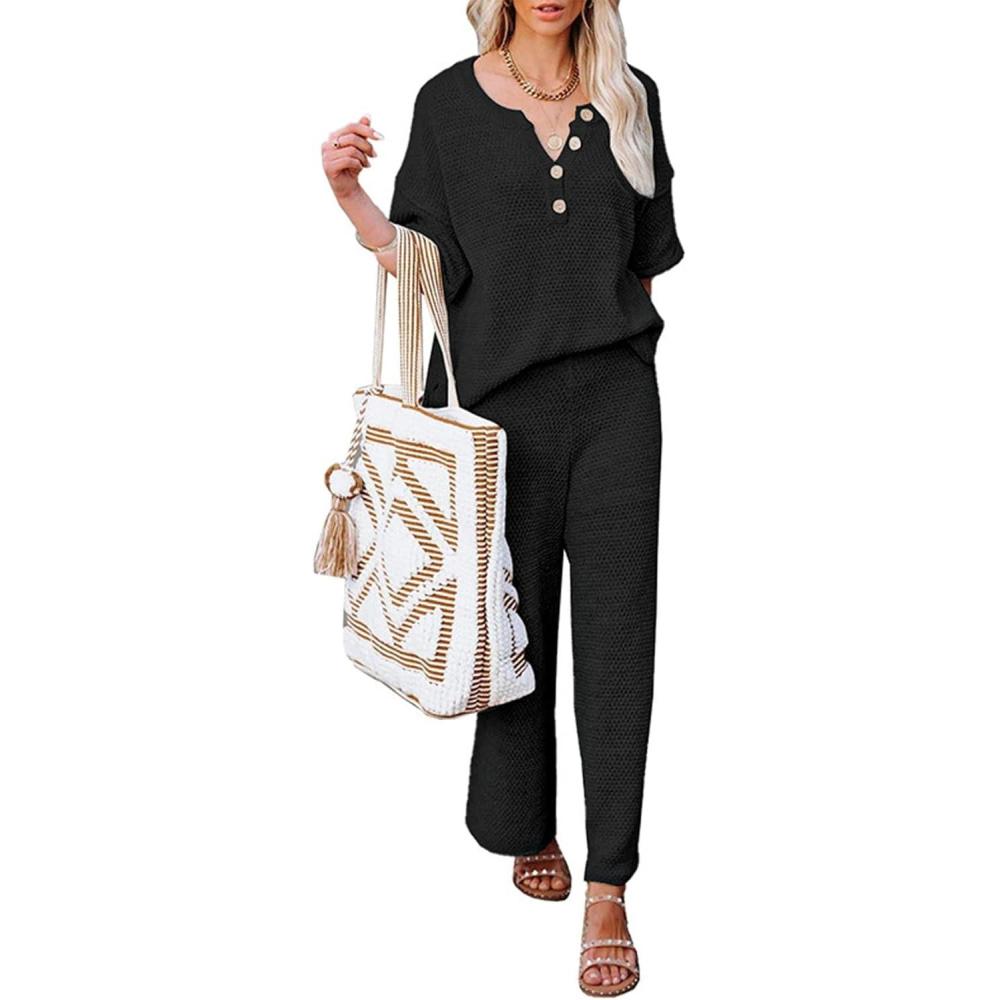 Women's 2 piece outfit set button knit pullover sweater top and wide leg pants sweatsuit is waffle kint, looks chic and special.